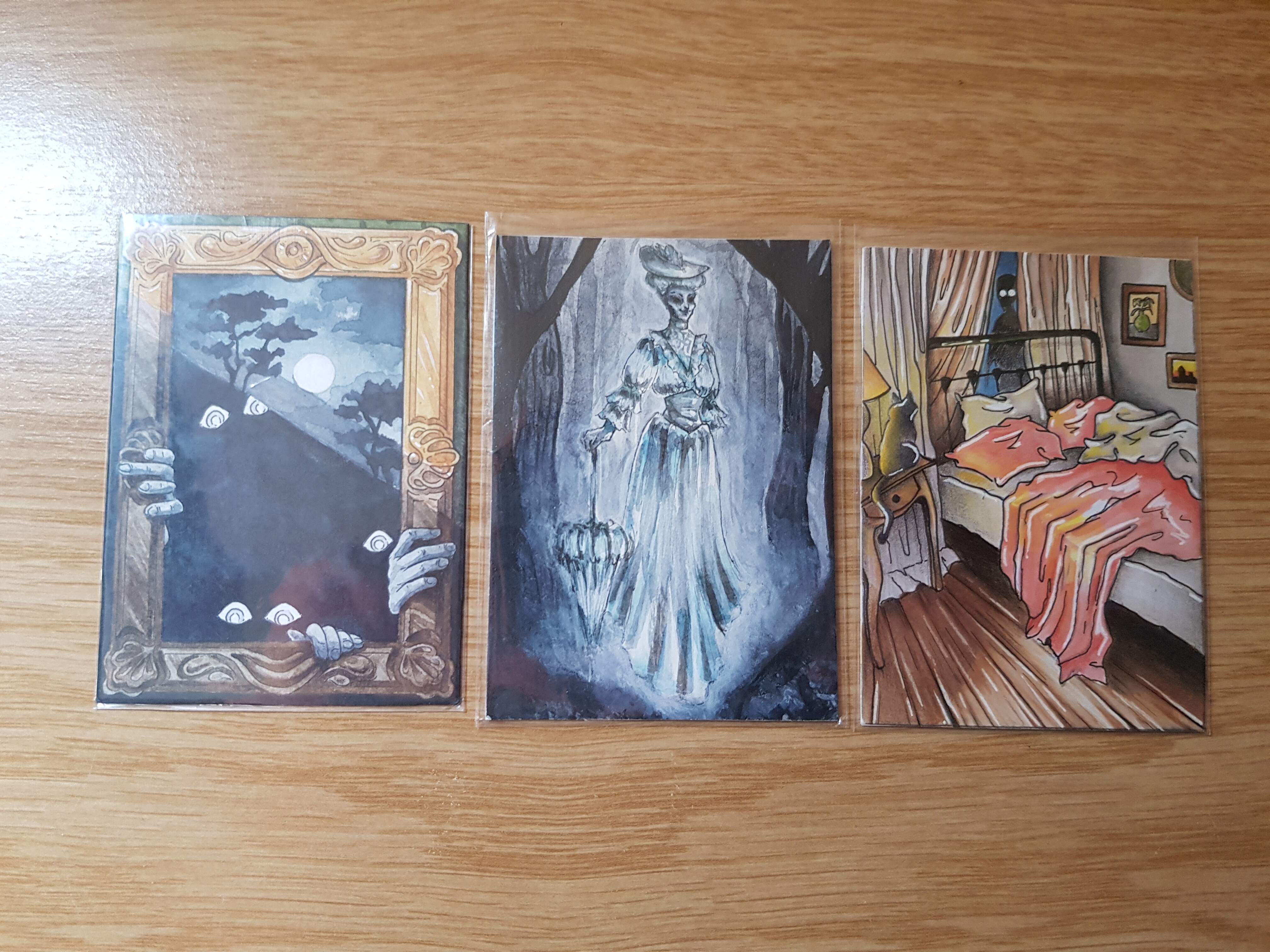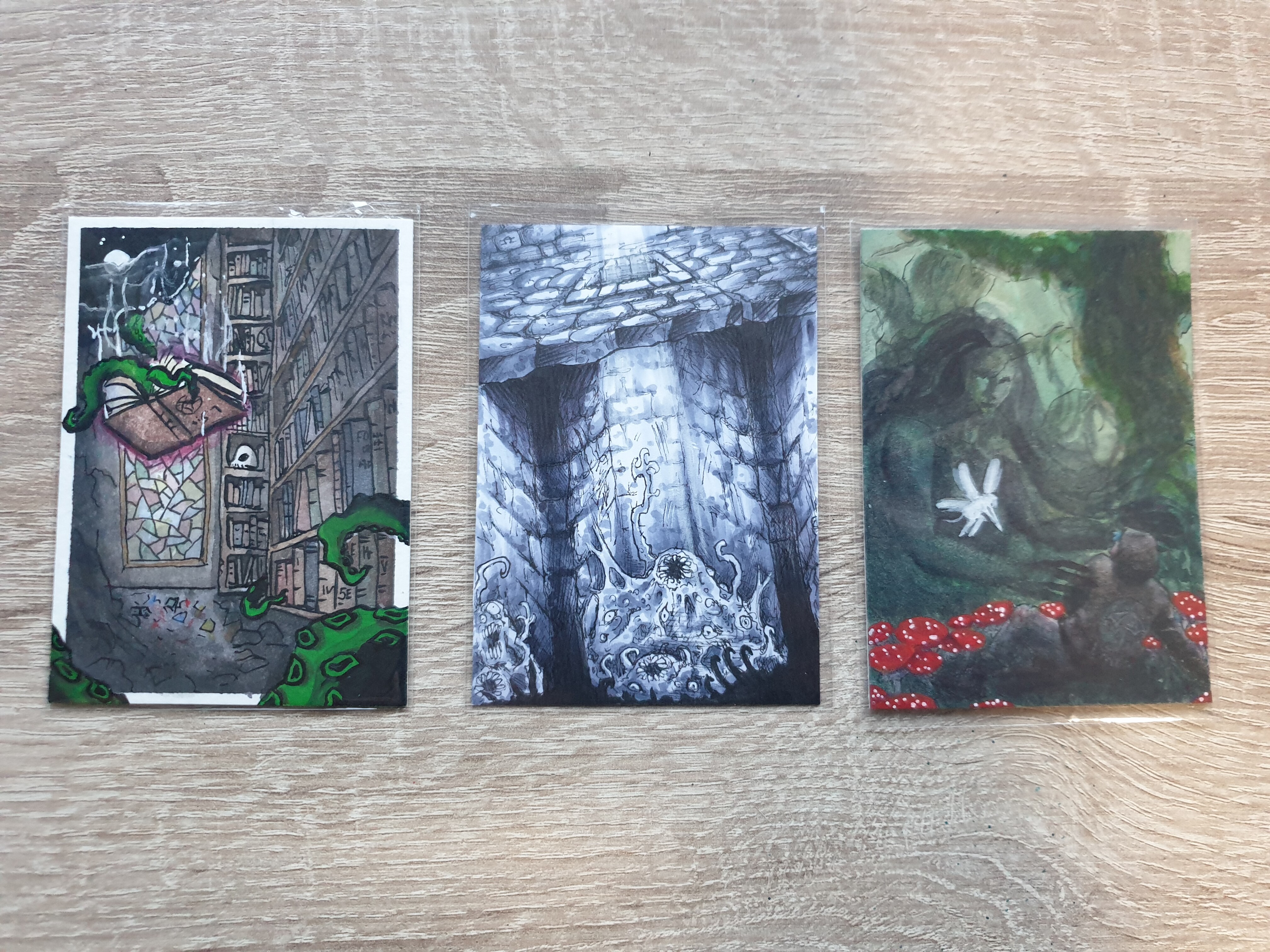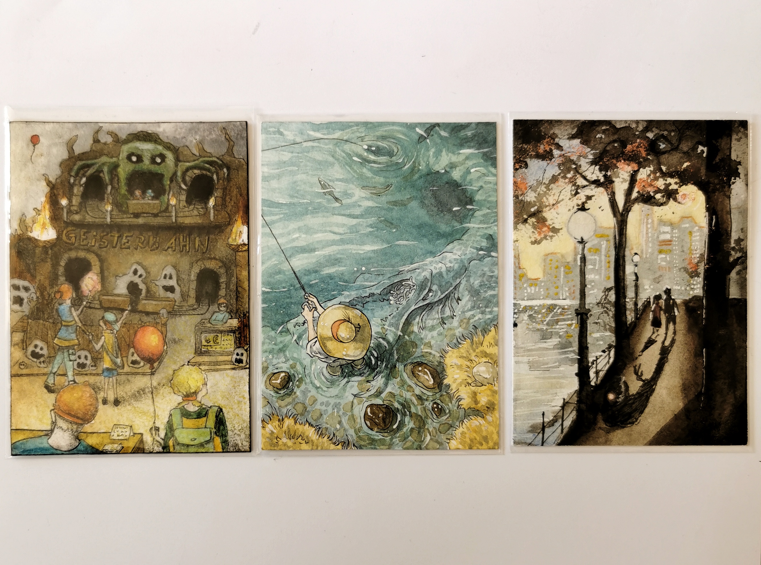 Eure Karten sind mega! In meinem Umschlag habe ich #244 “Lurking” von @MiseryInk, #3 “Warte… das sind keine Quallen!” von @SnowDay und #116 “IT’S HERE” VON @NadineHArtwork gefunden und ich bin begeistert von meiner Ausbeute!