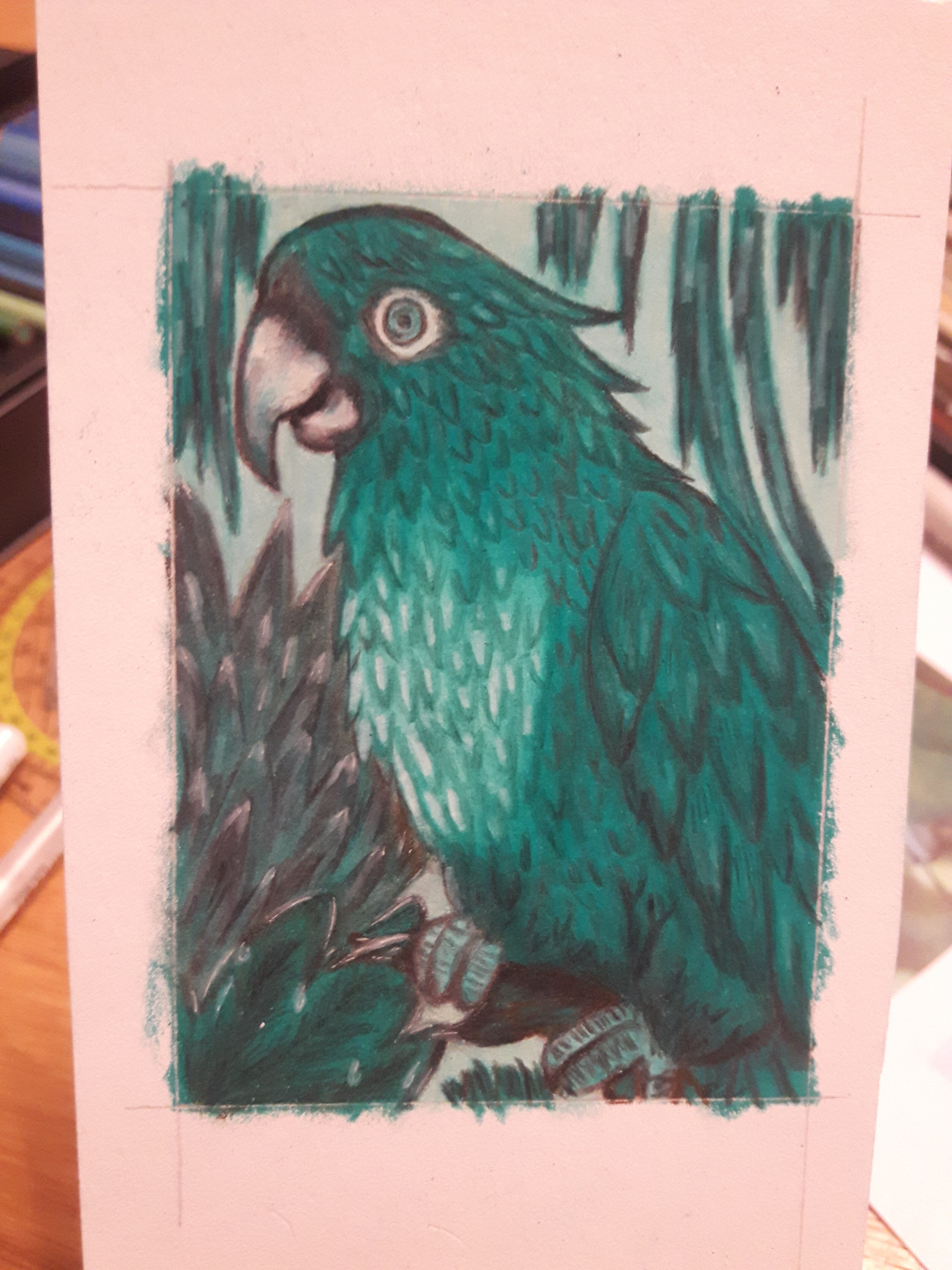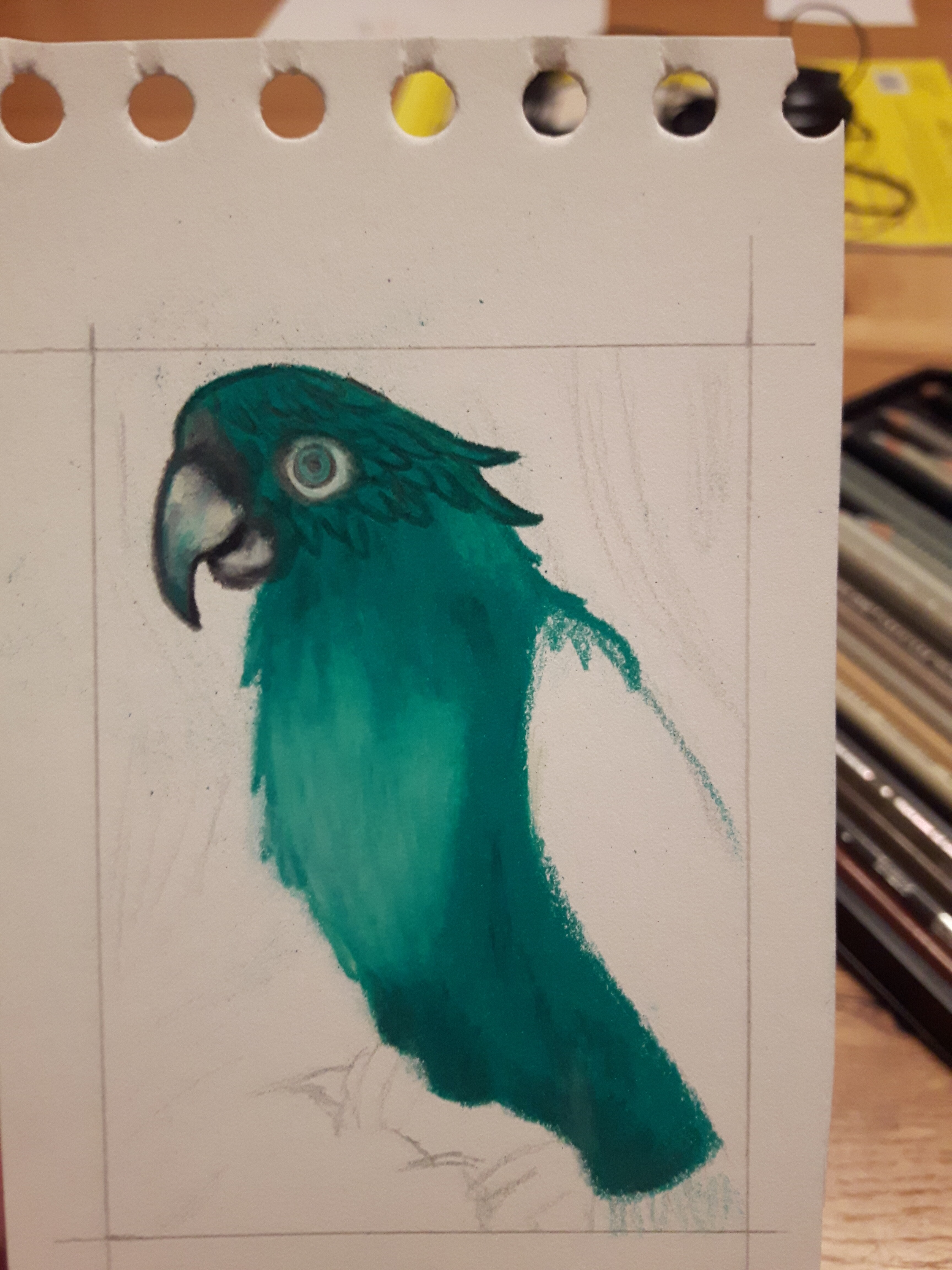Piepmatz wäre fertig. Oder soll ich noch was ändern? In Echt ist er ein wenig dunkler keine Ahnung was meine Deckenlampe da schon wieder für Scherze macht… Der HG ist eingefärbt mit einer Mischung aus dem Parrot Green und White Greenlight ^^
