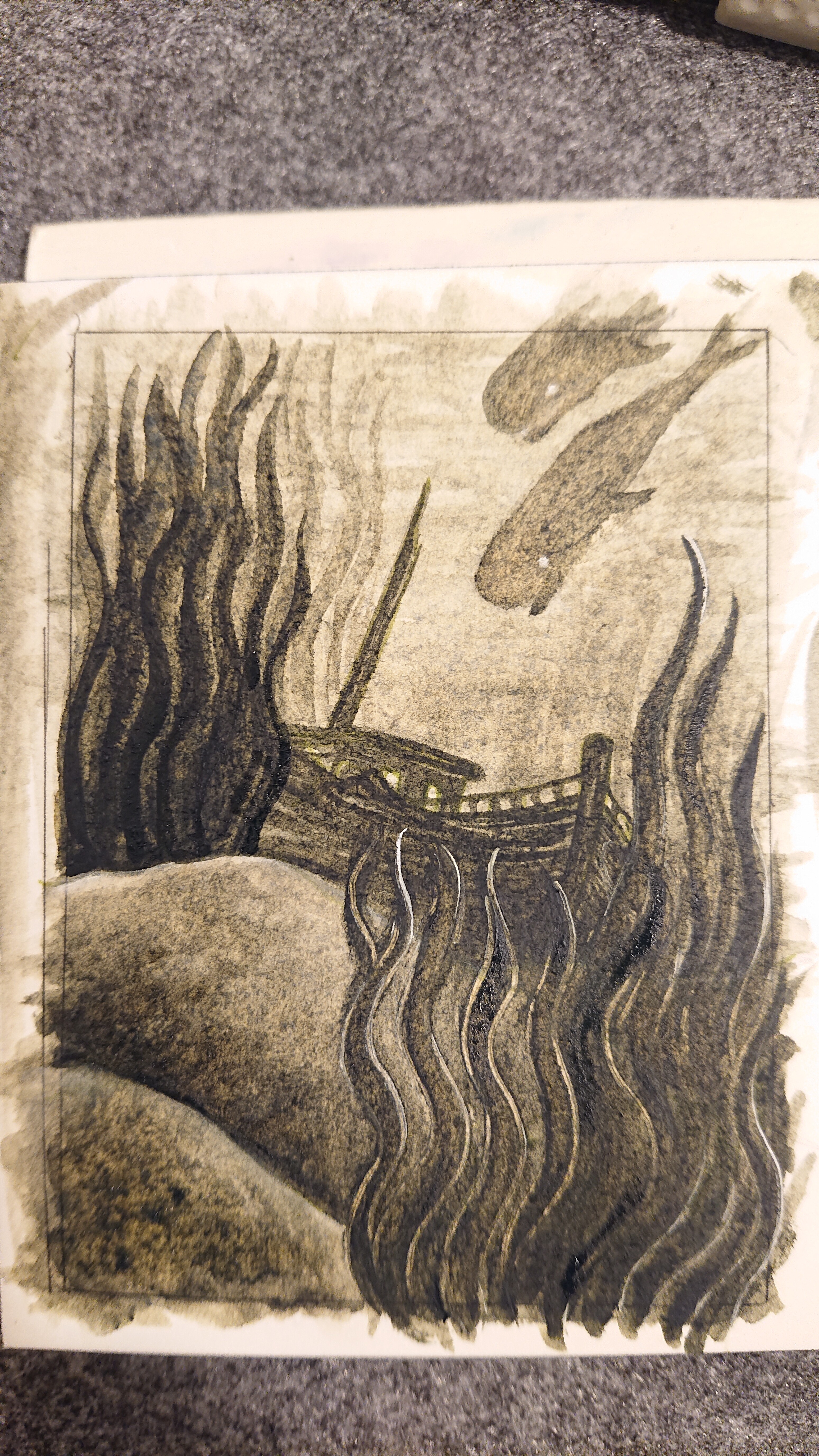 Karte Nummer vier, ganz spontan und ohne Referenzen. Undersea Green. Sieht auf dem Foto leider recht braun aus und glänzt teilweise, weil noch feucht.