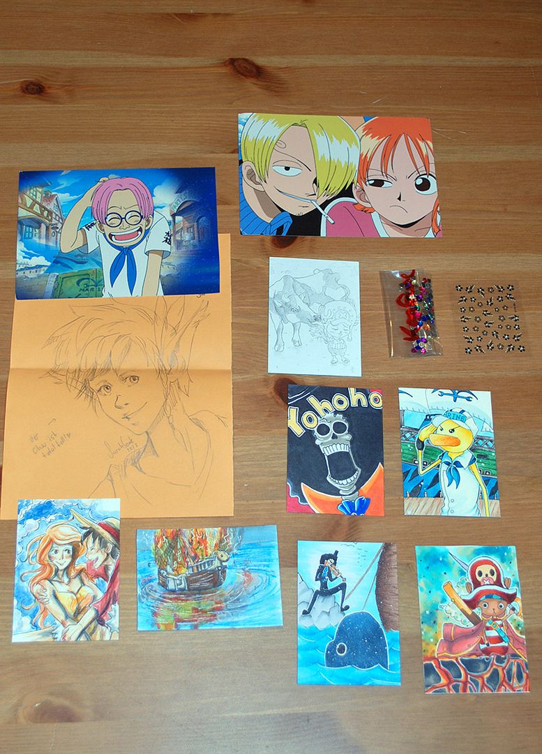 Und schließlich die ganzen Zusätze :D Hab ich gar nicht verdient… nicht zu sehen der Brook auf dem Brief von McFranky. Die großen Bilder sind Postkarten. XD Auserdem gab es Nagelsticker und Dekosteine :)