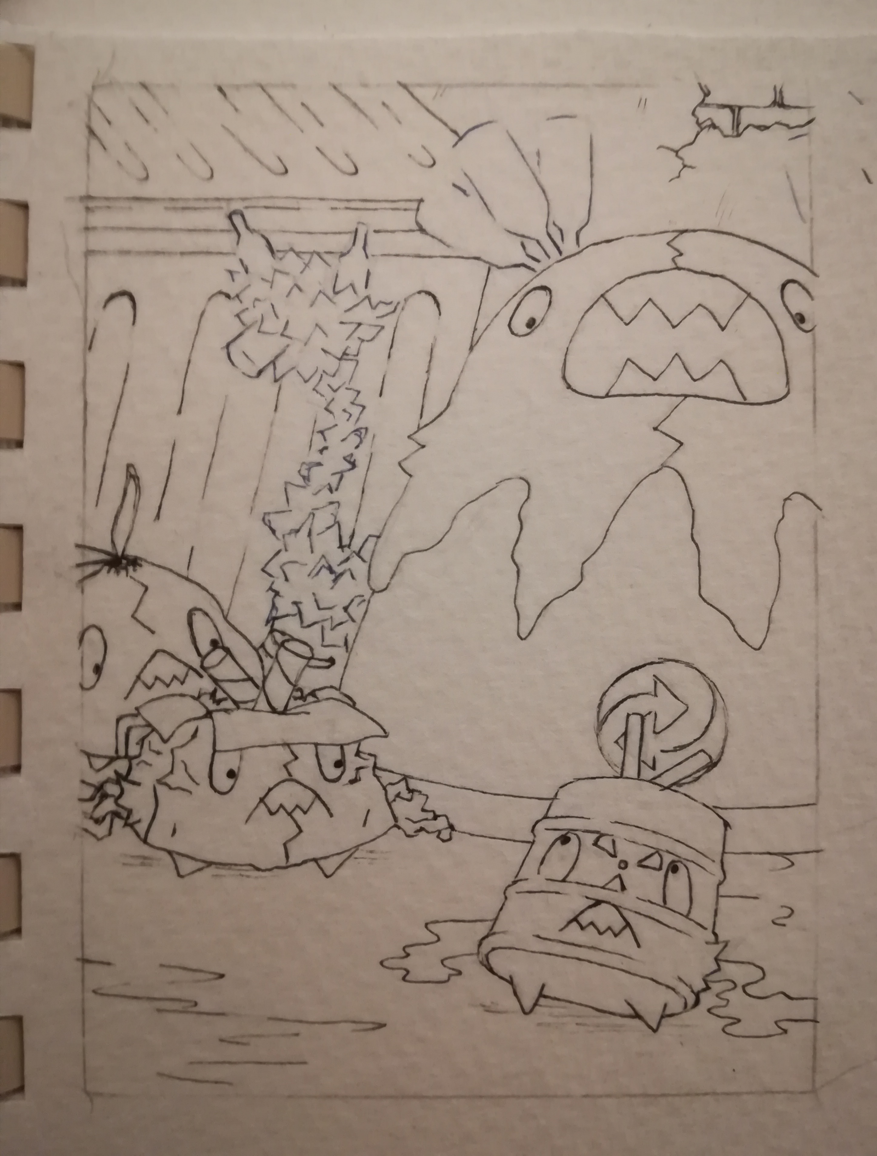 Bei der mittleren, Fusion aus Eguana und Banette, bin ich mir mit dem Hintergrund noch nicht ganz sicher. Ich möchte aber was Richtung Gewitter mit Blitzen zeichnen, evtl. mit ein paar Strommasten und Landschaft.