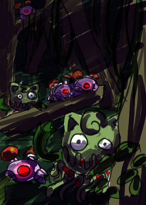 Oder eine überwucherte Ruine oder so mit diesem Ding (ich liebe die leuchtend roten Augen! xD) und eventuell Vor-Entwicklungen: