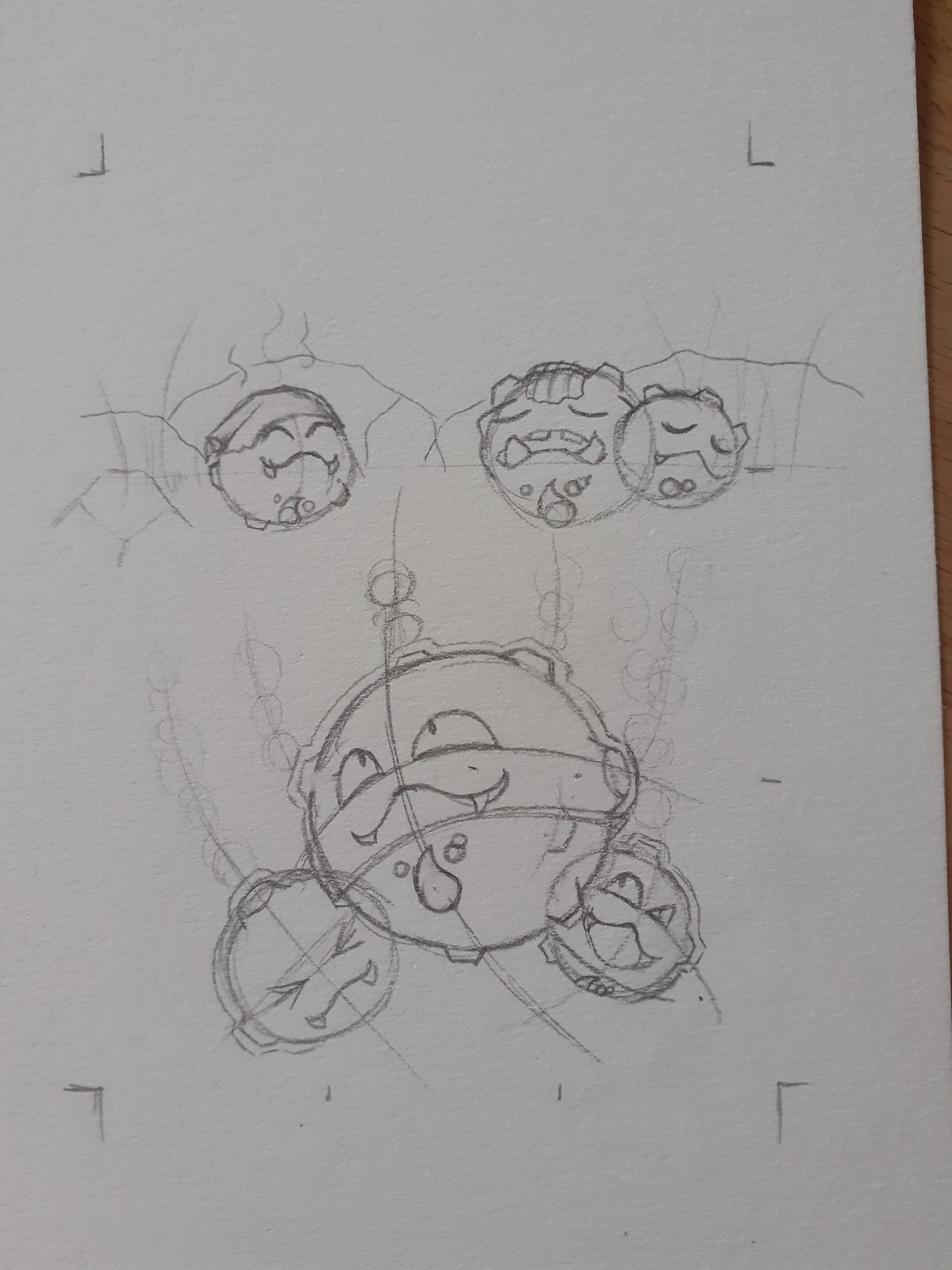Hier wäre die Skizze zu meiner dritten Karte :) Mehrere Wassersmogons :) Ich hoffe die Karte ist so in Ordnung. Man sieht mehrere Smogons beim Relaxen in einer heißen Quelle. Ein paar Smogons scheinen aber auch Ärger aus zu sein ;)