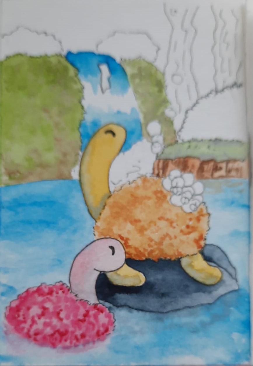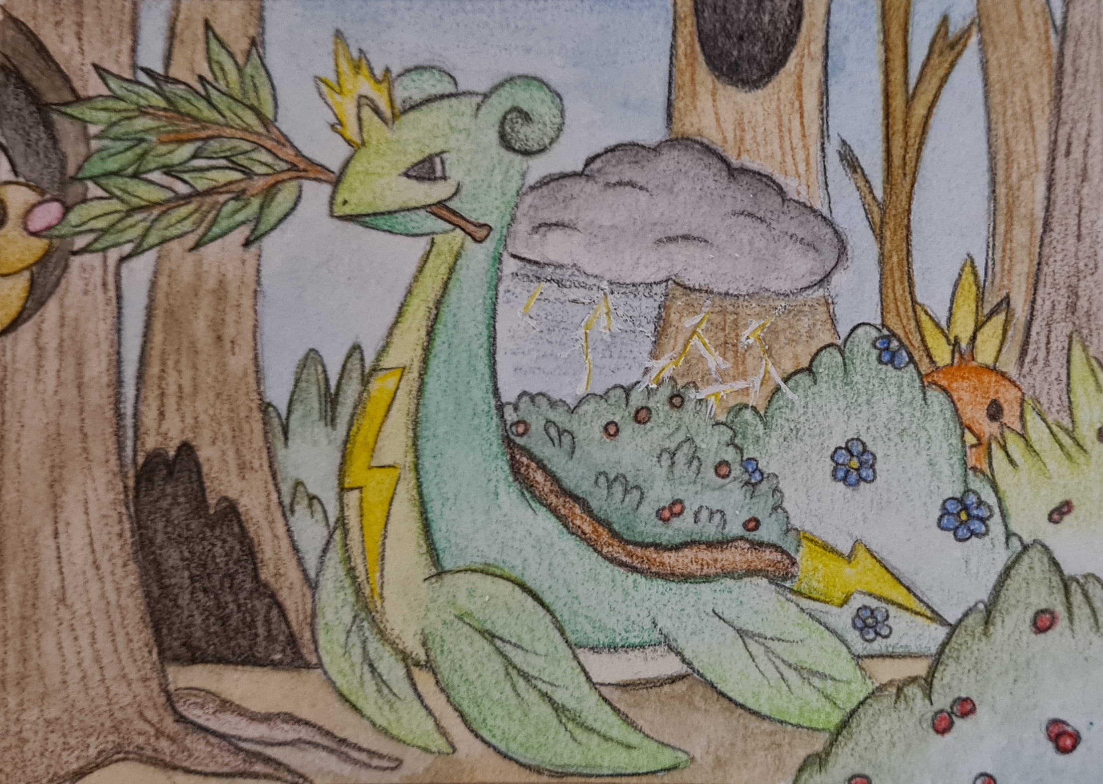 Das friedliebende Pokemon Lapras lässt die Pflanzen mit wasser gedeihen, in dem es kleine gewitter über seinem Panzer beschwört die es nach belieben verstärken kann um ein grösseres umfeld zu bewässern.