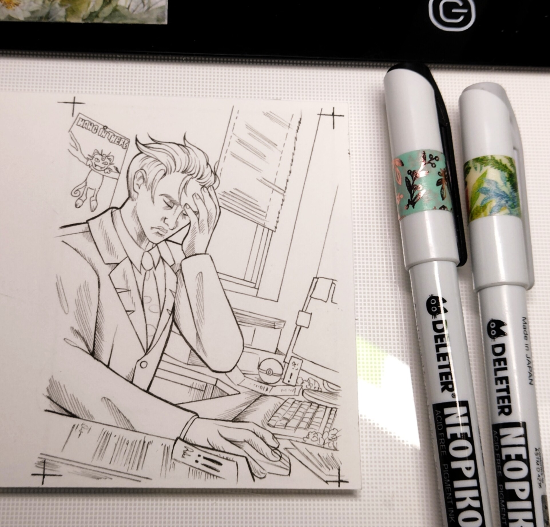 Ich habe jetzt angefangen, mich an die Lines meiner Karten zu setzen. Hier ist schon mal Larry/Aoki, wie stets rettungslos überarbeitet im Büro (mit einem speziell auf ihn angepassten Meme-Motivationsposter im Hintergrund xD).