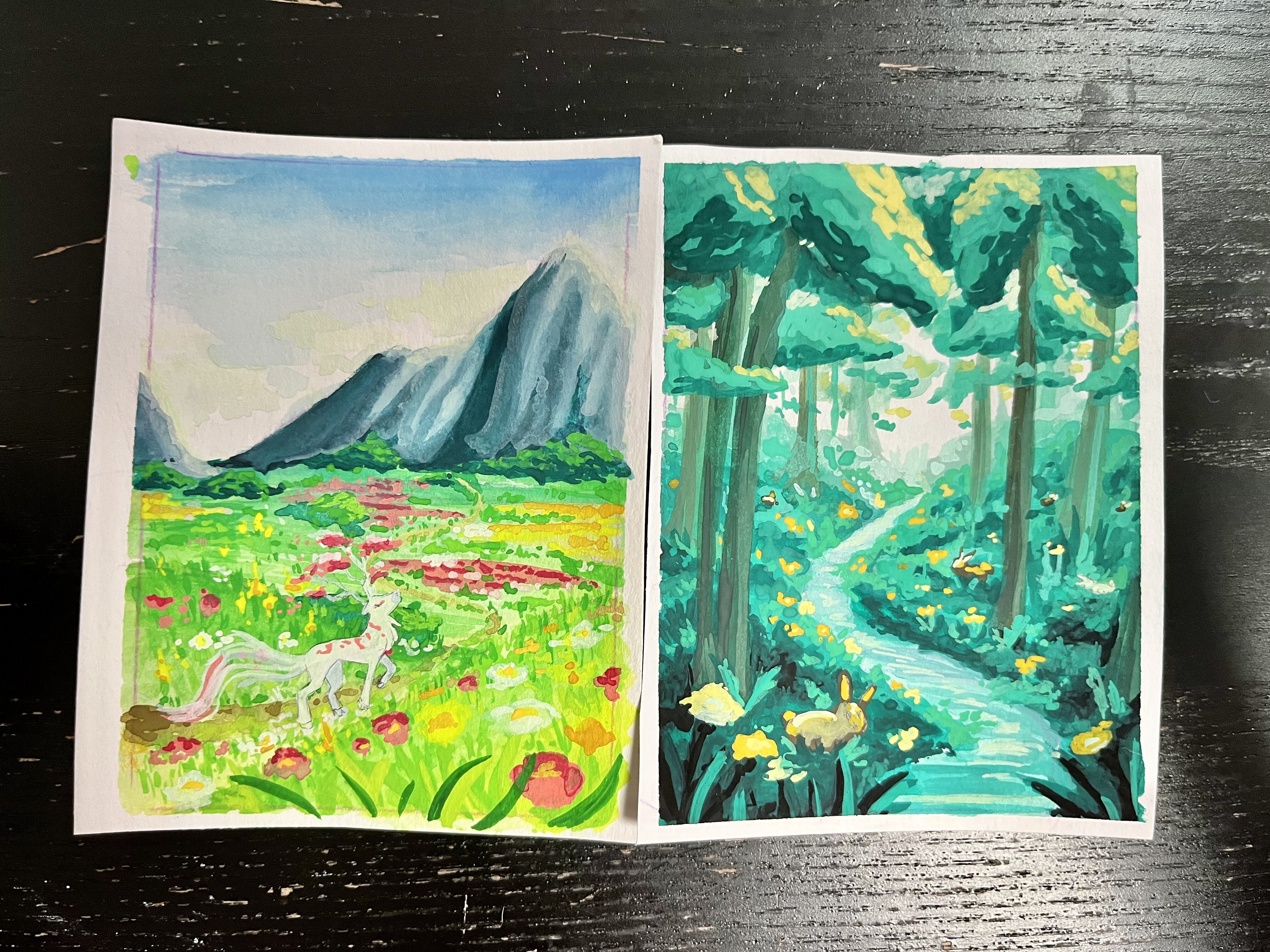 Das rechte sieht noch ziemlich busy aus, weil du in sämtlichen Ebenen ungefähr das gleiche Detaillevel anwendest, und dadurch geht ein bisschen die Tiefenwirkung flöten. Wenn du im Hintergrund etwas verwaschener wirst und bei den vordersten Bäumen und Gräsern noch feiner/detaillierter arbeitest, kriegst du diesen Tiefeneffekt, den du da (denke ich mal) erzielen wolltest. Und ist das ein Weg oder ein Fluss? Aktuell kann ich es nicht 100%ig sagen, sorry. Wenn’s n Weg ist, würde ich im Vordergrund noch ein paar Steinchen oder so andeuten, wenn es ein Fluss ist, vielleicht Reflektionen?