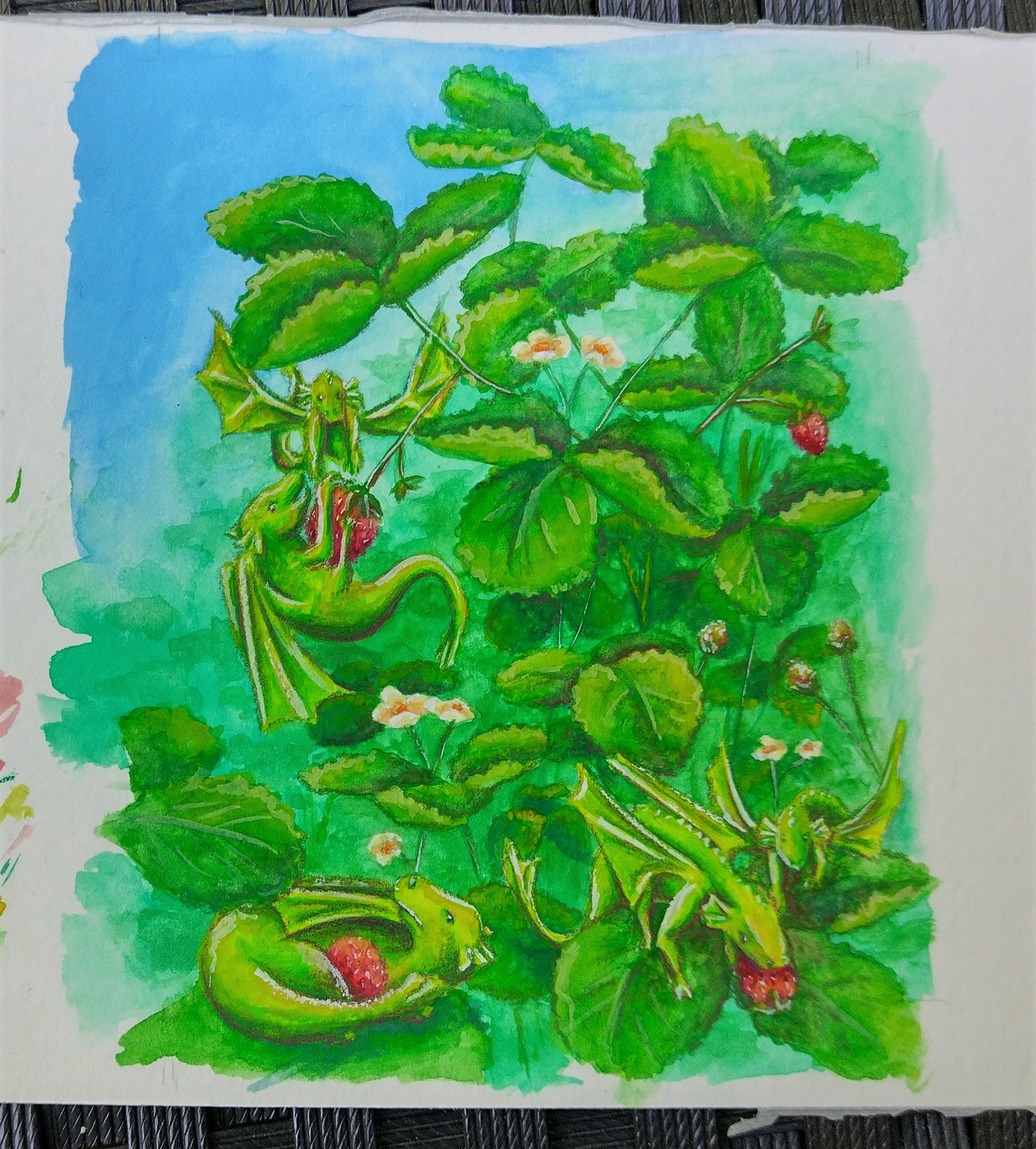 Die Idee: Kleine Minidrachen fallen über kleine Erdbeeren her. Die Idee kam mir beim Blick auf die Monatserdbeeren auf unserem Balkon, die ständig von verschiedensten Tieren geräubert werden.