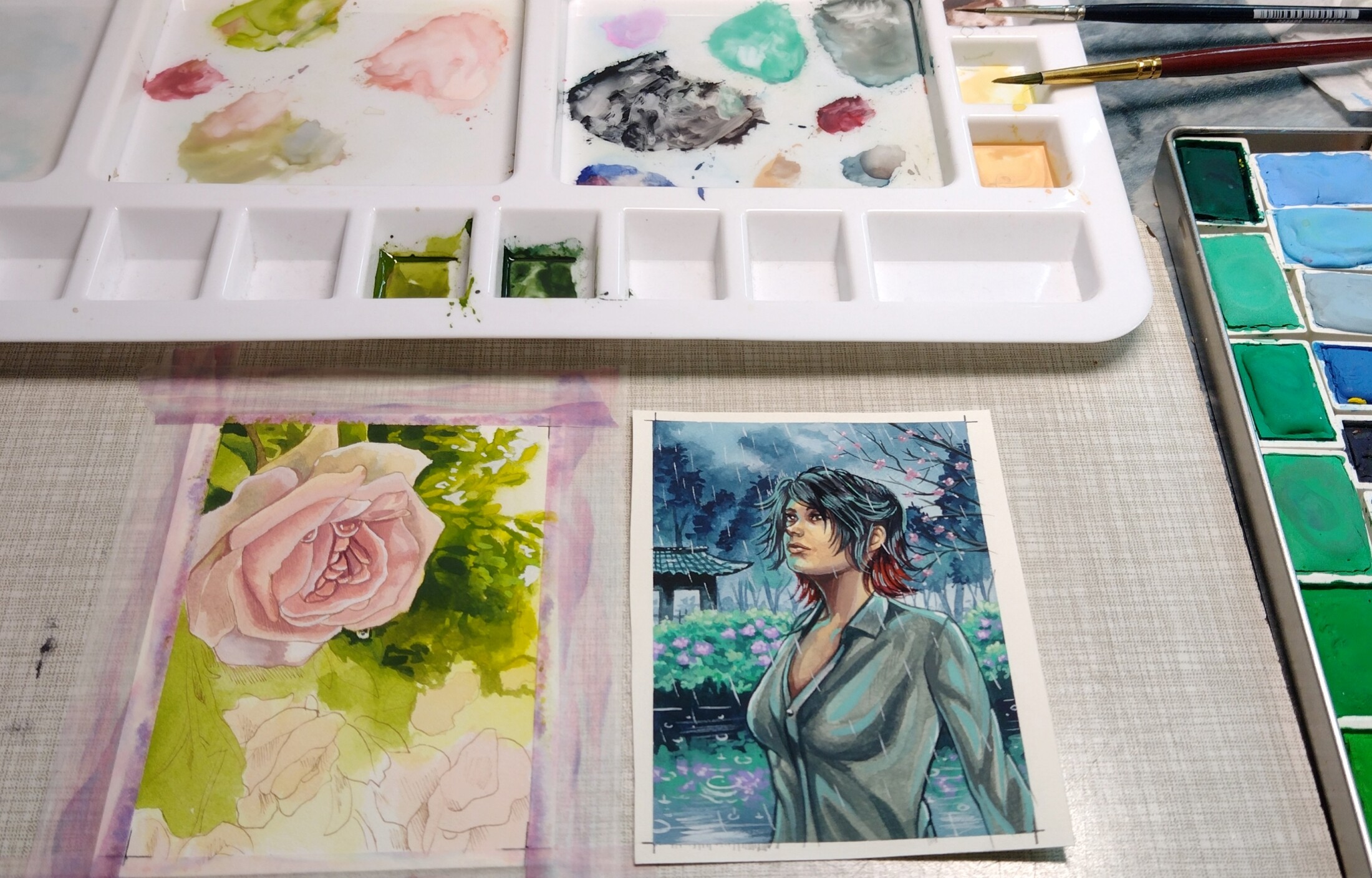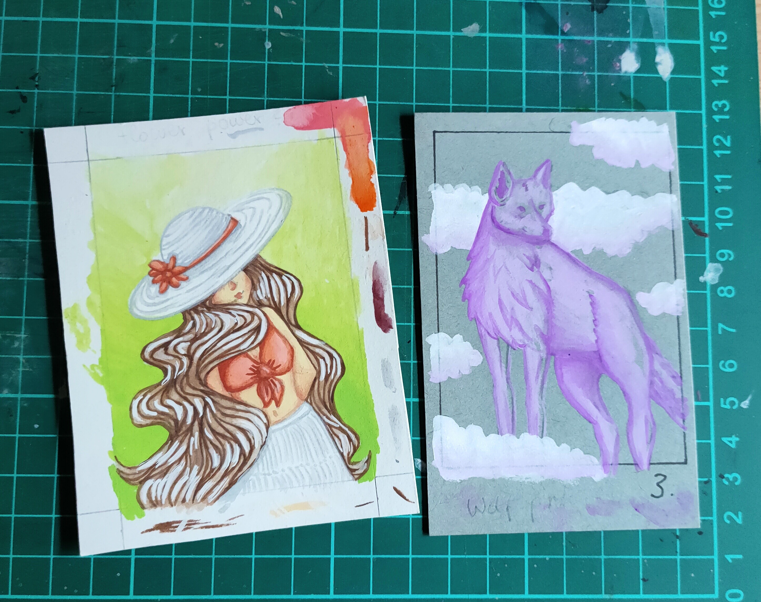 Meine erste Karte ist jetzt im übrigen auch fertig - sie muss nur noch zugeschnitten und verstärkt werden. Kärtchen Nummer zwei ist auch schon in Arbeit. Ich habe die letzten paar Wochen dank des “World Watercolor Months” florale Motive geübt und da dachte ich mir so “wieso sowas nicht mal im Kakaoformat in Postercolor probieren?”. Hier mal ein kleiner Zwischenstand - ich hoffe das Motiv findet ebenfalls anklang.