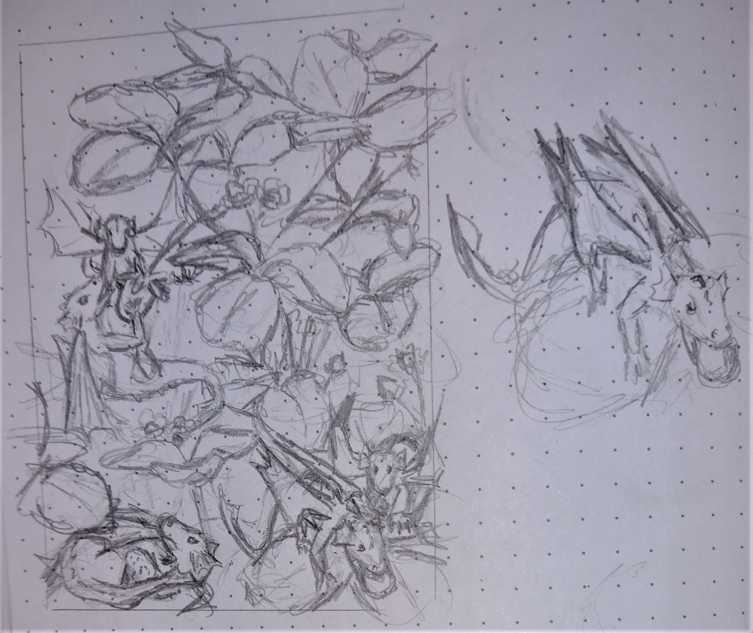 Die Szene ist in der kleinen Kritzelei unten links zusammengesetzt, die Drachen rundherum sind Versuche zu den Körperhaltungen.