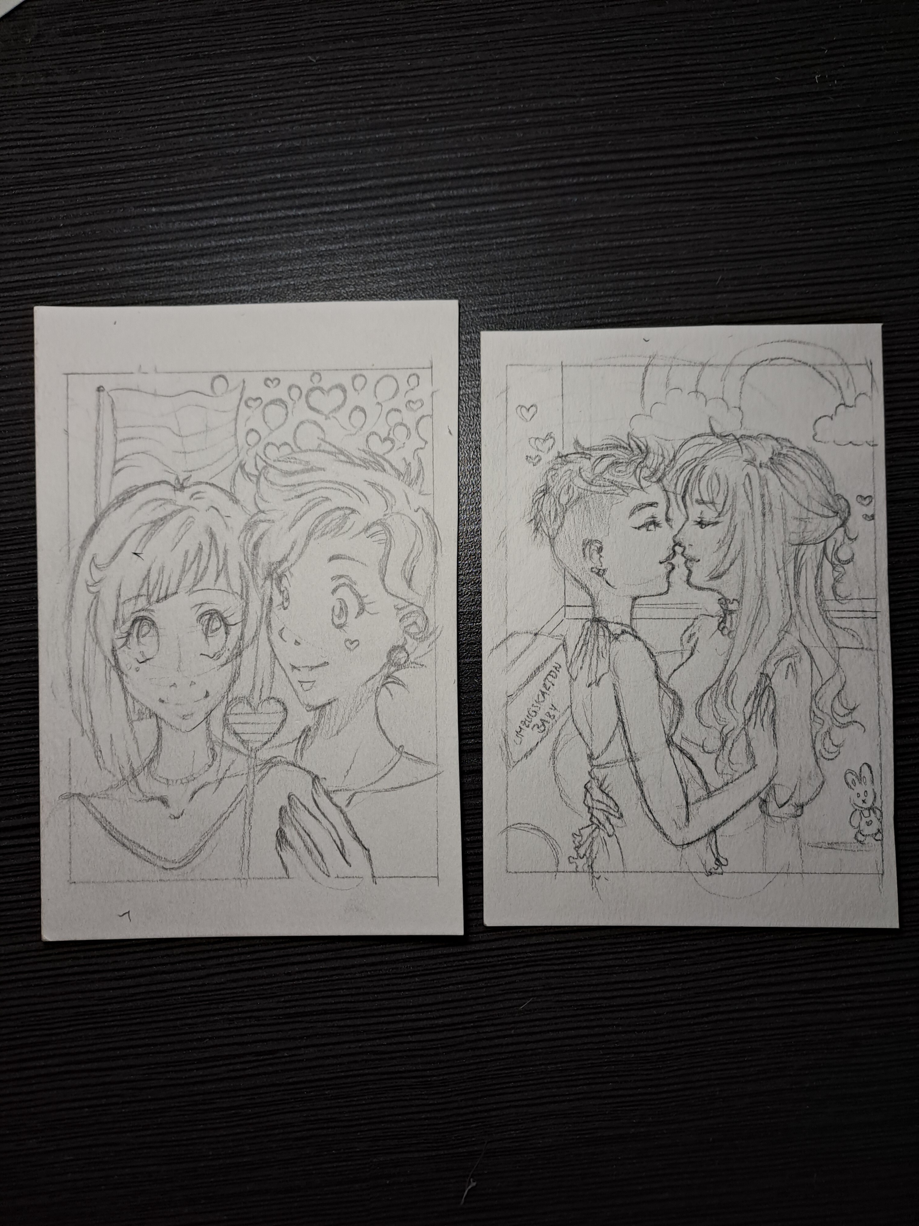 Bei der linken Karte könntest du es noch ein wenig offensichtlicher machen, dass es ein CSD sein soll. Kannst ja vielleicht noch ein dazu wenig recherchieren/dir ein paar Bilder dazu anschauen, um ein bisschen Inspiration zu bekommen, wie es da so ist. Eventuell würde es auch helfen, die Personen etwas kleiner zu machen, damit du mehr Platz hast, um mehr von der Szene darzustellen, weil der Hintergrund aktuell noch nicht so richtig CSD rüberbringt.