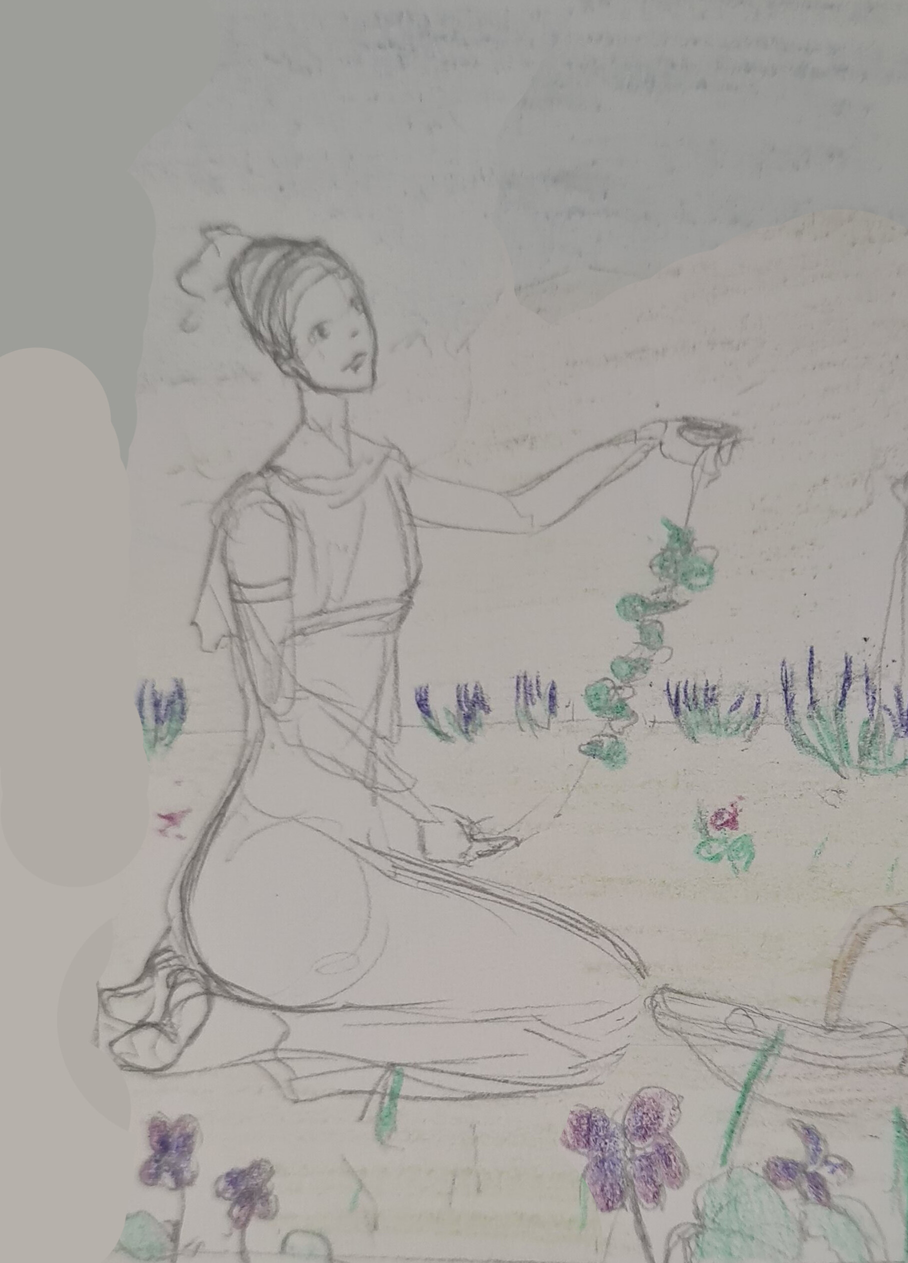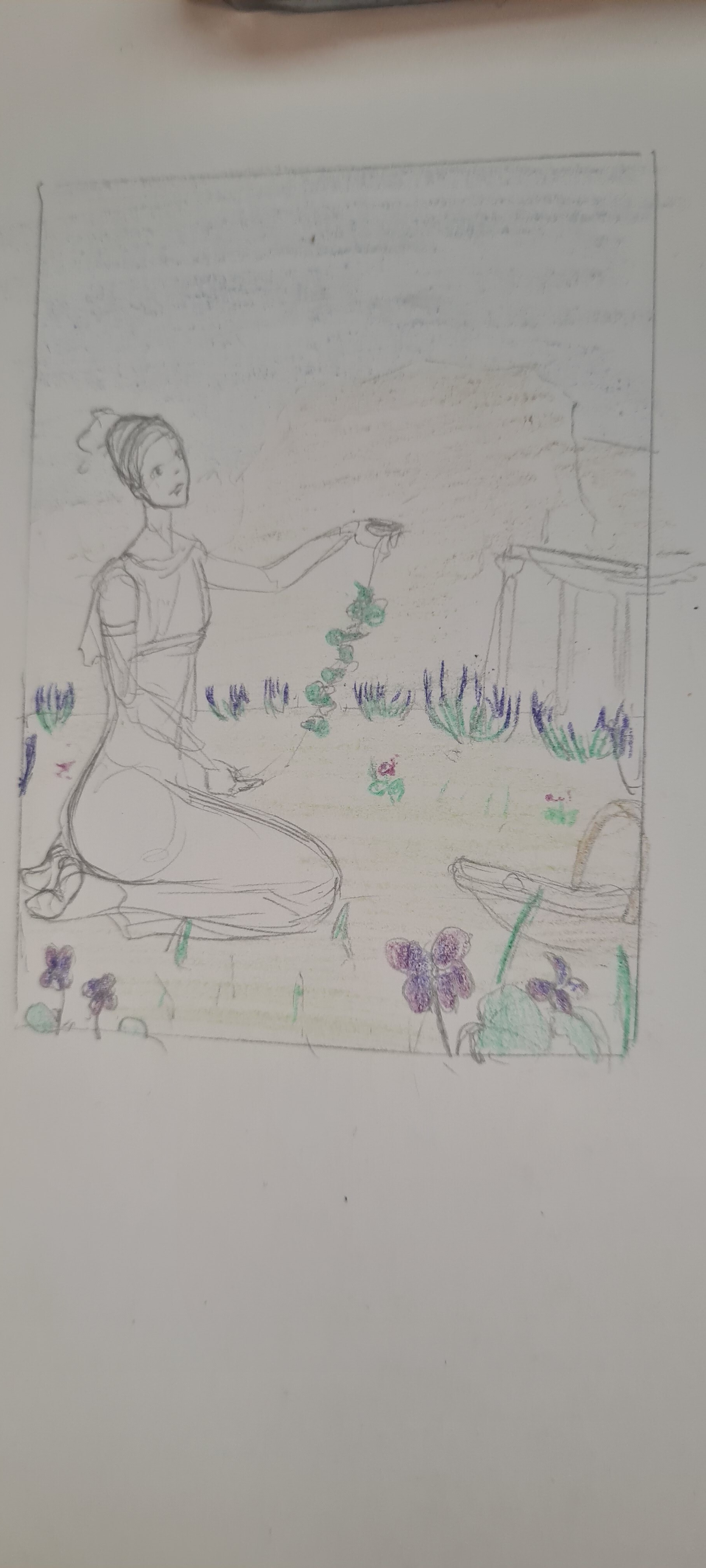 Ich hab mal eine erste Idee skizziert. Zu sehen sein soll dann nachher eine (antik) griechische Frau sein, die eine Girlande / Kette mit Brokkolie macht, während sie in einem Feld umgeben von Veilchen und Lavendel sitzt.
