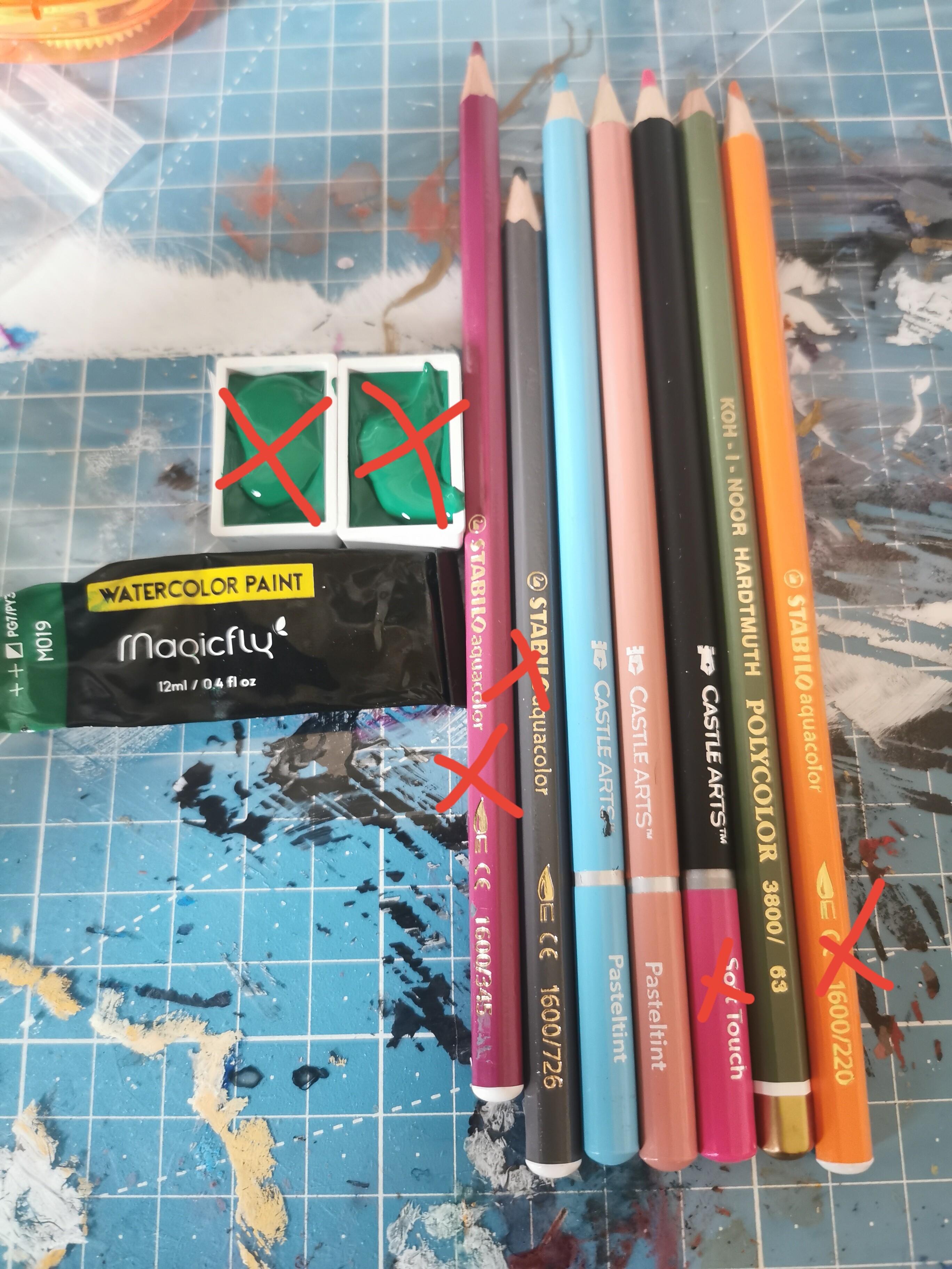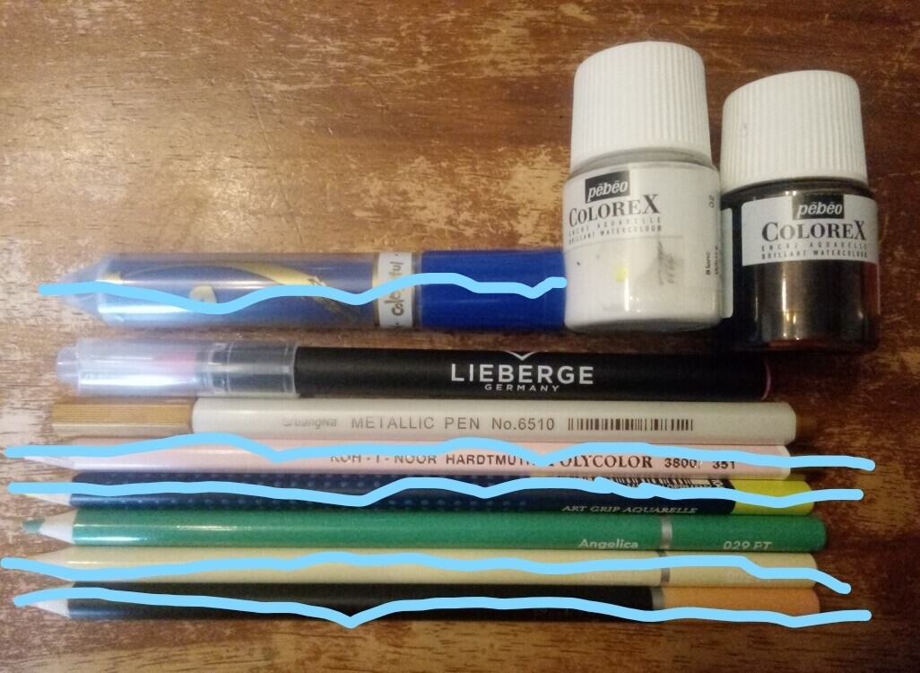 (2xColorex Aquarell in weiß und Orange Mars, blauer Wachsmal-Stift? (vergeben), Lieberge Germany, Metallic Pen gold, Faber-Castell Aquarell (vergeben), Koh-I-Noor Polycolor (vergeben), Castle Arts 1 x Soft Touch (vergeben) & 2 x Pasteltint (1 x vergeben, Angelica, der grünfarbene noch da)