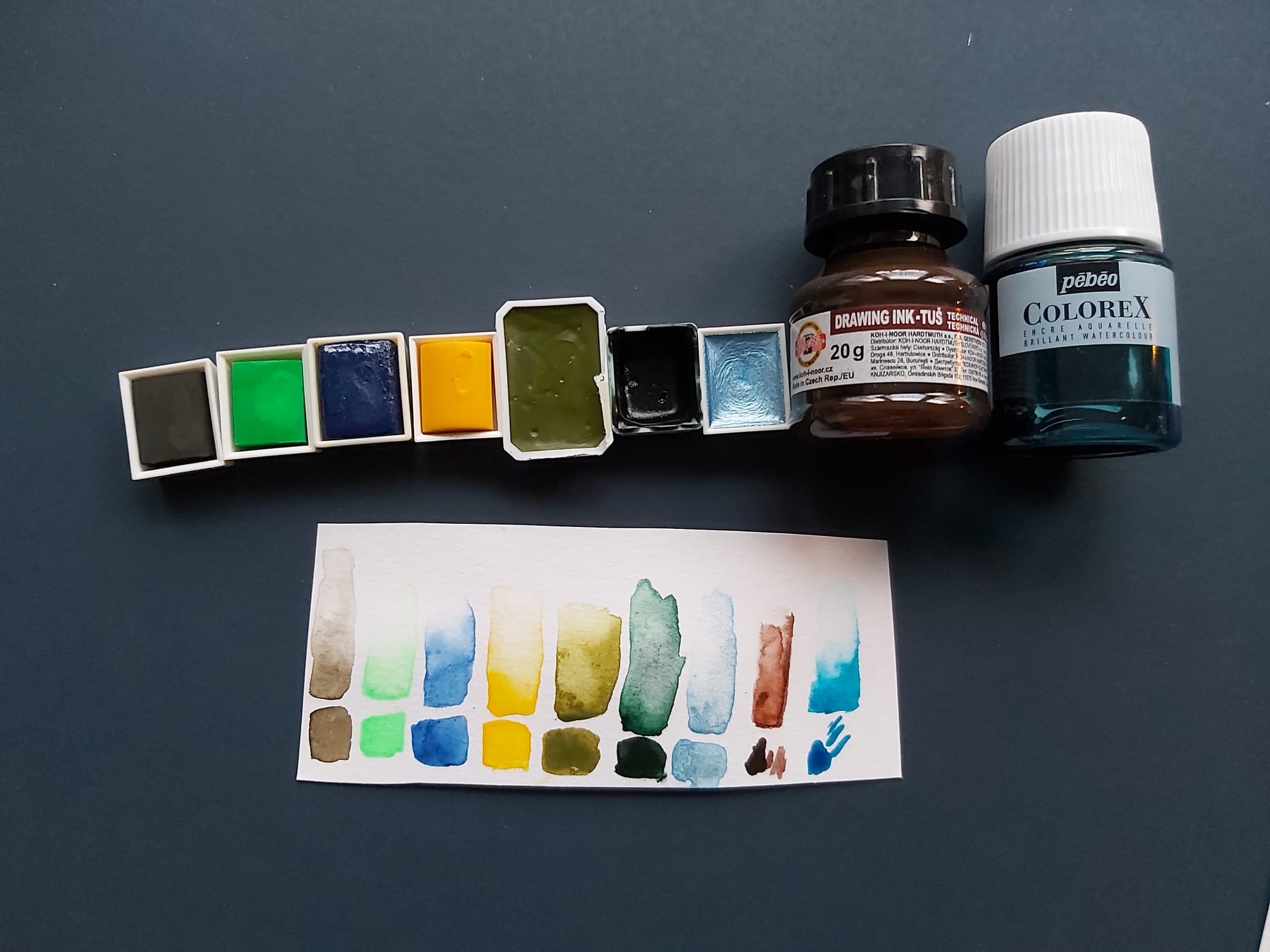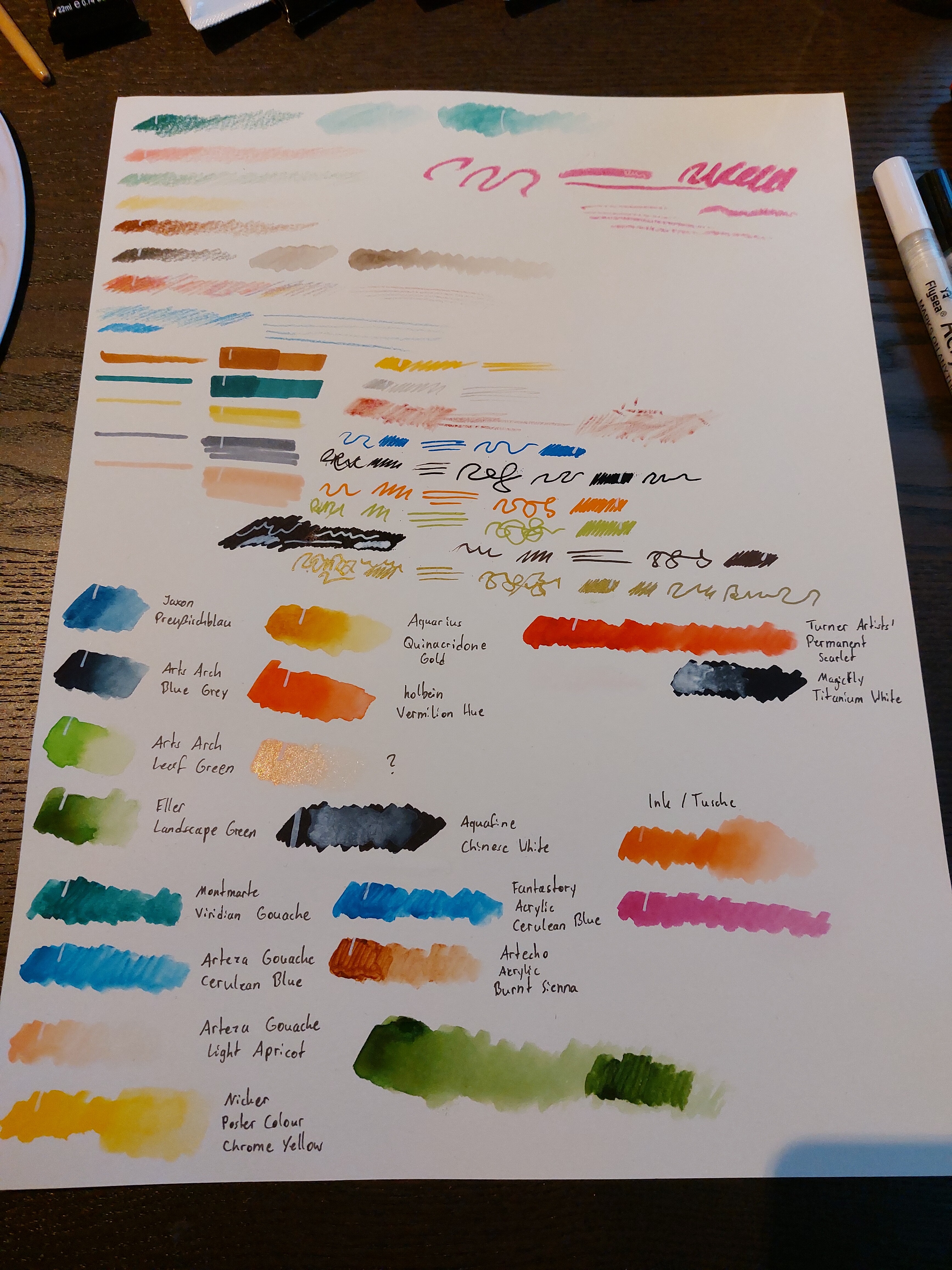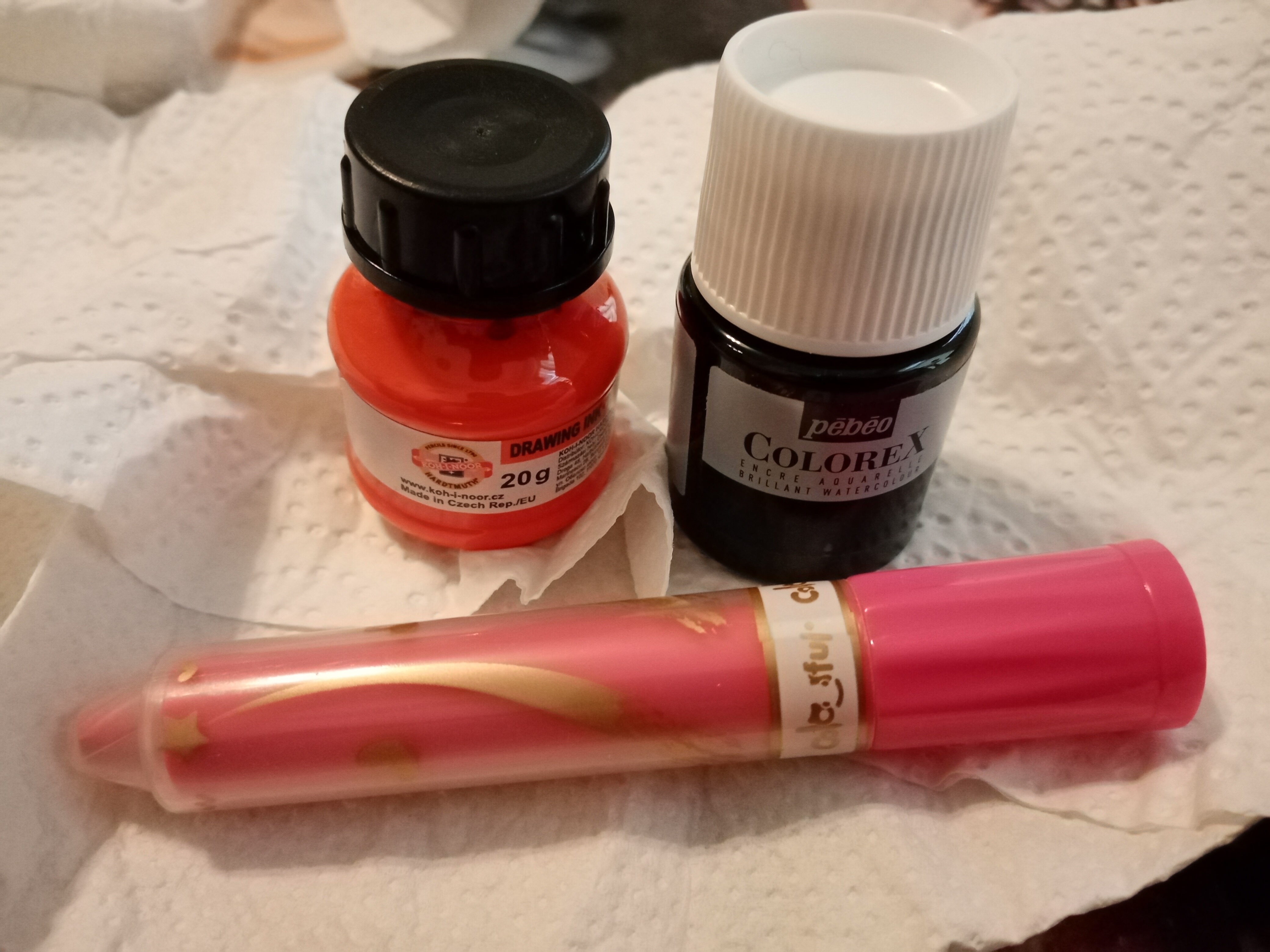 Die Tube Poster Colour, die Tusche und dieser… Wachsmalstift? sind mir bisher vollkommen neu. Das hatte ich noch nie. Ach ja und mit Aquarellfarben direkt aus der Tube hab ich bisher auch noch nicht gearbeitet.