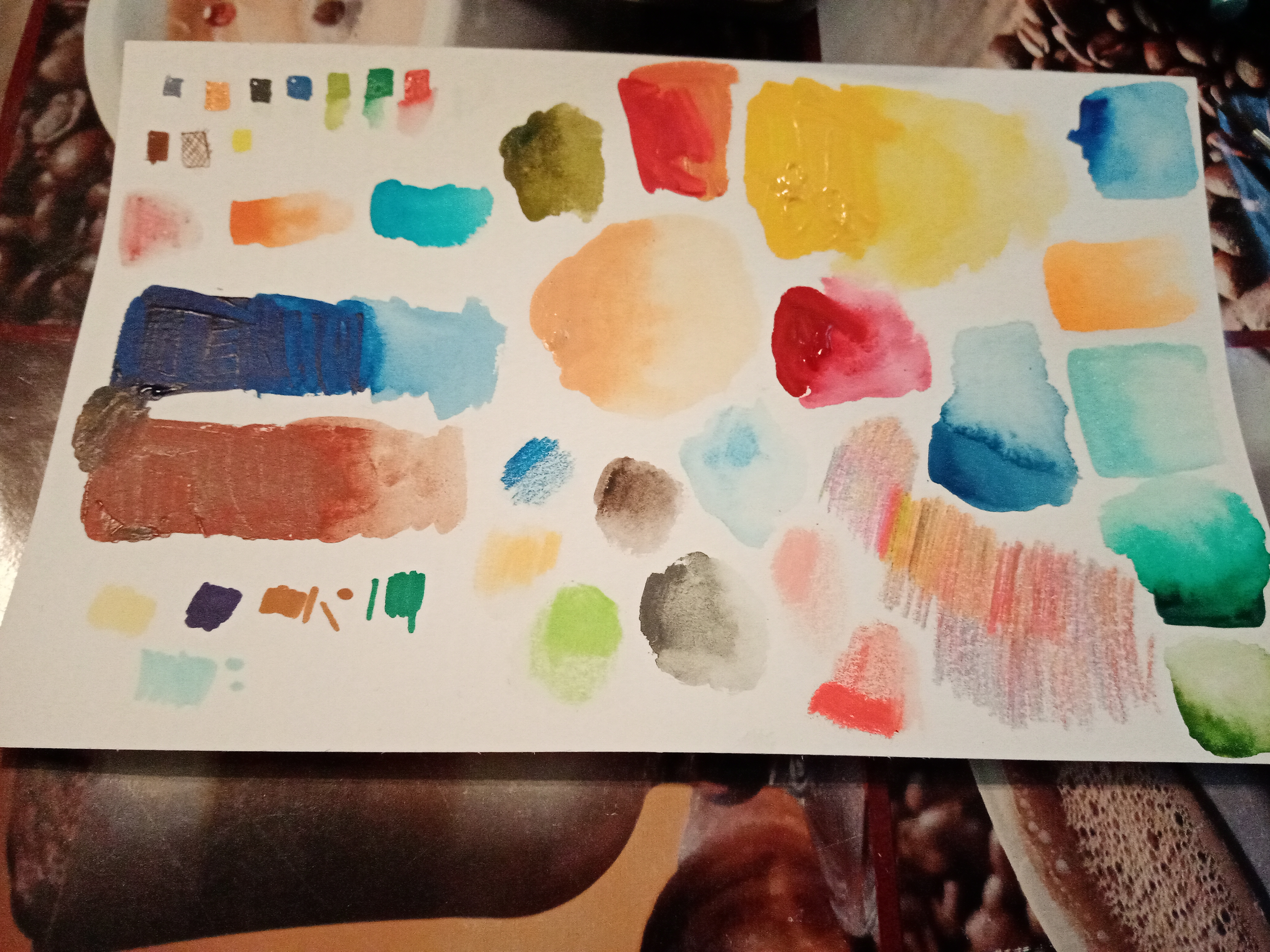 Übrigens sollten sich die Aquarellfarben aus den Näpfen problemlos mit deiner roten Gouache kombinieren lassen, dann kriegst du auch (gedämpfte) Violetttöne ermischt.