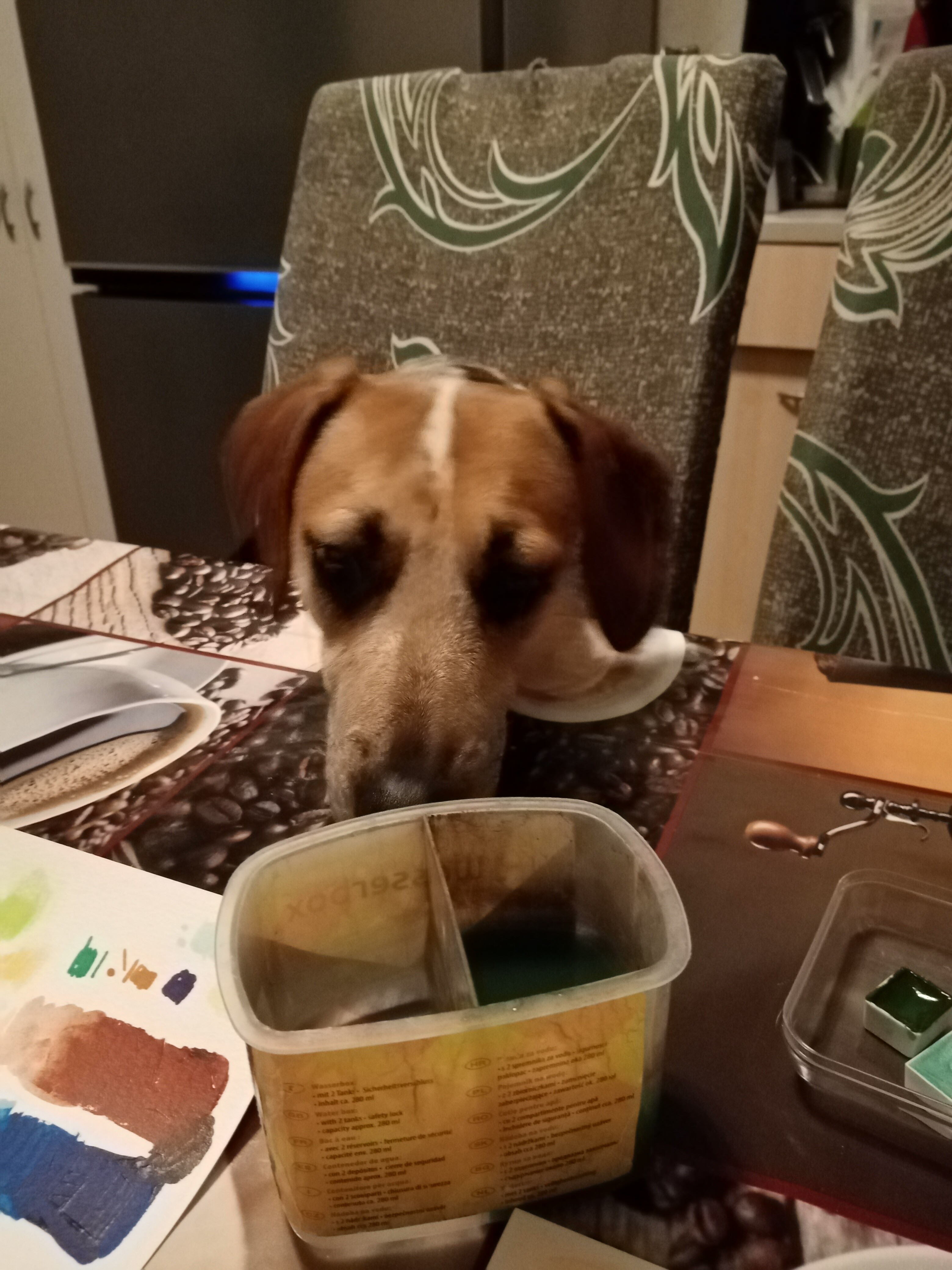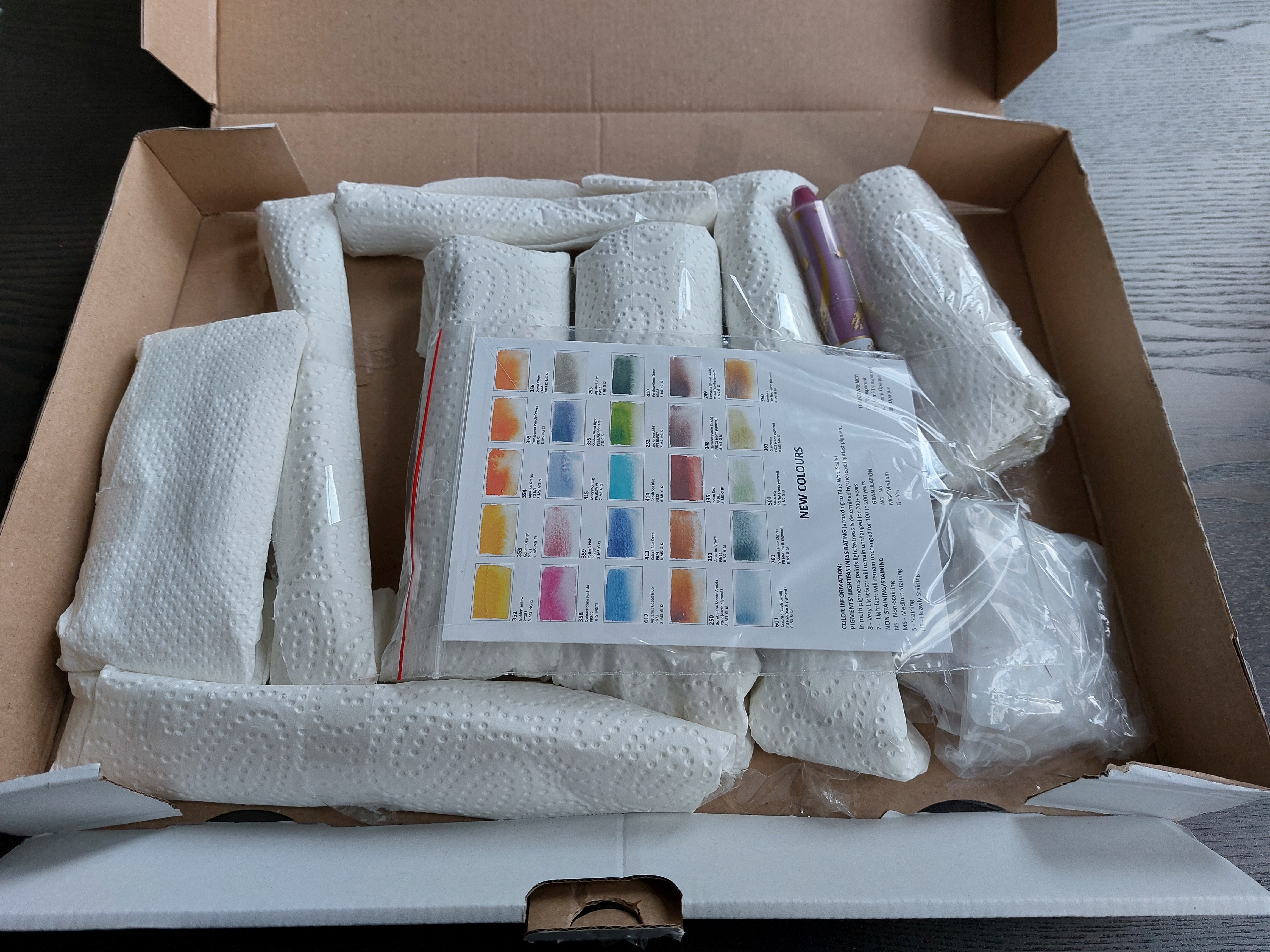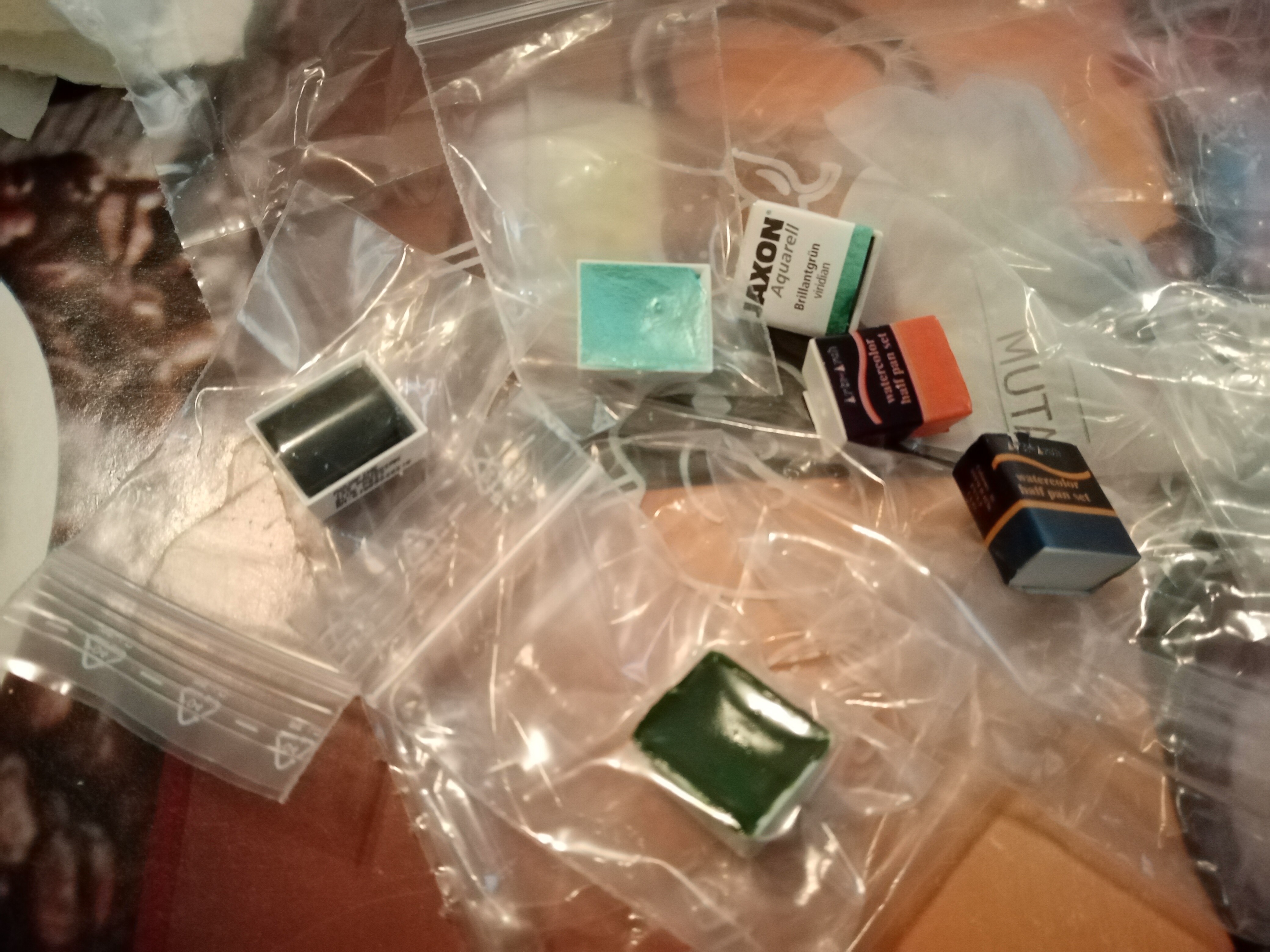 - zuerst wickelte ich das Päkchen aus, welches Cookie klauen wollte und fand sechs Halbnäpfchen Aquarellfarbe <3