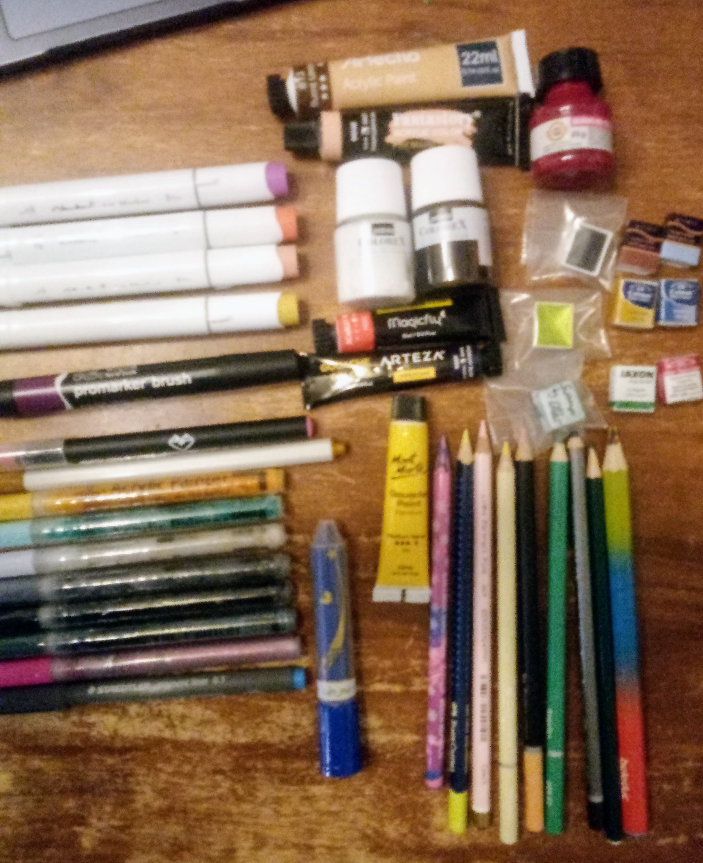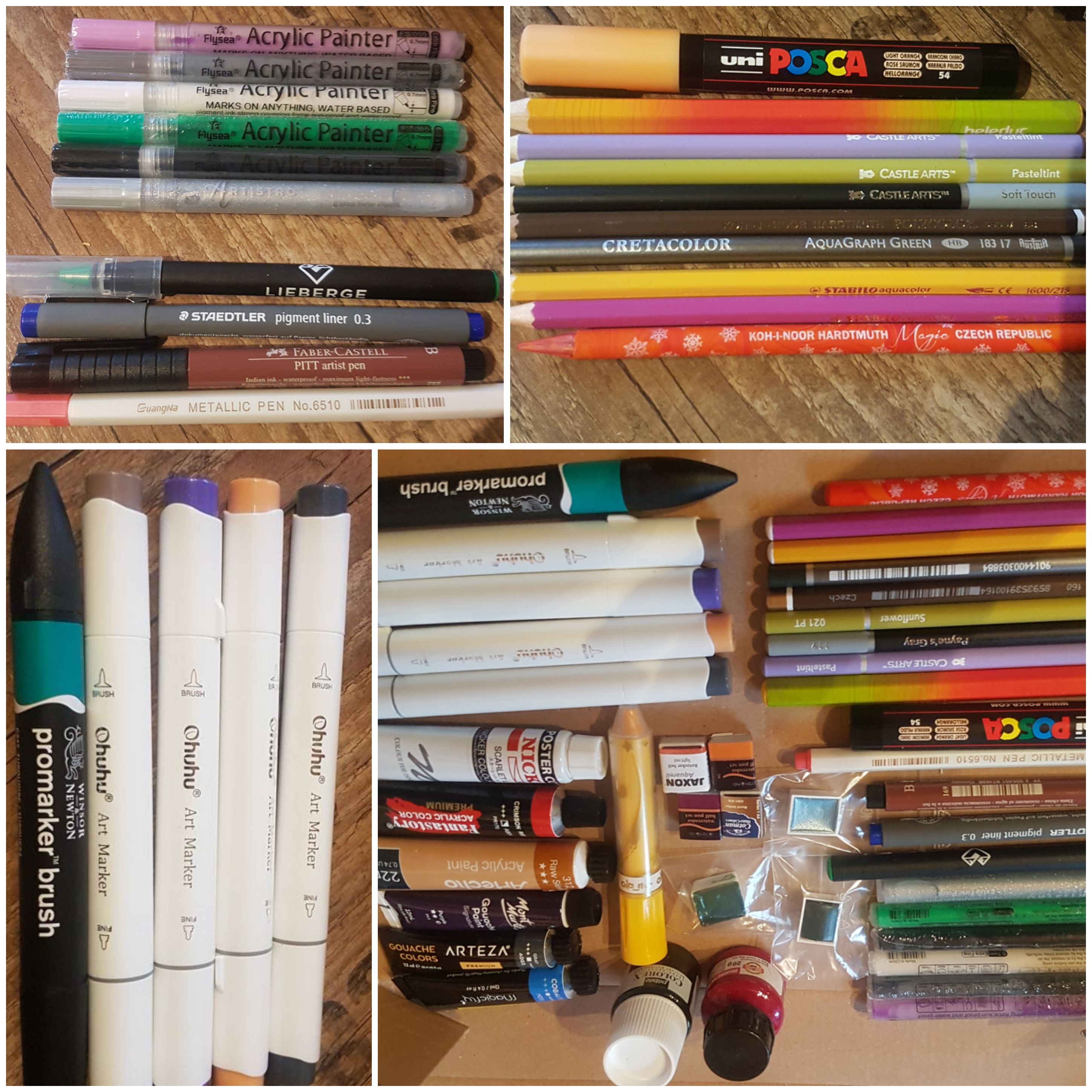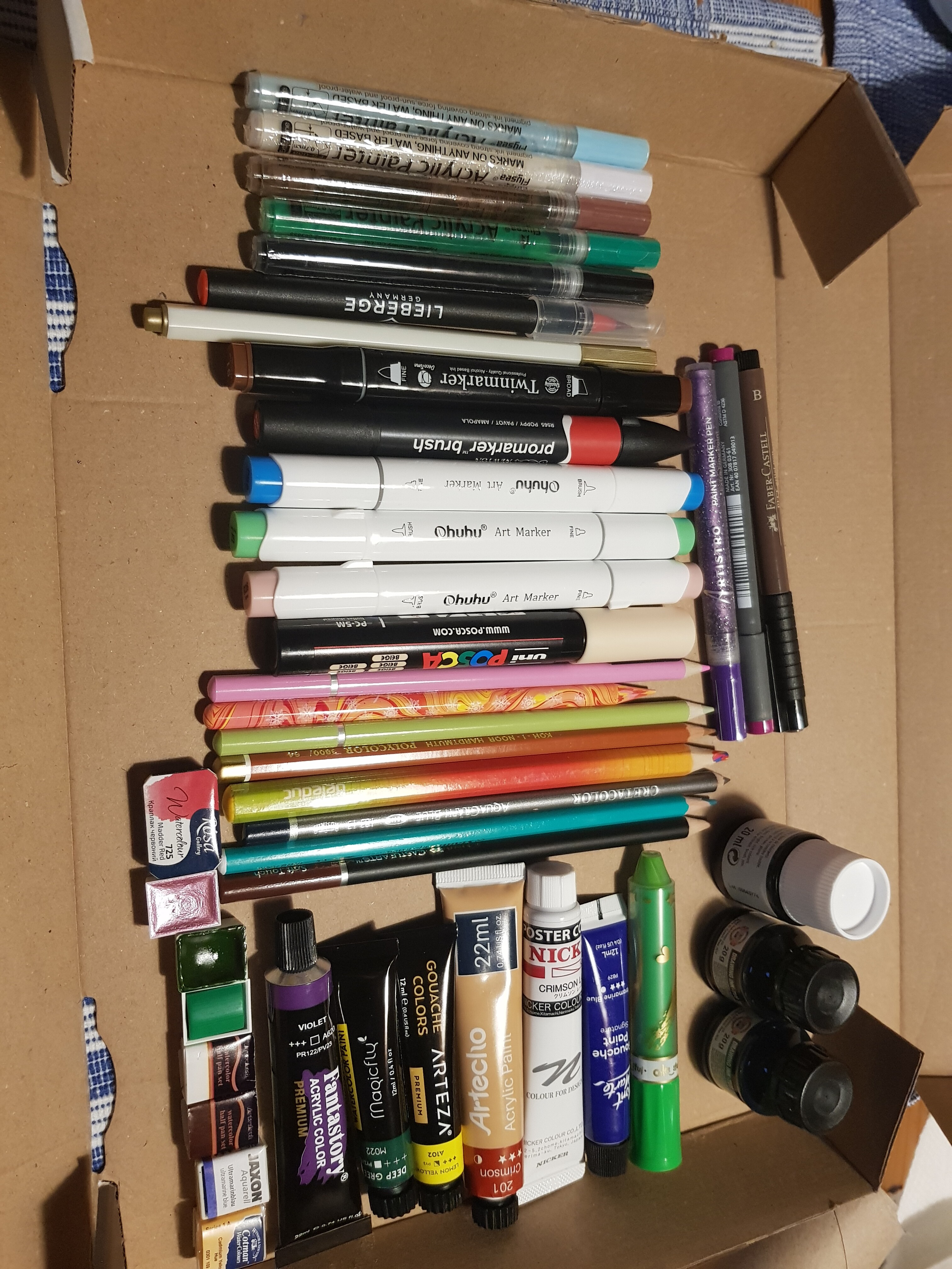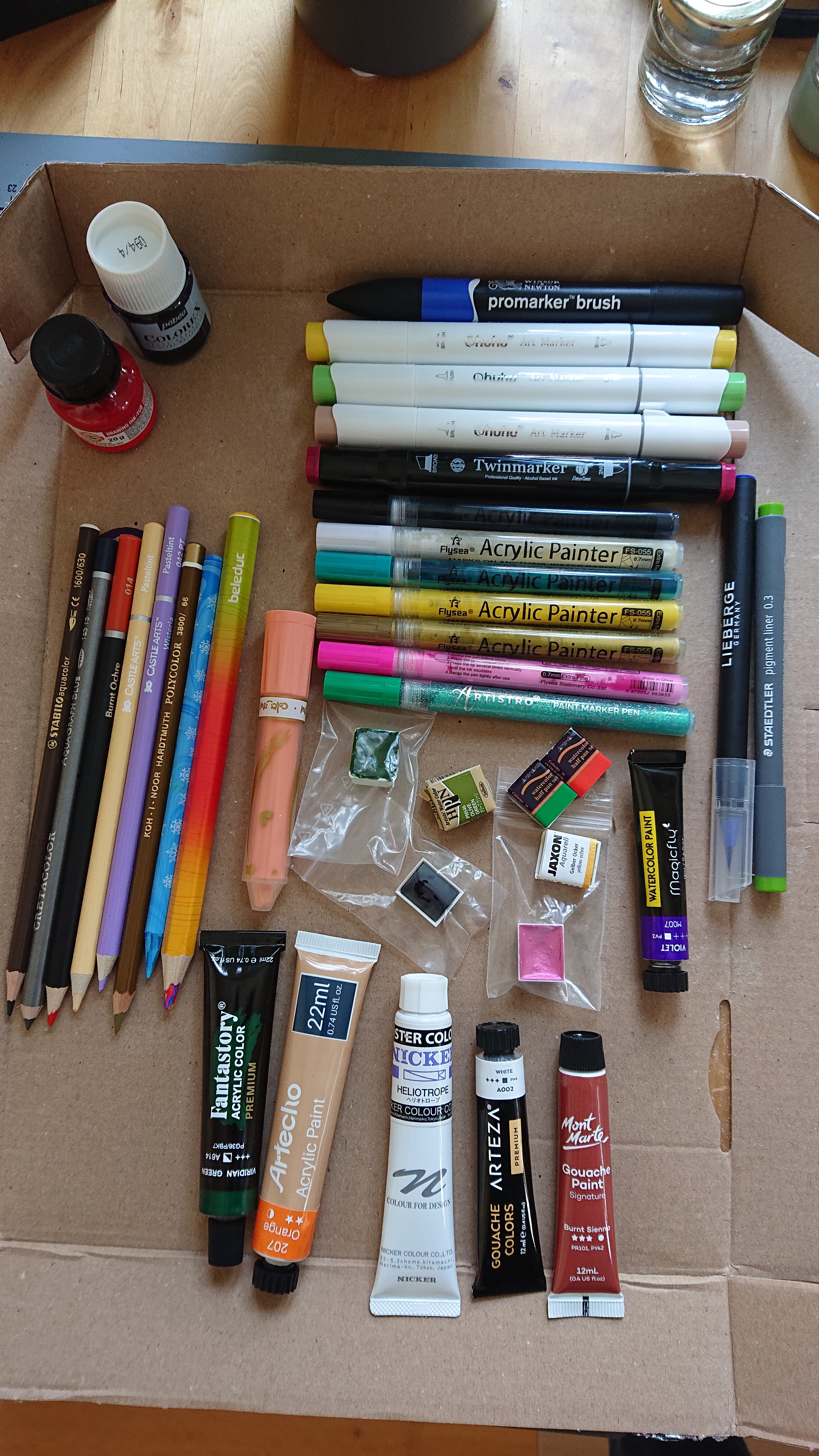 ich kann also ALLES sehr gut gebrauchen. Mein erster bunter Fine Liner - GEIL - Acrylic Paint Marker hab ich schon ein Paar und freue mich sehr über die neue Farben, besonders weiß und schwarz… alles schon lange leer. Die Farben der Marker - super passend, und ich freue mich auf’s Papier bringen. Alle anderen Tuben, Fläschchen, feste Farben…