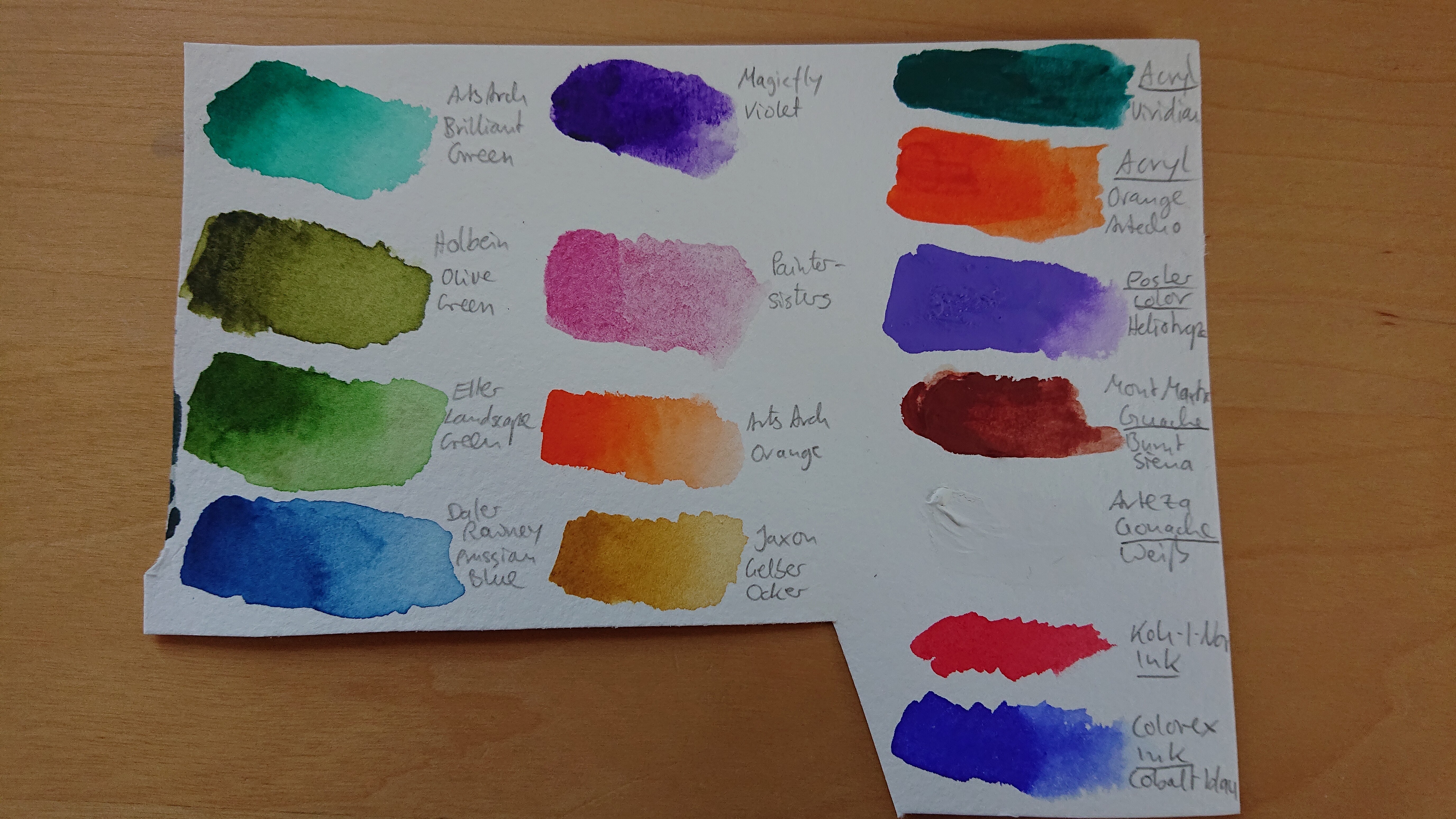 1 Selbstgemachte Aquarellfarbe Aquarell Eine granulierende Aquarellfarbe aus Ellers heimischer Produktion. Du hast entweder “Landscape Green” (PY153, PG7, PBr11) oder “Swamp” (PB60, PG7, PBk11, PY153, PBr11) erhalten. Alle verwendeten Pigmente haben sehr hohe Lichtechtheit, so dass diese Farbe als seriöses Künstlermaterial herhalten kann.