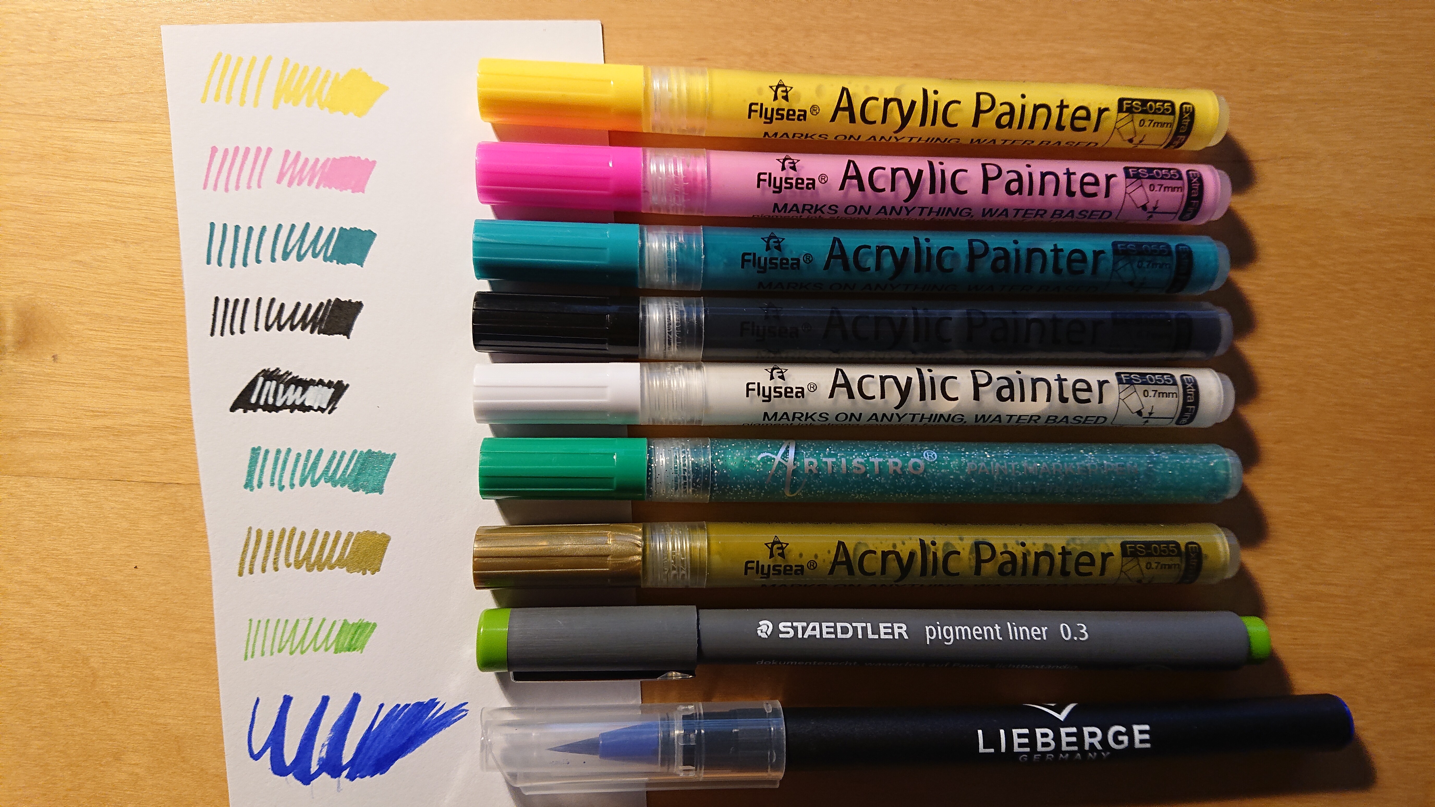 5 FlySea Acrylstifte Acrylmarker Marker mit Acrylfarbe drin. Vorm ersten Benutzen bitte seeeehr gut schütteln (die Farbe entmischt sich leicht) und dann die Spitze kräftig ins Innere des Stiftes drücken. Diese Stifte sind nach dem Trocknen wasserfest. Du solltest Schwarz, Weiß, und drei weitere Farben erhalten haben. Der weiße eignet sich gut für Highlights.
