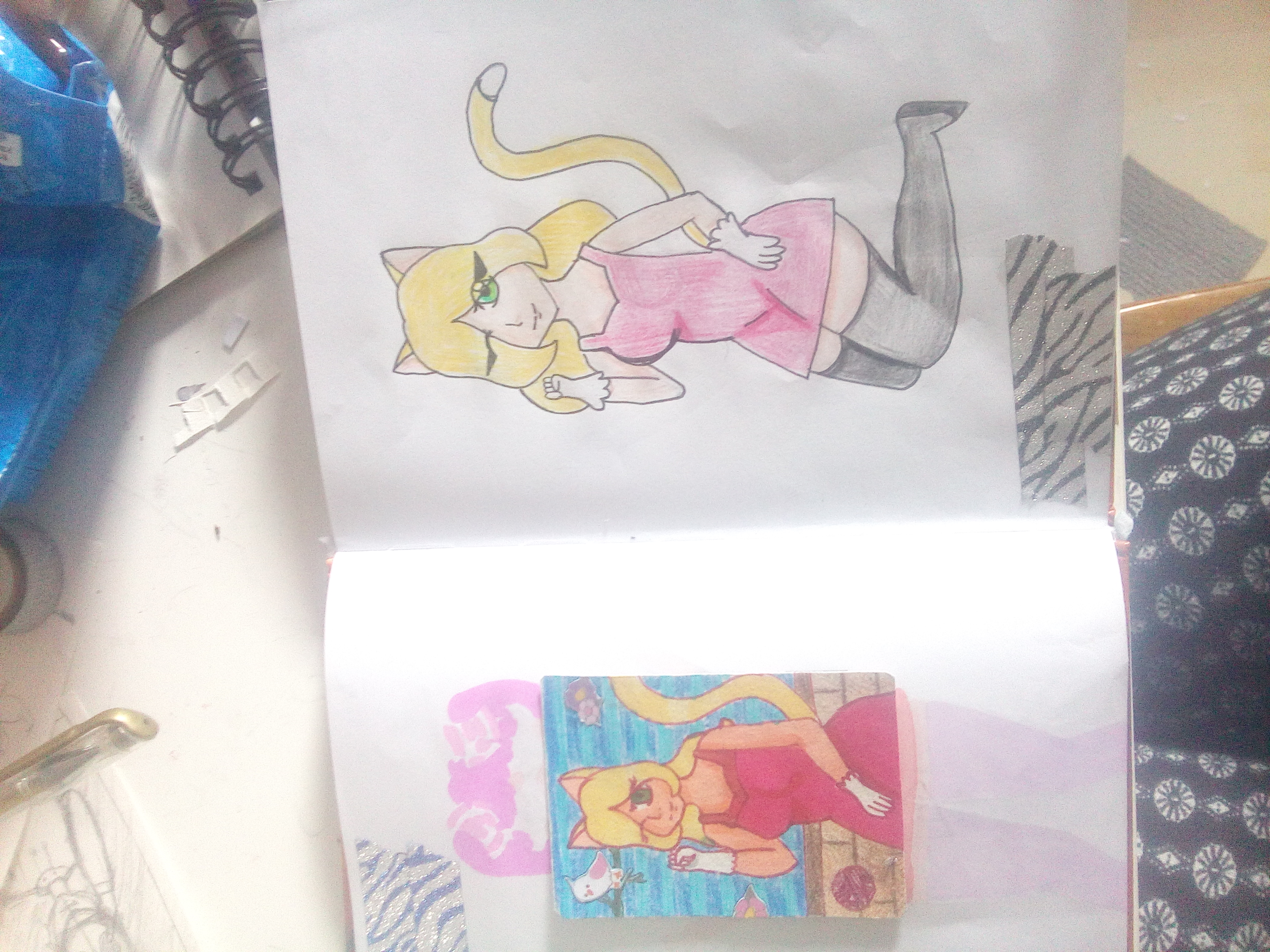 Die zweite ist wieder eine Neko. Ich wollte eigentlich nur eine Neko machen, aber ich wollte diese Zeichnung unbedingt nochmal zeichnen. Den Hintergrund habe ich mit Stickern verschönert. Ich hoffe das war okay ^^°