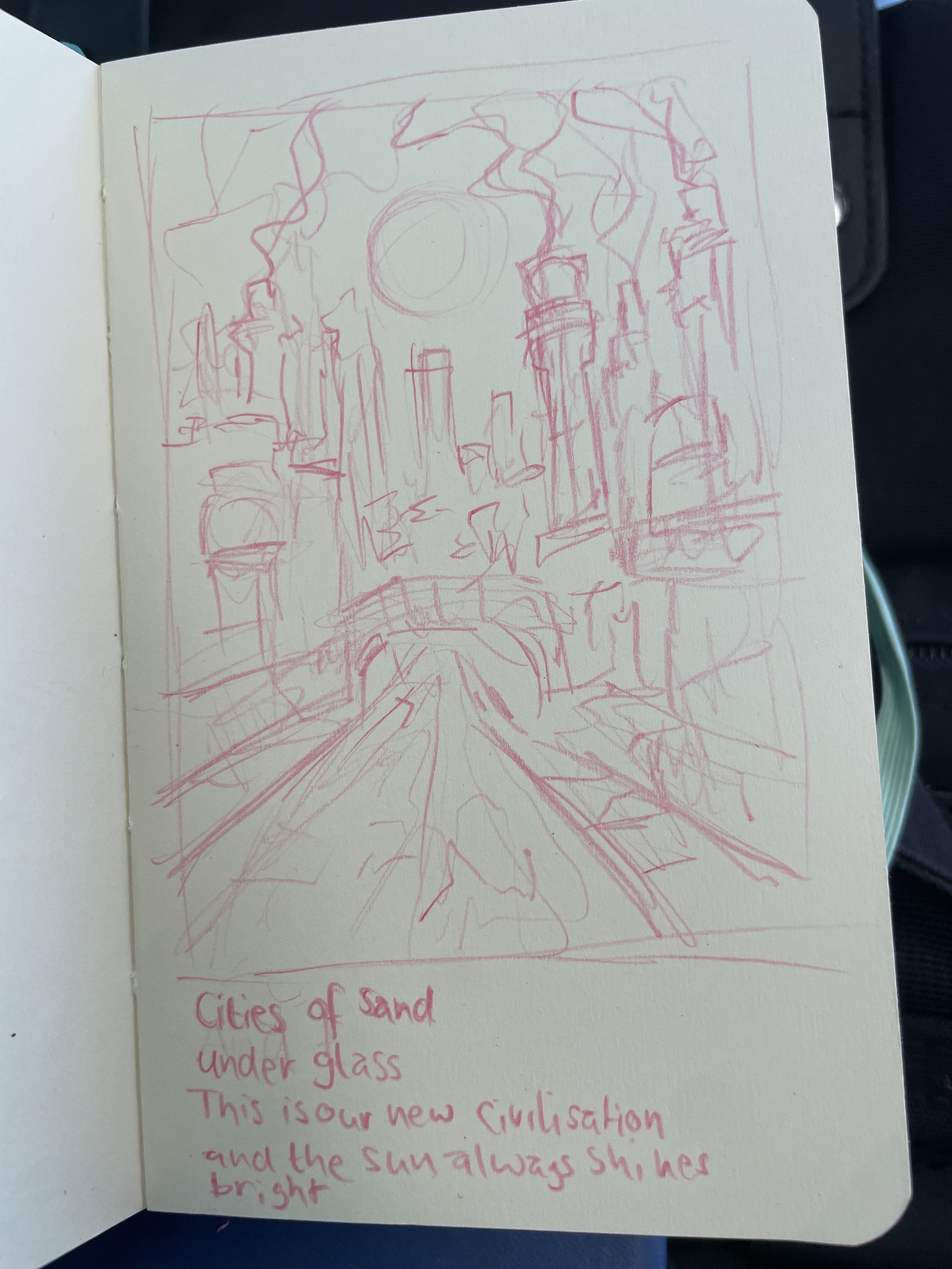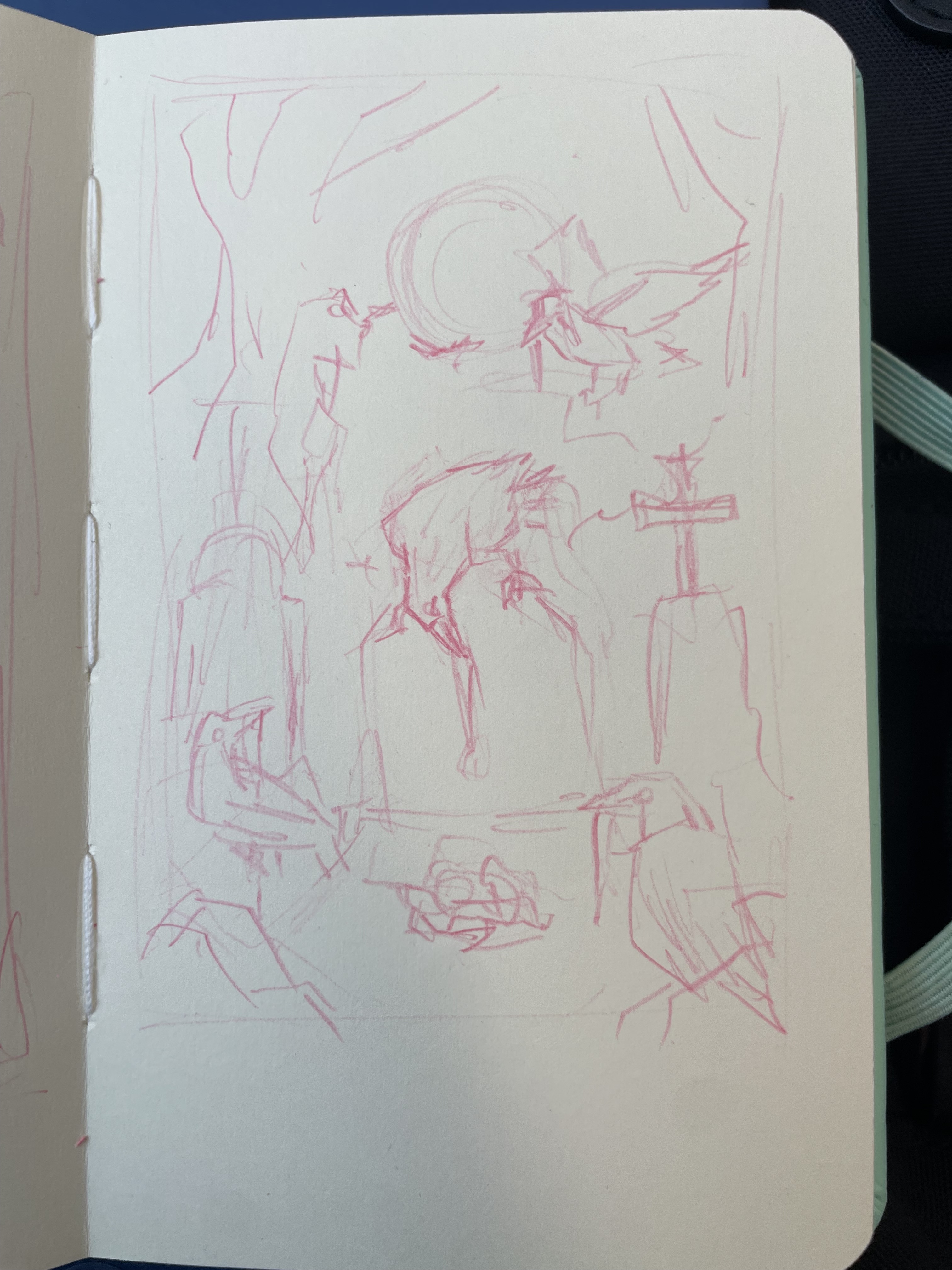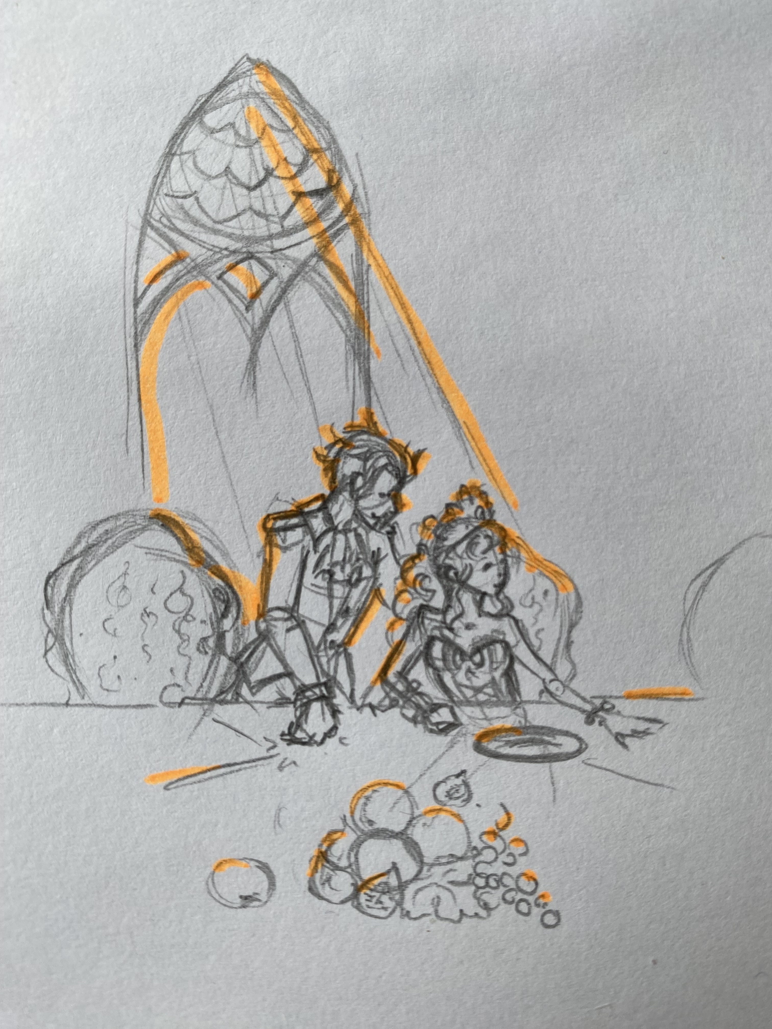 Ich freu mich so auf das Thema, ich hab heute Morgen in der Bahn direkt 3 Skizzen gemacht. Wobei das meine “play it safe” Skizzen wären, weil mich der Infotext verunsichert hat. Als die Aktion angekündigt wurde, hab ich mir nämlich schon Gedanken gemacht und überlegt, dass es eine schöne Juxtaposition wäre, wenn man alltägliche und vielleicht nicht ganz so glamouröse Szenen in diesen Farben darstellen würde. Oder sogar schäbige Gebäude in denen goldene Lichter brennen oder Lost Places usw.