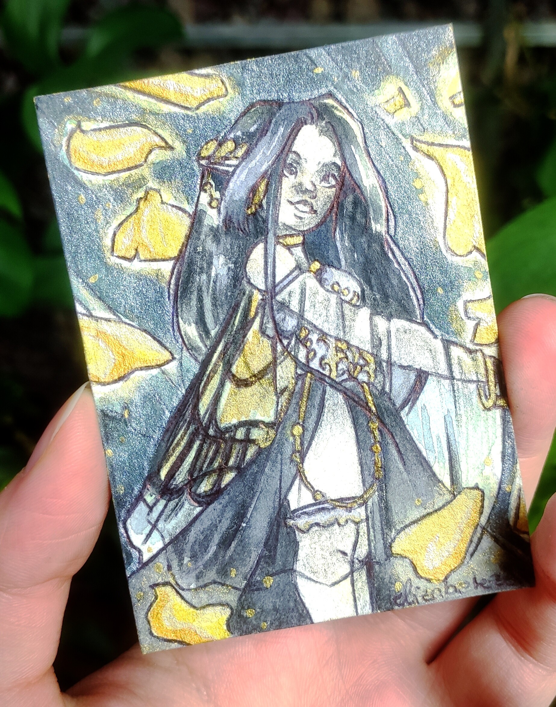 Also ich habe hier viel gelesen zu dem Thema Gold in den Karten und den Schwarztönen. Zur Sicherheit würde ich gerne euch fragen, ob diese Karte, die ich gestern gemacht habe, zu den Beschreibungen passen würde. Ich habe die Goldteile jetzt mit Schatten und Glanzlichtern gemalt. Habe dafür jetzt Kuretake Wasserfarben genutzt, leider glitzern die und gutes Bild machen war doof, aber ich glaube, man kann die Abstufungen immer noch erkennen. Außerdem habe ich jetzt zwei verschiedene Schwarz benutzt, im Hintergrund ist alles etwas grünlich, da es so wie Wald oder große Pflanzen(da es eine Fee ist) darstellen soll und die Kleidung ist im Gegenzug etwas bläulich-lila.