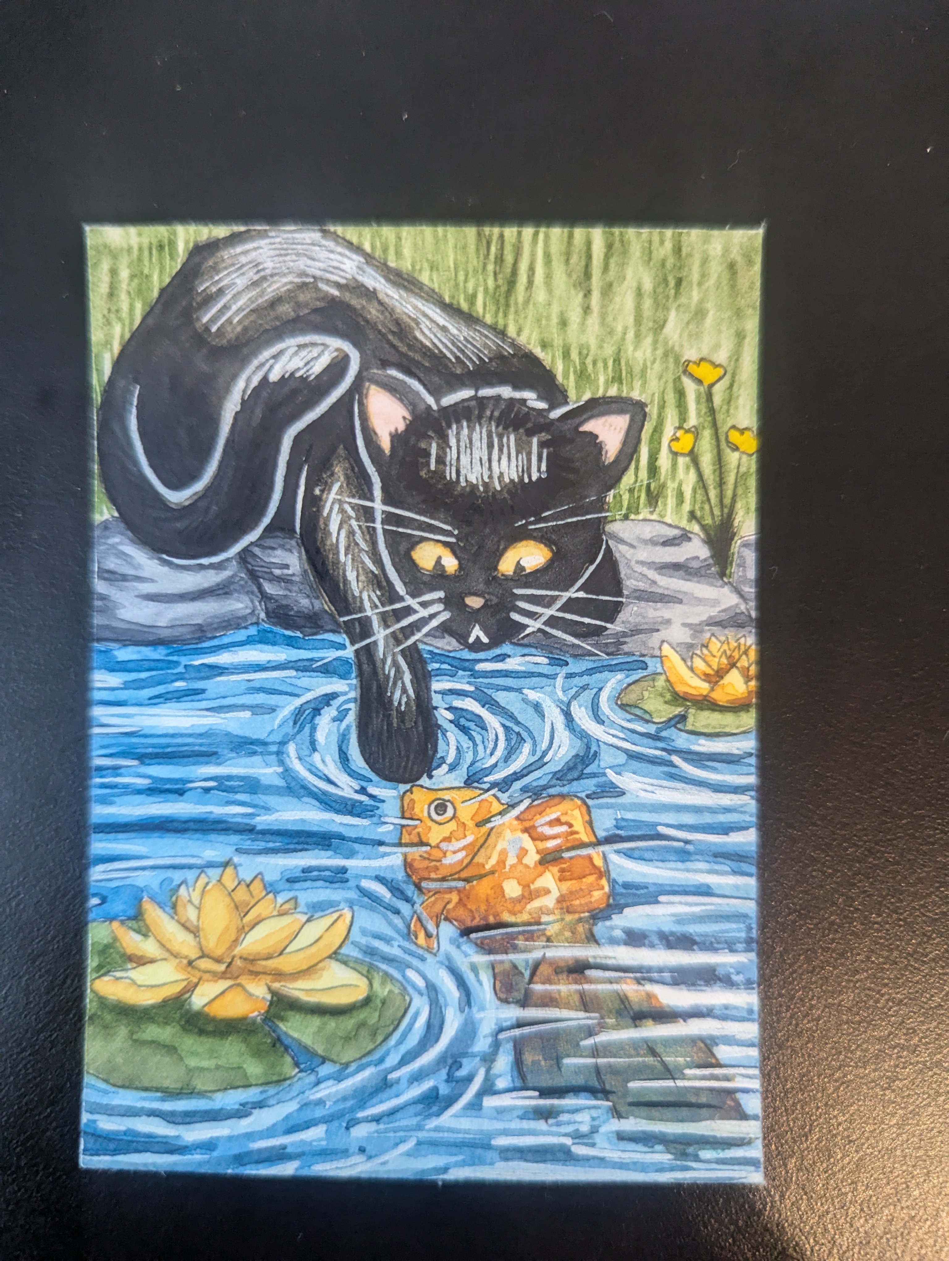 Und die “Gouache” bei den Kois hat sich nicht direkt weg wischen lassen, sie ist aber großzügig an meinen Fingern hängen geblieben. Man sieht es auf dem Foto nicht so, aber die Karte ist übersät mit meinen Fingerabdrücken, weil immer, wenn ich die Karte für eine Minute festgehalten habe zum Malen an den Stellen die Farbe gefunden hat an meinem Finger lebt es sich besser als auf dem Papier o_o"