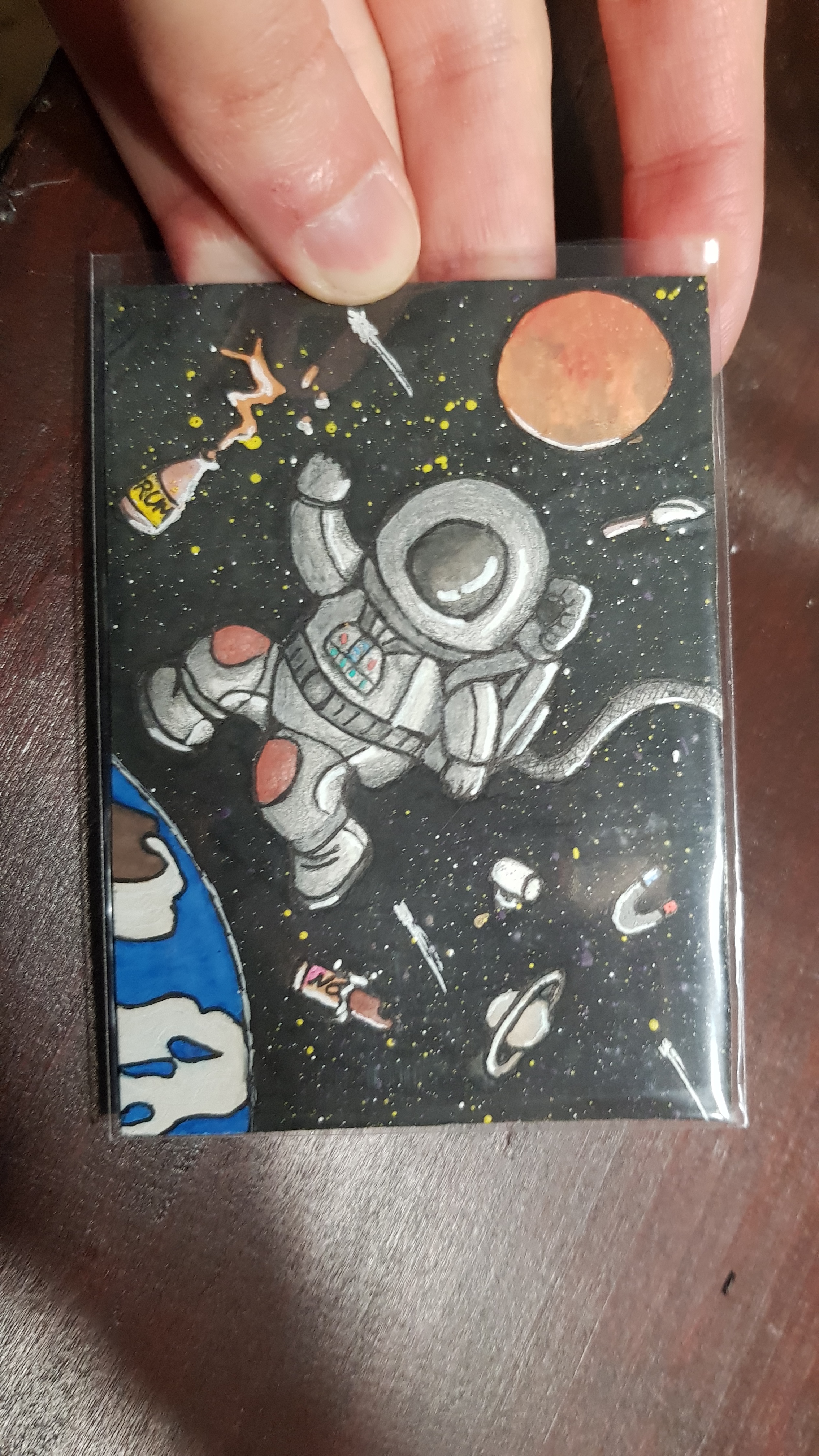 Offiziell bin ich zwar noch keine Teilnehmerin, aber ich habe trotzdem schon mal meine erste Idee finalisiert. Irgendwie kam mir gleich das Bild eines Tollpatschigen Astronauten in den Kopf, der die Schleuse seiner Raumstation nicht geschlossen hat und nun seinen “Weltraumschrott” wieder einsammeln will.