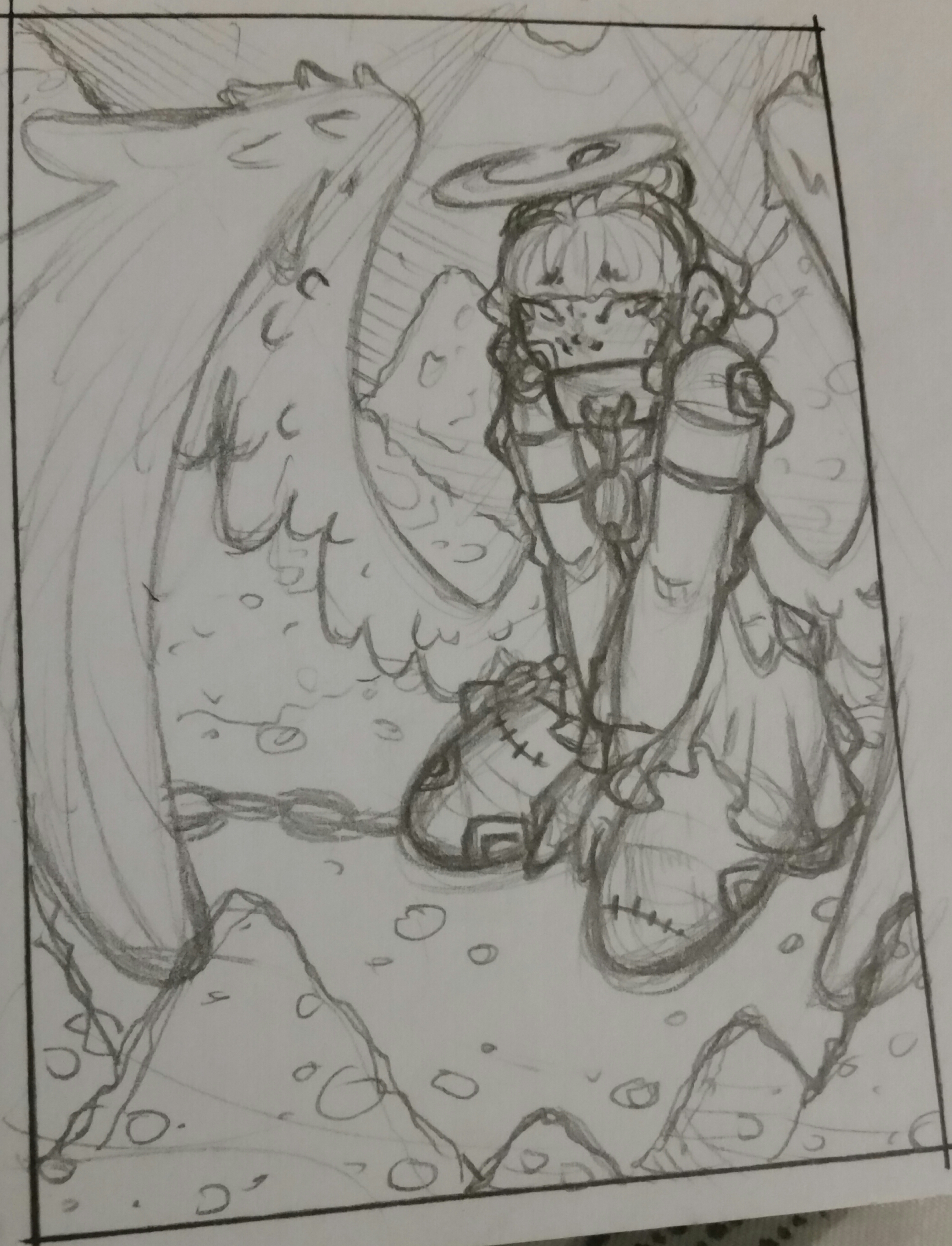Die Wörter wären Engel, Elend, Gold, Geld, sowie Sünde und meine Idee war dass der Engel die Sünde der Habgier beging und all dieses Geld angesammelt hat. Für diese Sünde wurde der Engel erst körperlich bestraft und dann mit einer goldenen Fessel umgeben von dem gesammelten Geld, zu Erinnerung an den Fehler, gefangen. Das alles natürlich klischeehaft in einem Berg.~X’D