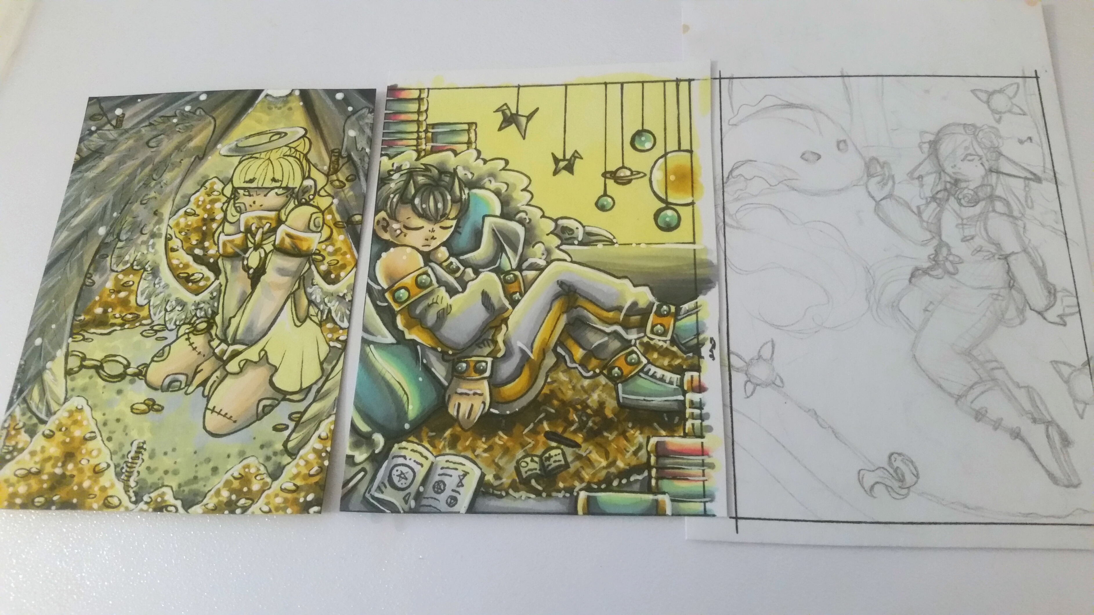 Meine zwei schon gezeigten Skizzen sind beide fast fertig coloriert und es steht sogar eine eventuelle dritte Skizze mit den Worten Fee, Elf, Fluss und Seele.