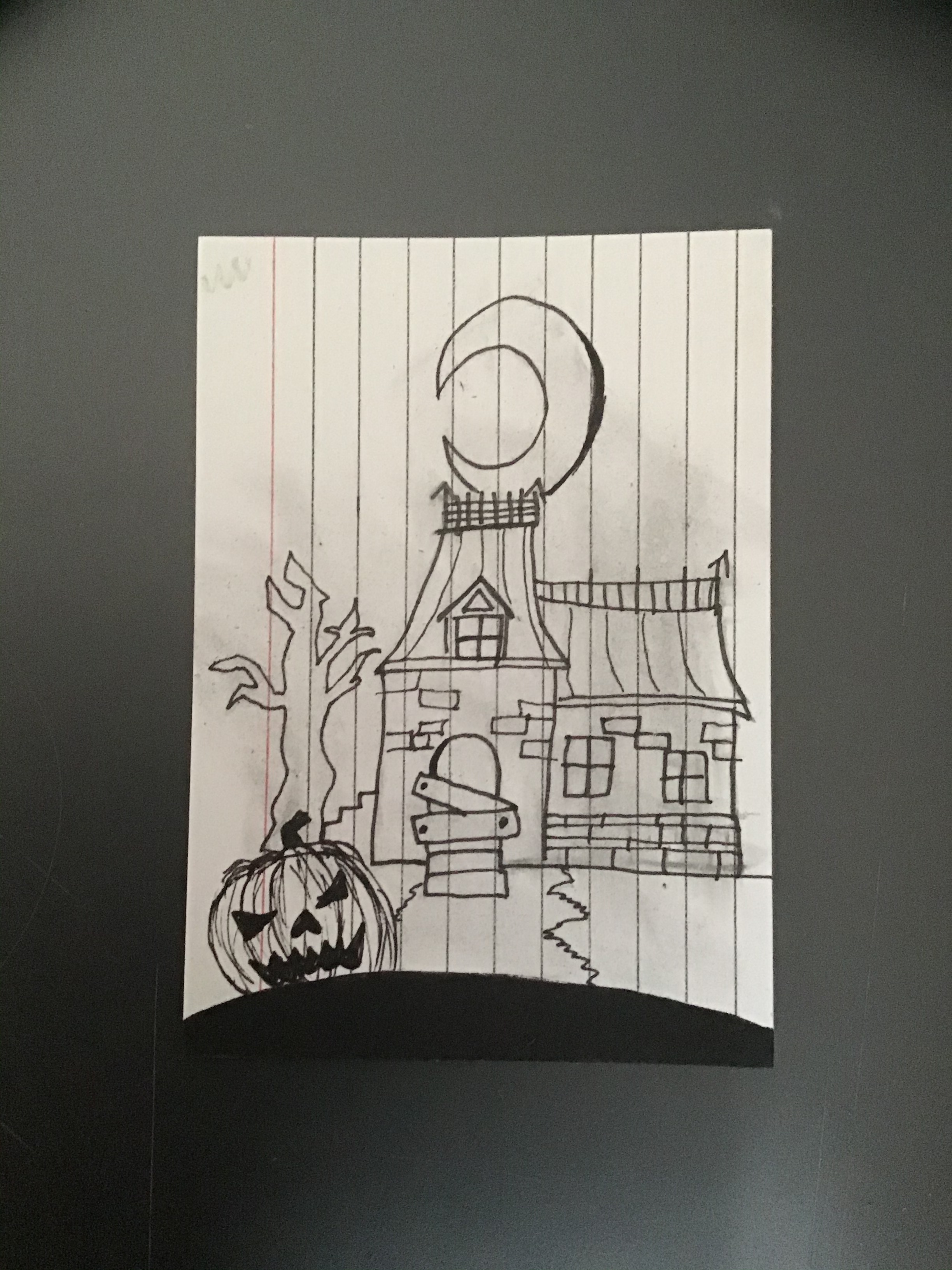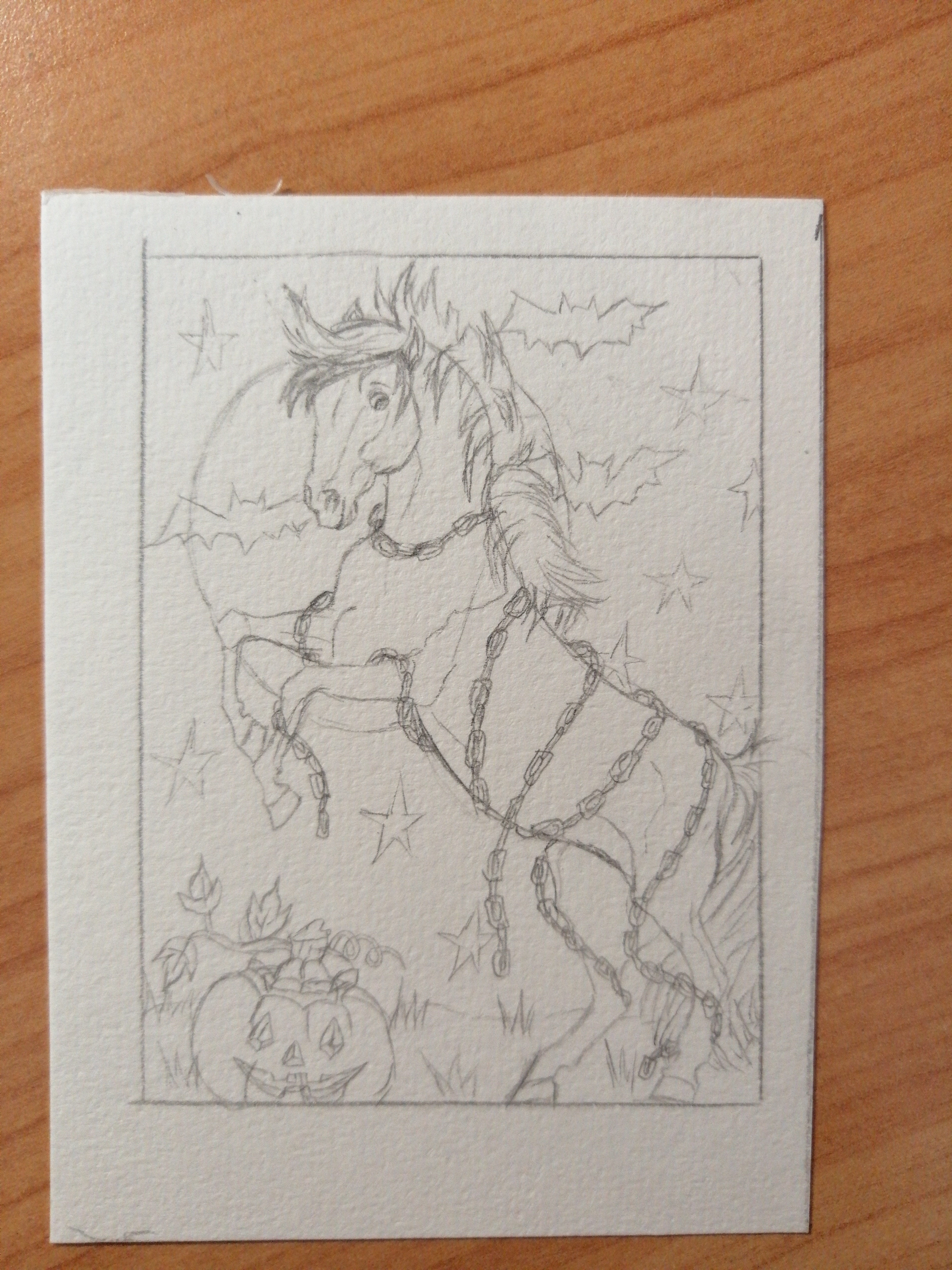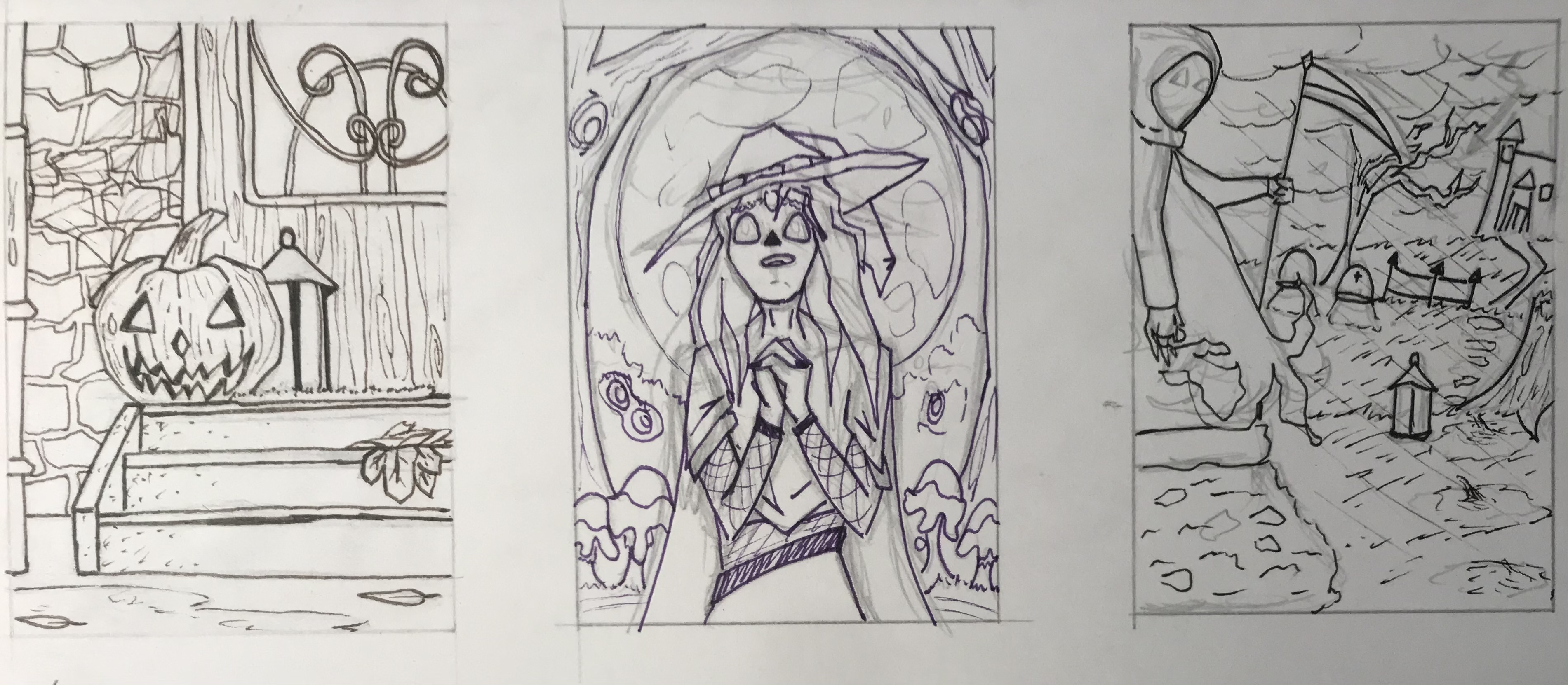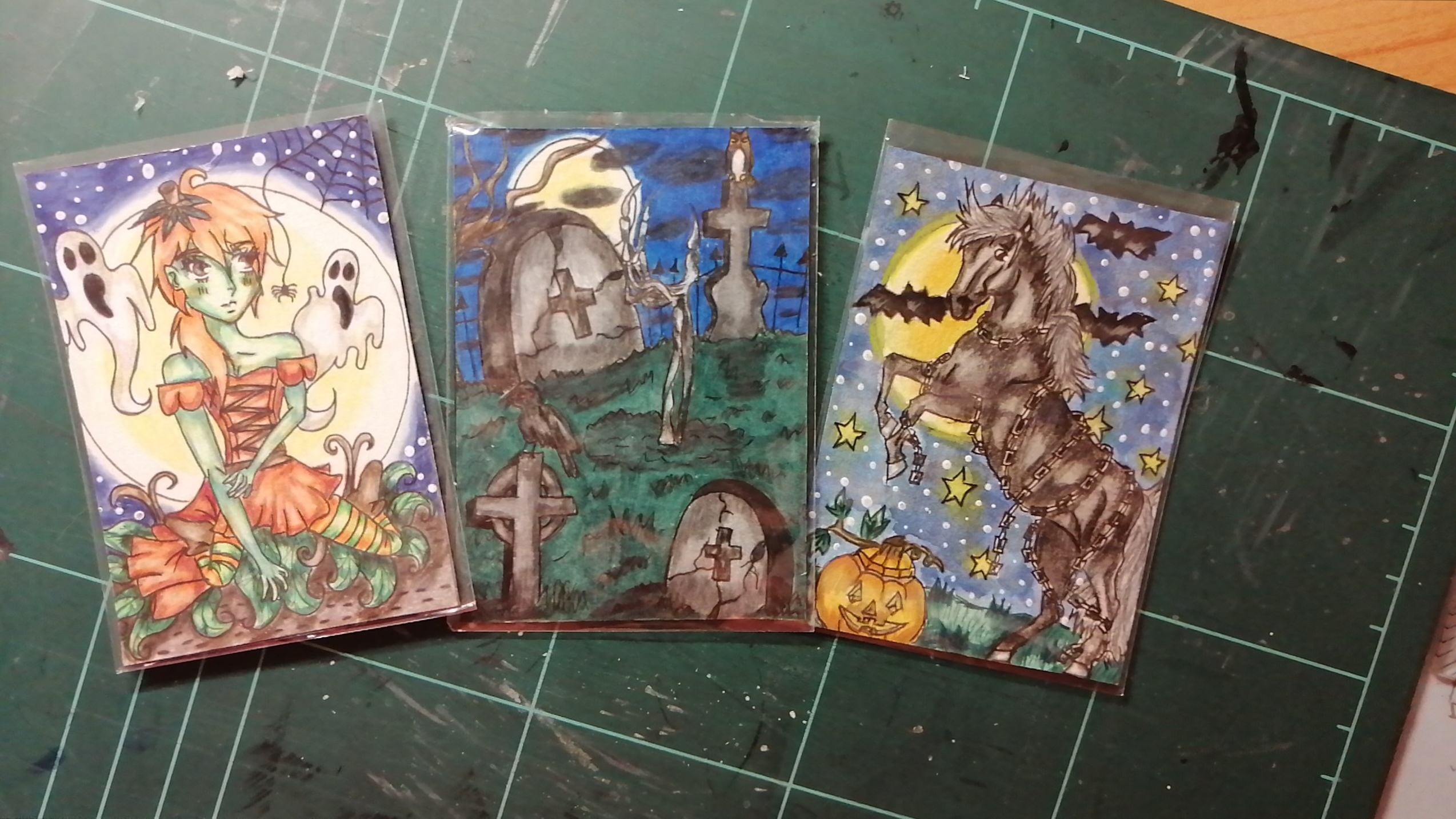 Ich war so motiviert dass ich sie mehr oder weniger in einem Rutsch gezeichnet habe. Ich hatte mich bei den Karten für weiße Rahmen entschieden als Kontrast da die Motive eher dunkel sind. Die Rahmen sind mit Absicht nicht gleichhmäßig, vor allem bei den Geistern, da diese Schabernack getrieben und den Rahmen verrückt haben. Sie spielen eben gern Streiche.