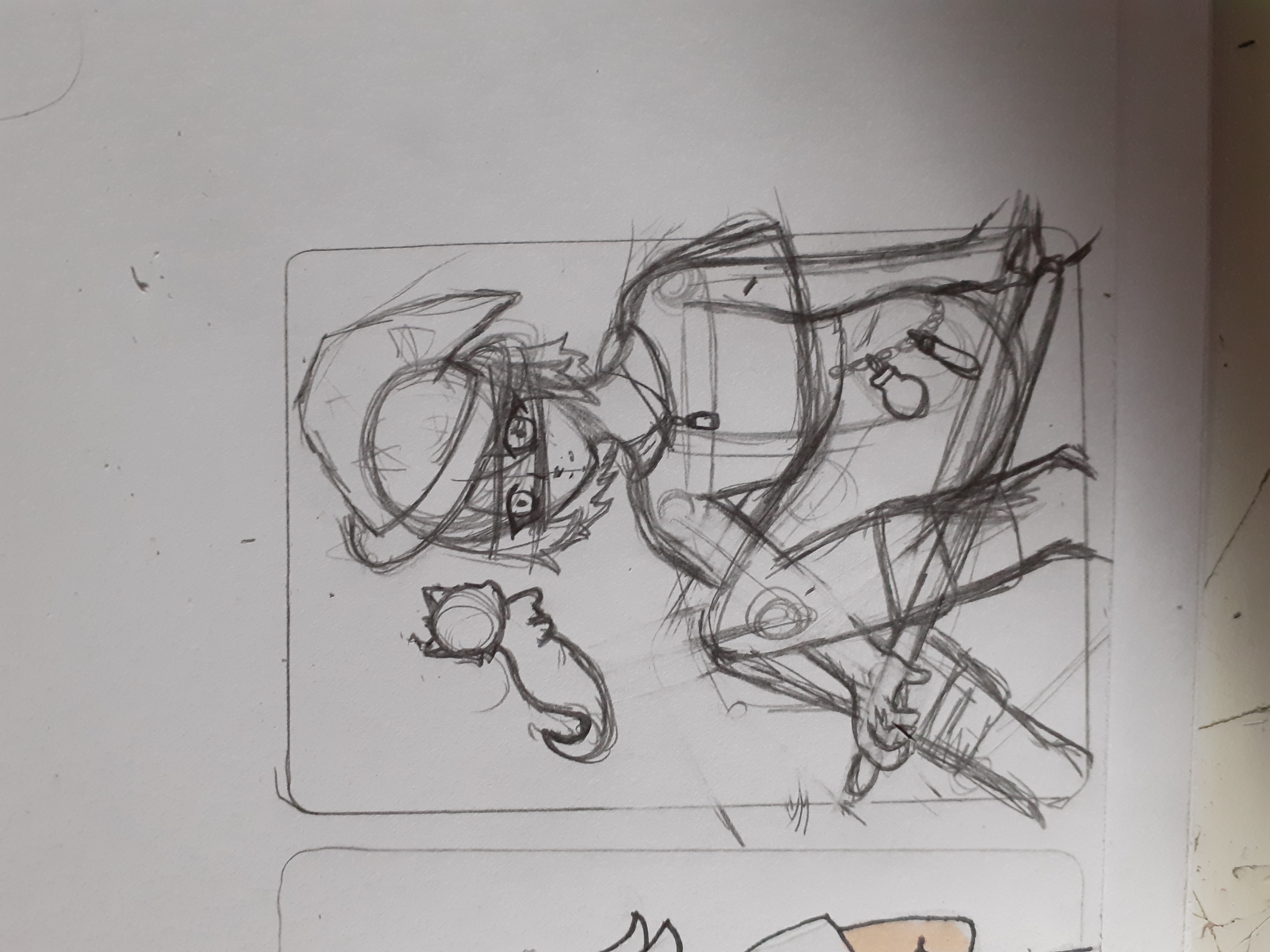 Oh, die Skizze sieht schon echt cool aus. ^^ Ich glaube beim vorderen Arm würde es helfen, wenn du die Hand drehst, also den Daumen vor den Besen und die restlichen Finger dahinter zeichnest .