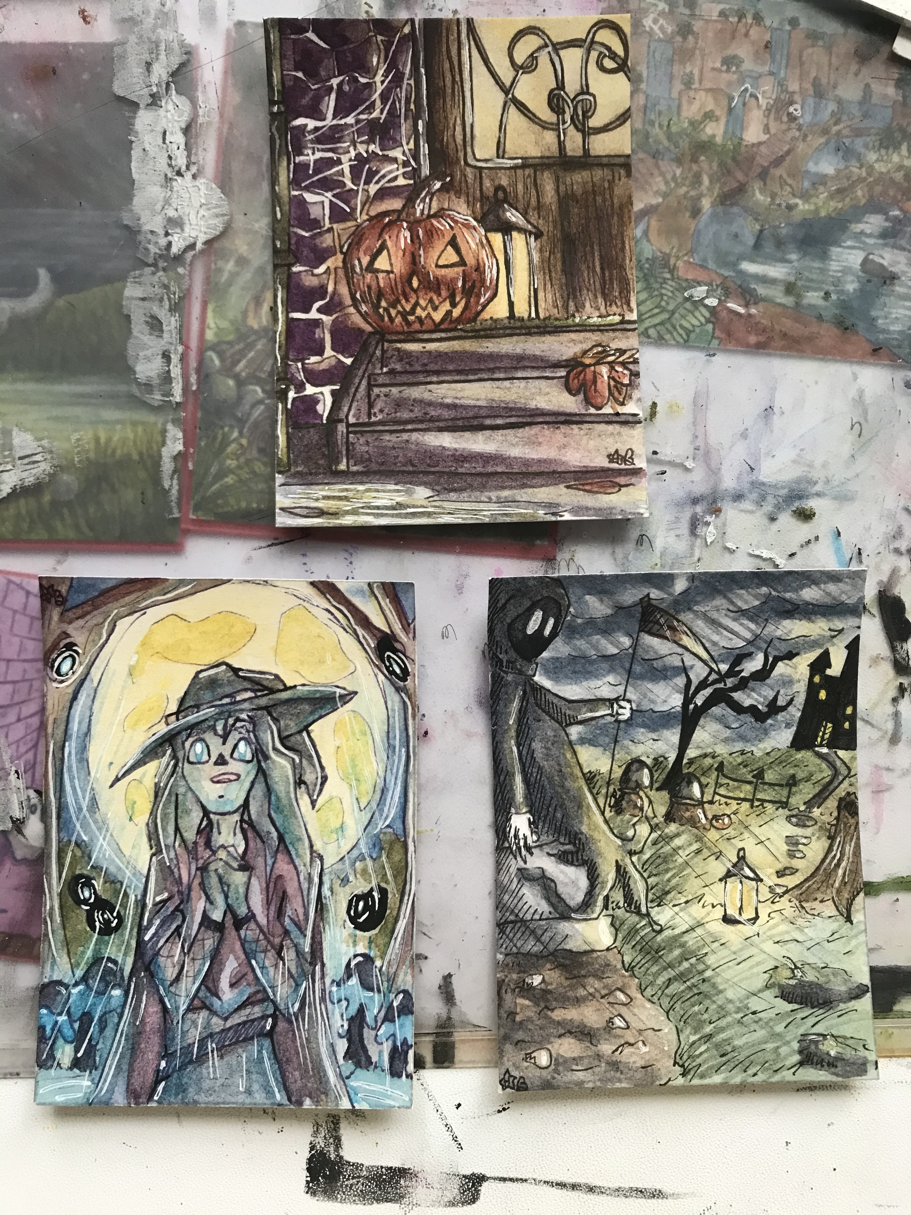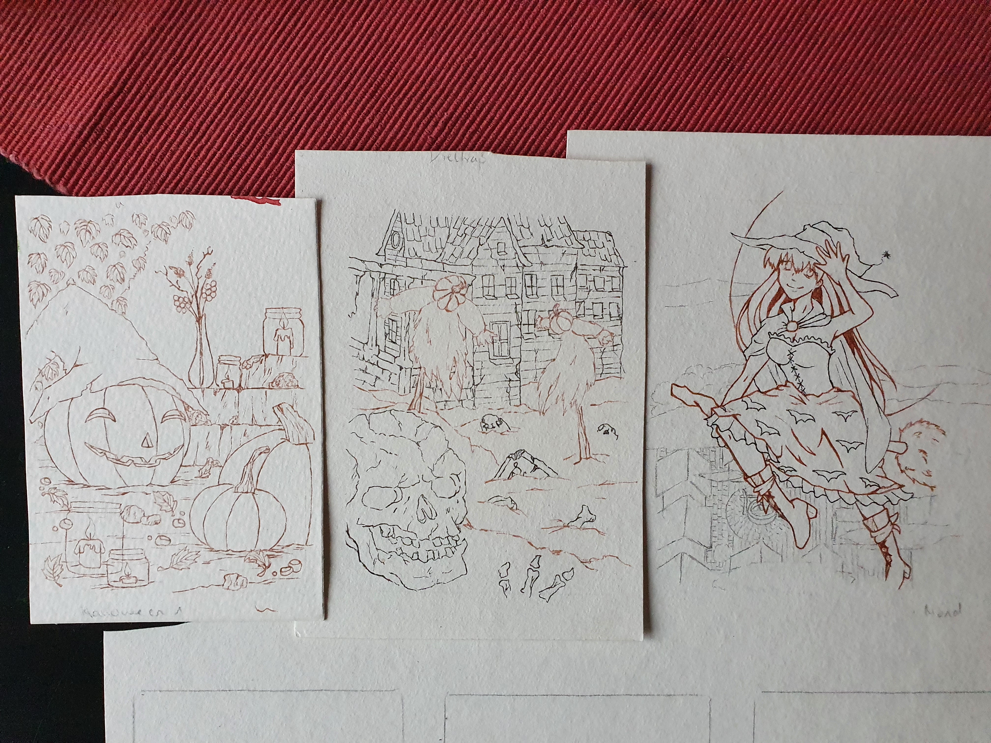 - Eine etwas herbstlich-halloween mäßige Karte , dann 2. Gruseliger Friedhof mit verlassener Villa und 3. Eine junge Hexe auf nem Besen (: