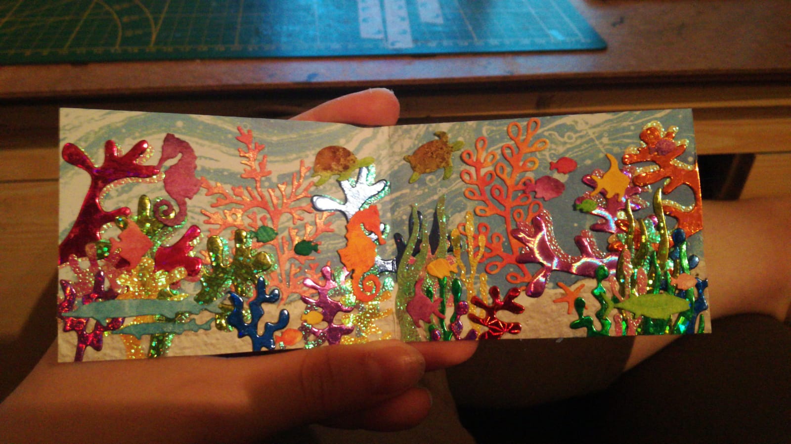 Es handelt sich um eine Klappkarte und ich habe mich erst um den aufgeklappten Zustand hier gekümmert. Die Außenseite wird dann ganz schlicht. Man merkt, dass ich mir ein paar Korallen Stanzschablonen zugelegt habe… und mit dem Papier fand ich die sooo toll! Dennoch hab ichs glaube ich etwas übertrieben…