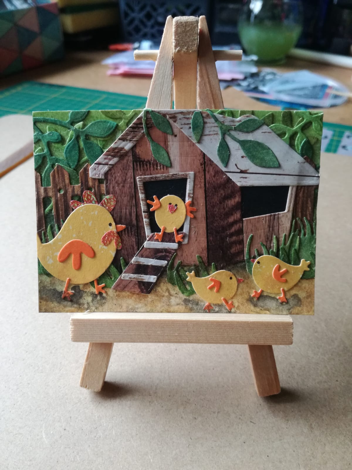 Ich bin auch fröhlich am weiter basteln… hier ein Kärtchen mit meinen bestellten Stanzteilen. Bei dem Stall habe ich Holzmusterpapier benutzt und ich bin super zufrieden mit dem Ergebnis, da es so schön verwuchert und natürlich aussieht. :D