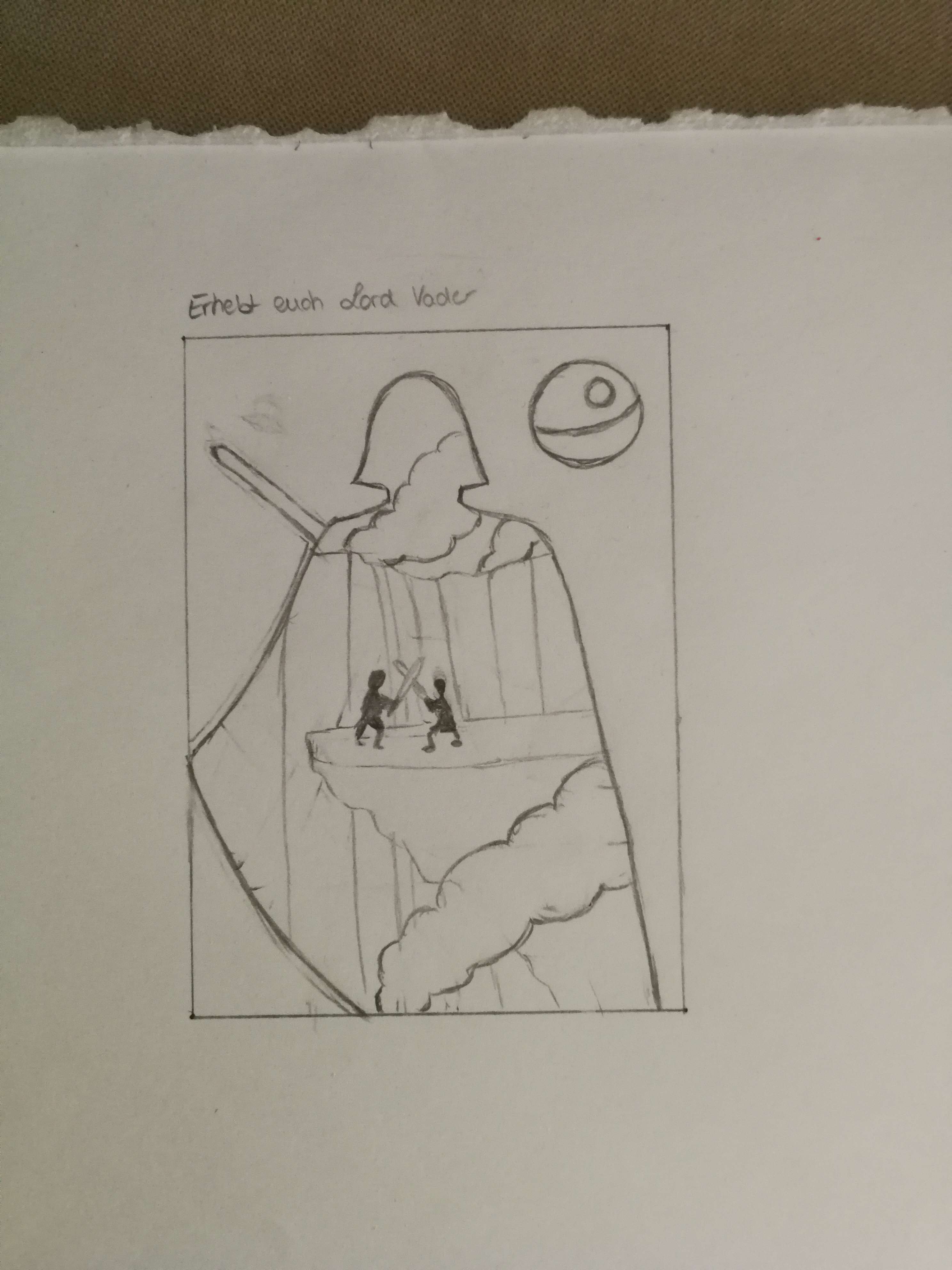 Ich wollte mal fragen, ob dieses Konzept her als zweite Karte in Ordnung wäre. Die Szene von Mustafar wäre natürlich sehr rot-orange-gelb, wegen der Lava und der Hintergrund schwarz, wobei ich natürlich versuche das rote Laserschwert zum Leuchten zu bringen. Und Sterne und vielleicht noch ein paar imperiale Kampfeinheiten kommen auch noch in den Hintergrund.