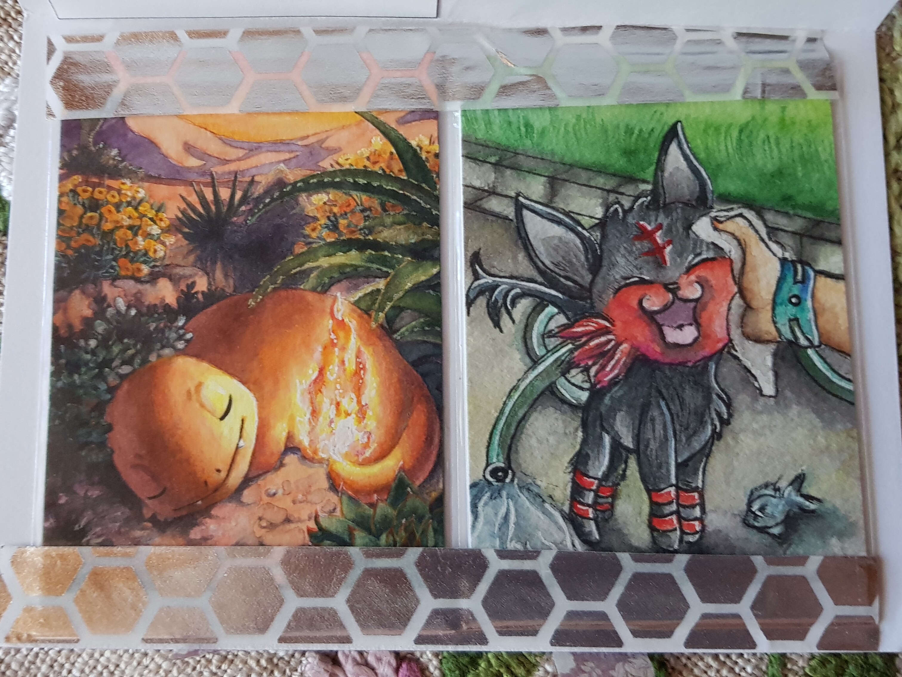 Und dann noch Wüstenschlaf von Quecksilber . Diese Karte ist ein Traum, ich kann mich gar nicht an den Pflanzen und den Farben sattsehen! Das Glumanda ist so selig, wie es schläft qwq und ich liebe es wie sich diese feurige Eidechse in ihre Umgebung einfügt! Sie war mein absoluter Favo und ich könnt mich kaum glücklicher schätzen, sie zusammen mit dem Flamiau bei mir haben zu dürfen.