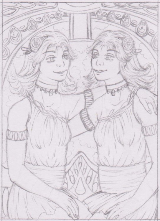 Damit ihr auch mal einen anderen Zwischenbericht hört, außer meine Internetprobleme °xD: Ich habe jetzt die 3 Skizzen meiner Karten fertig ^^. Es sind Waage, Jungfrau und Zwilling. Ich habe auch bei den 3 Karten die Sternzeichen-Symbole mit untergebracht (Bei der Waage ist das Symbol eingearbeitet in die Waage selbst, im Kopf-Schulter-Bereich. Die Jungfrau hat das Symbol auf ihrem Kleid. Bei den Zwillingen ist es mittig über den Köpfen der Beiden, in dieses Jugendstil-Ornament mit eingearbeitet. Und ja, es war geplant, dass die Kleidung der Zwillinge etwas moderner aussieht und nicht ganz hunderprozentig Jugenstilmäßig ist ^^).