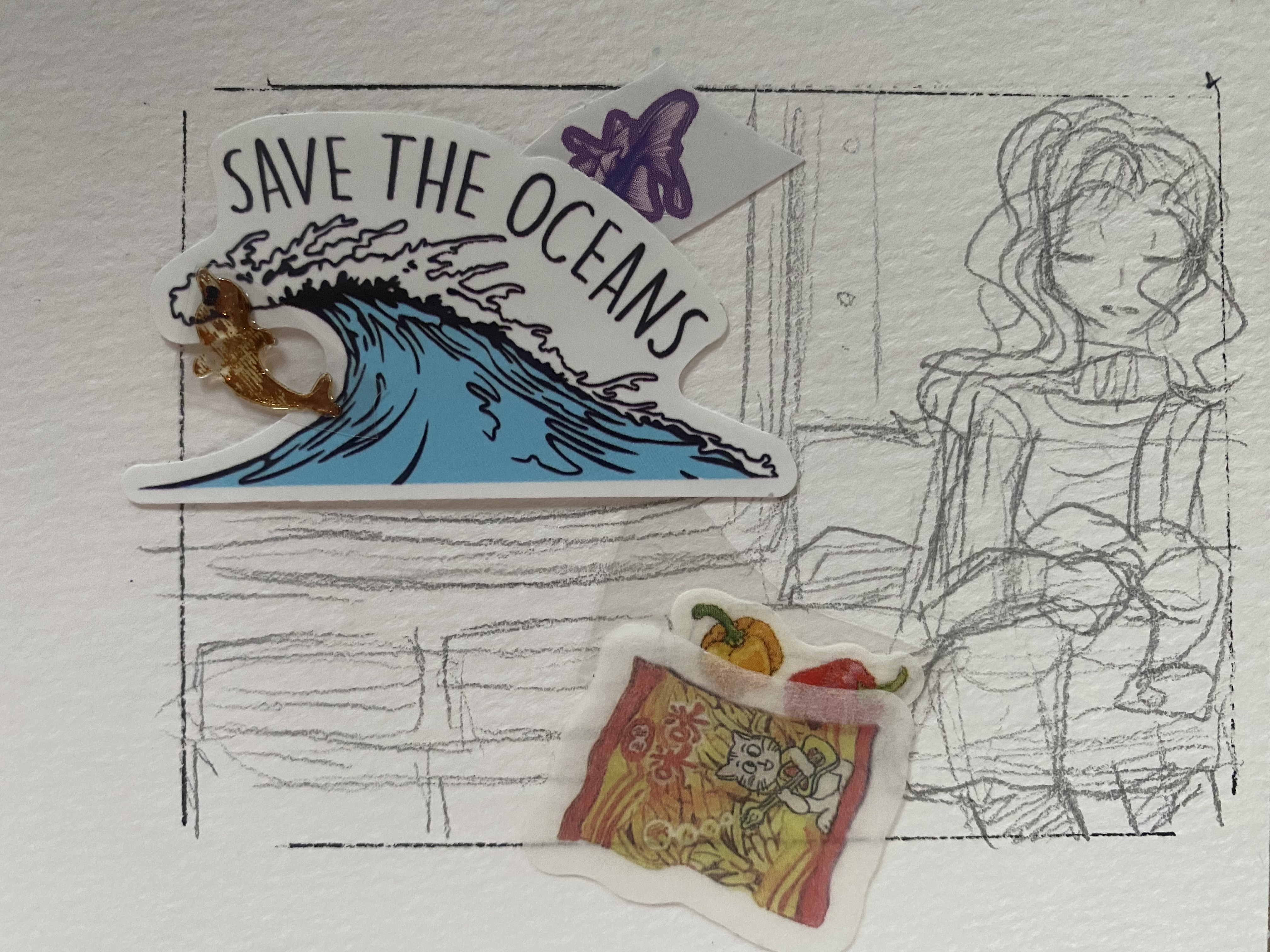 Meine Letzte Karte, eine schlafende Person in der U-Bahn hinten ist ein Save the Ocean Plakat und vorne eine Einkaufstüte :3