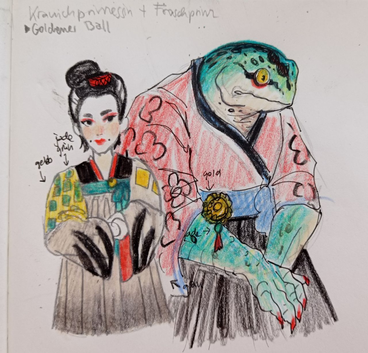 Hier schon mal mögliche Design-Konzepte für die Kranichprinzessin und den Froschprinz.