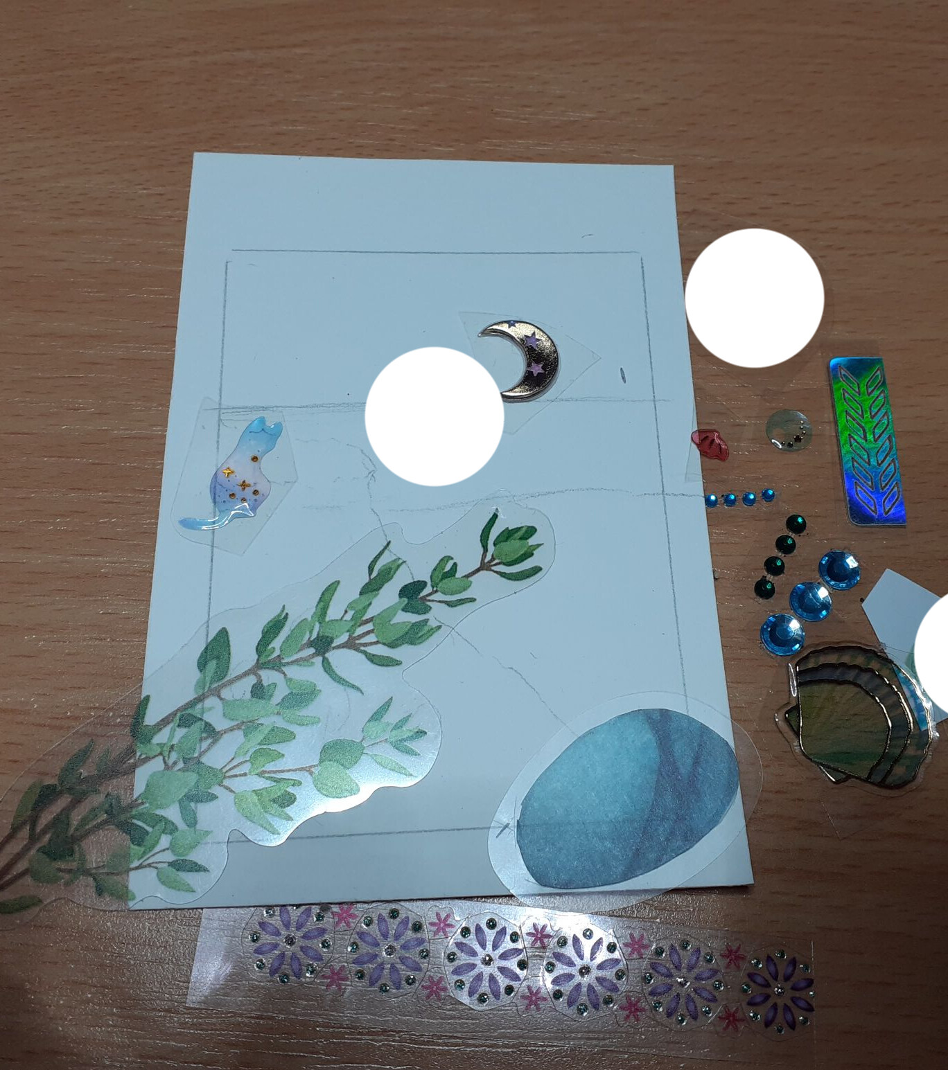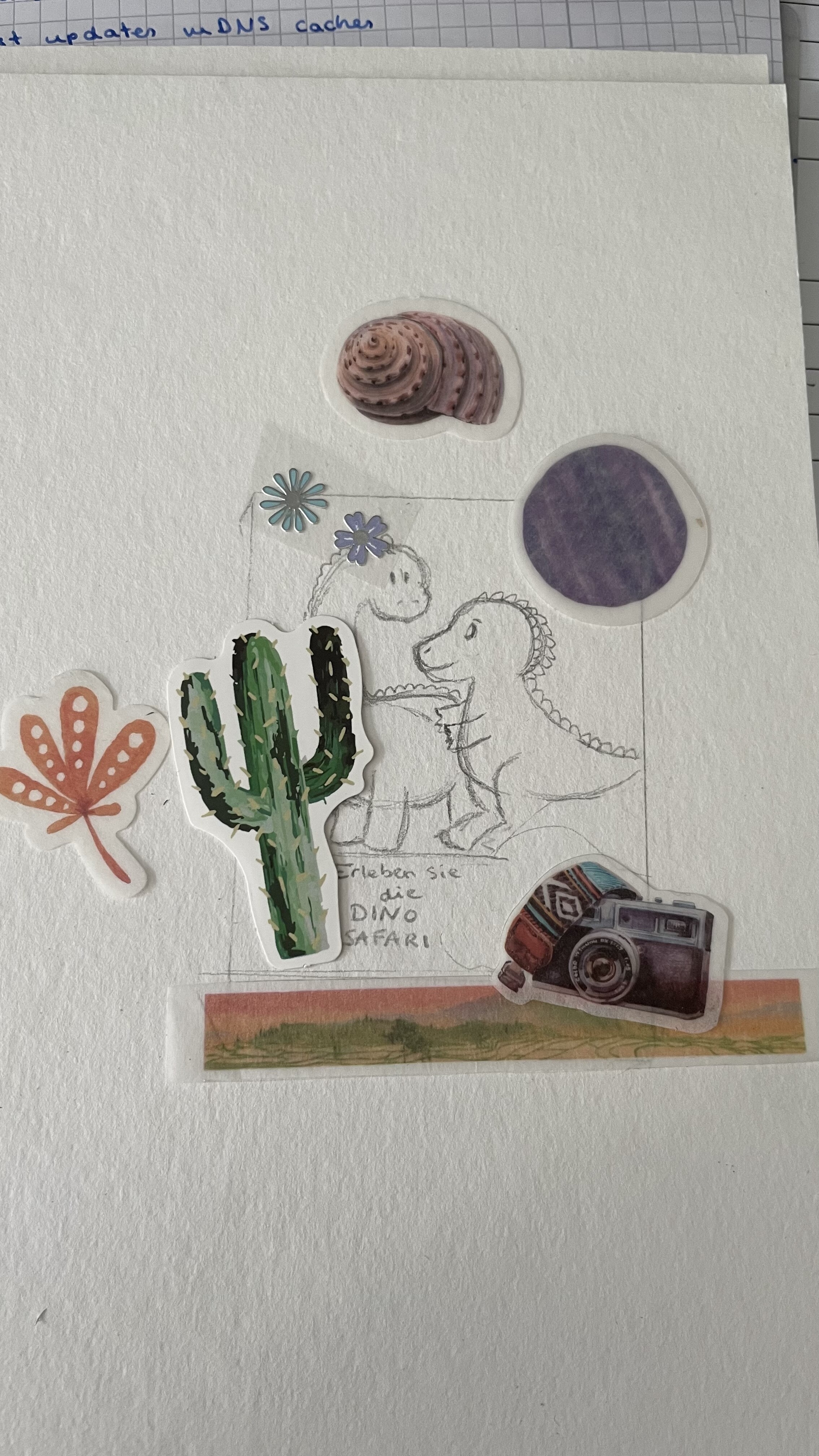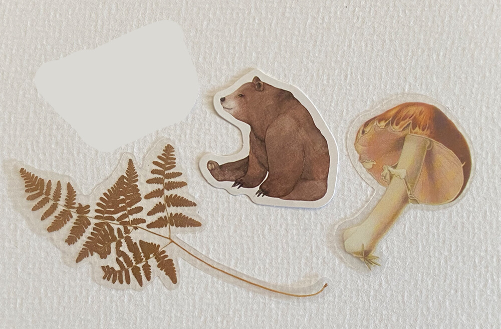 Jedenfalls, da ich ein hübsches altmodisches Schloss und ein Lagerfeuer unter meinen Stickern hatte, wollte ich daraus gerne eine Szene mit Hauch von Fantasy machen. Der dritte Sticker war mal ein grün gemusterter Wal, aber ich habe ihn zerschnitten und stattdessen den Rock der Dame daraus gemacht.