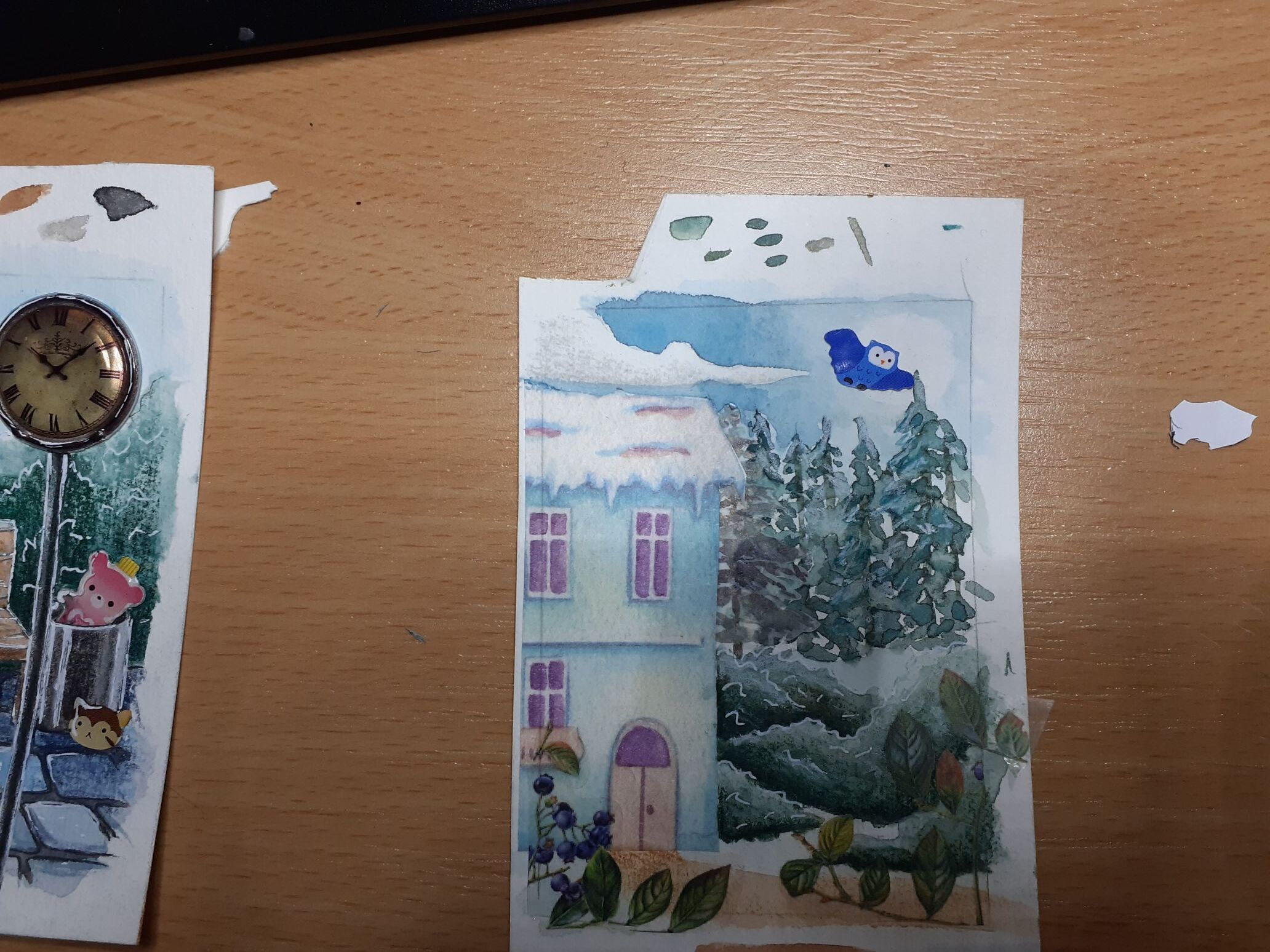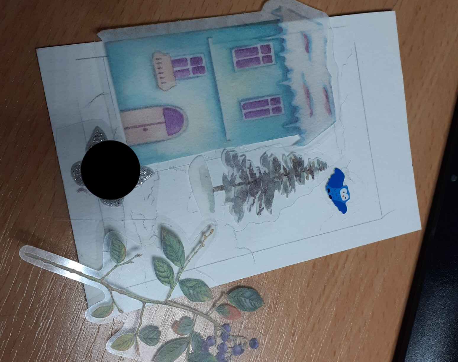 Und ich hatte gleich zweimal lila Eulen, von unterschiedlichen Stickerbögen! Das fand ich so skurril, dass ich damit auch gleich was machen musste. Die großen Blätter im HG waren einmal ein Salat-Sticker… Und die Flügel des Wolpertingers sind Flausche-Watte-Sticker. :)