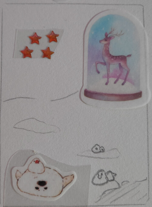 Das Reh würde ich aus der Kugel befreien, den Himmel in hellblau/rosa färben und die Sterne anständig darauf verteilen. Eventuell noch mehr kleine Eisvögelchen :D ?