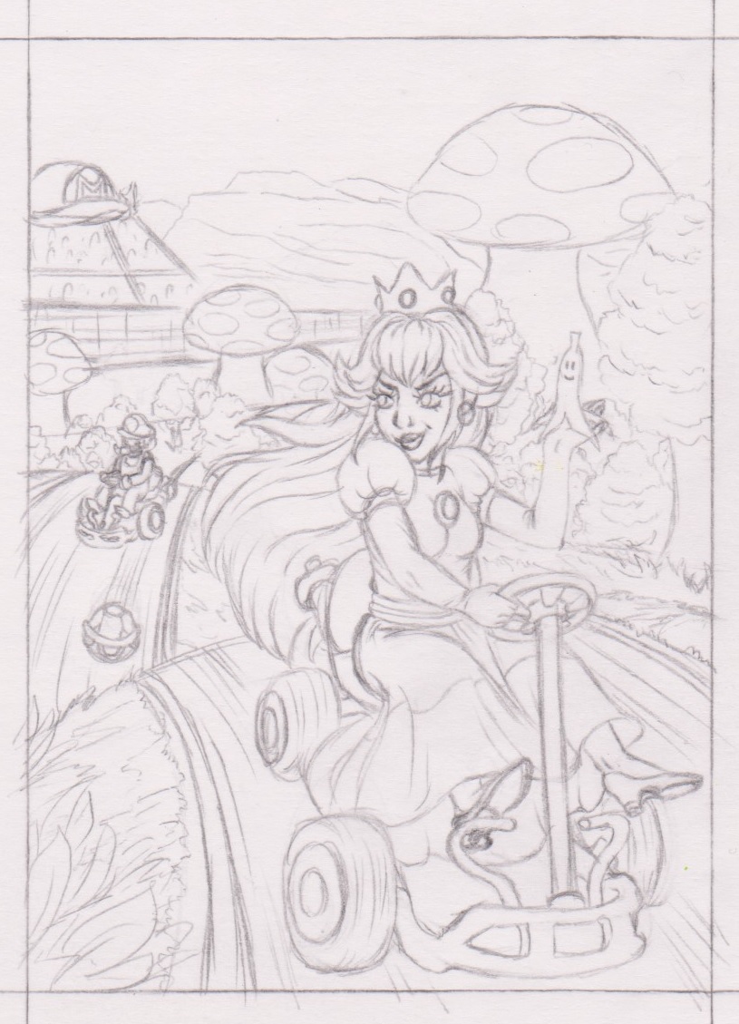 Peach und Mario aus Mario Kart 64 (der Fokus soll aber auf Peach liegen). Die Rennstrecke ist ebenfalls aus Mario Kart 64 und soll Marios Piste darstellen, weil ich die persönlich von allen Rennstrecken aus dem Spiel am liebsten mag ^^. Mario hat einen roten Panzer auf Peach losgelassen, aber Peach hat zur Verteidigung schon eine Bananenschale parat ;).