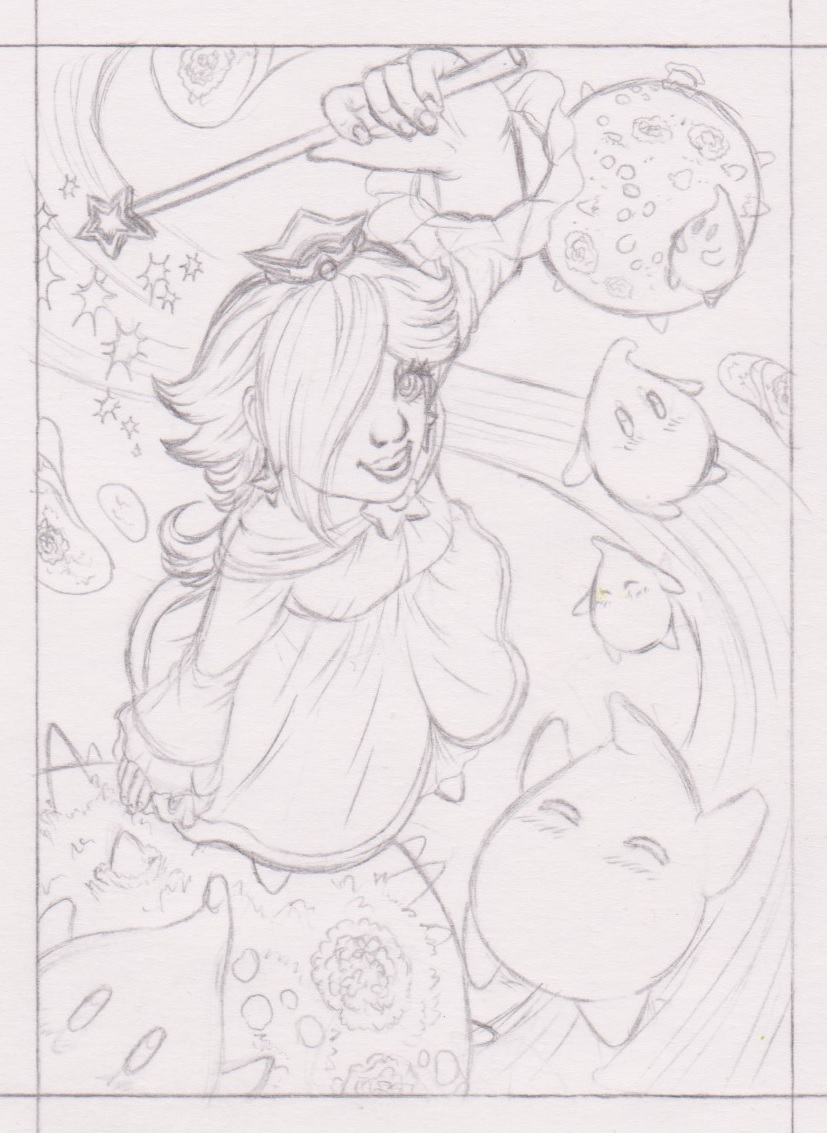 Rosalina schwebt zusammen mit den Lumas im All. Beim Hintergrund, wo noch nichts gezeichnet wurde, wollte ich später bei der Coloration die Details einfügen.