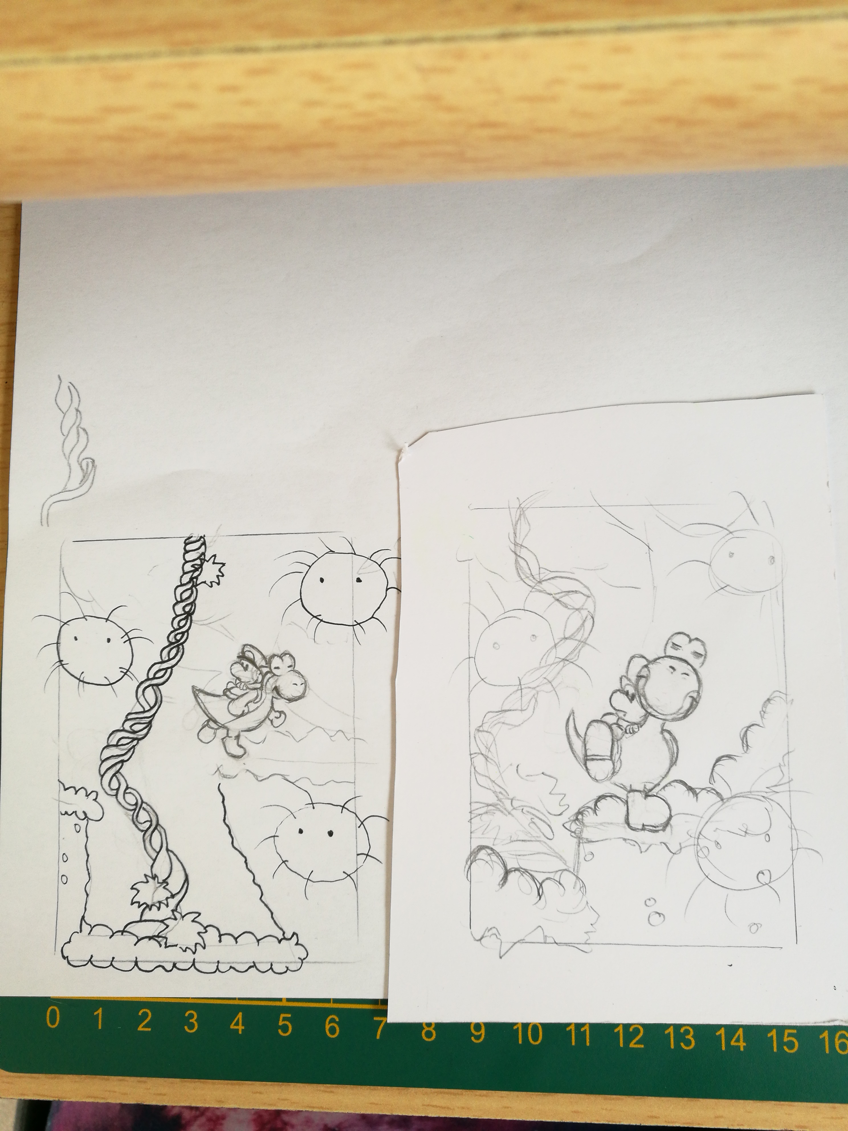 Ich würde beim übertragen auf das richtige Papier yoshi aber noch etwas mehr in Schieflage versetzen, also dass er sich quasi etwas mehr im Uhrzeiger dreht. So sieht es noch nicht ganz so taumelig aus, wie es soll :)
