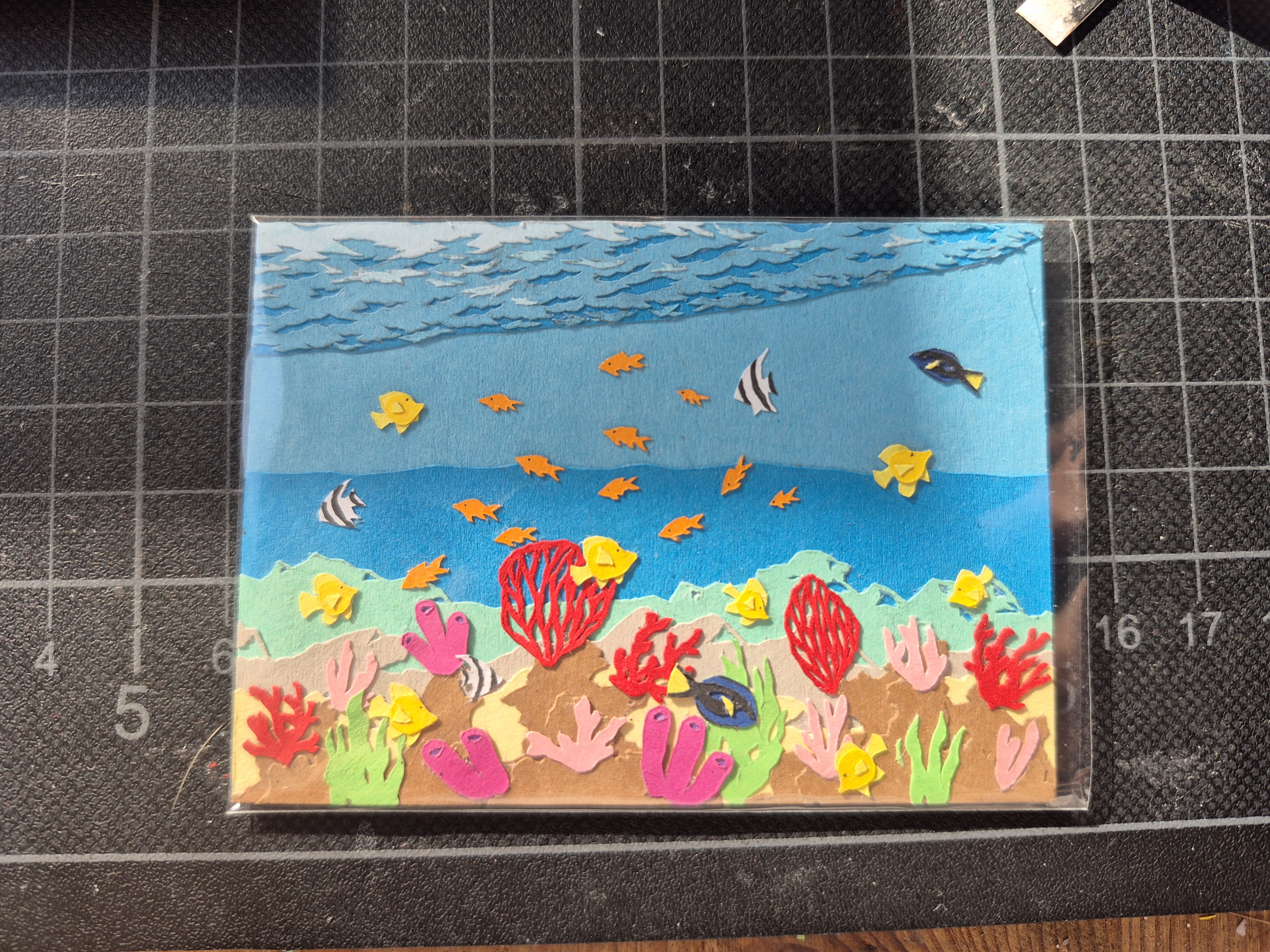 Ich war gestern Abend und heute Vormittag bis jetzt noch fleißig am Rödeln. Jetzt ist soweit alles ausgeschnippelt und war auch schon schön auf der Karte drapiert. Dann lief mein Kater an der Karte vorbei und alles ist fröhlich durcheinander gehüpft – plötzlich schwammen die Fische teilweise mit dem Bauch nach oben