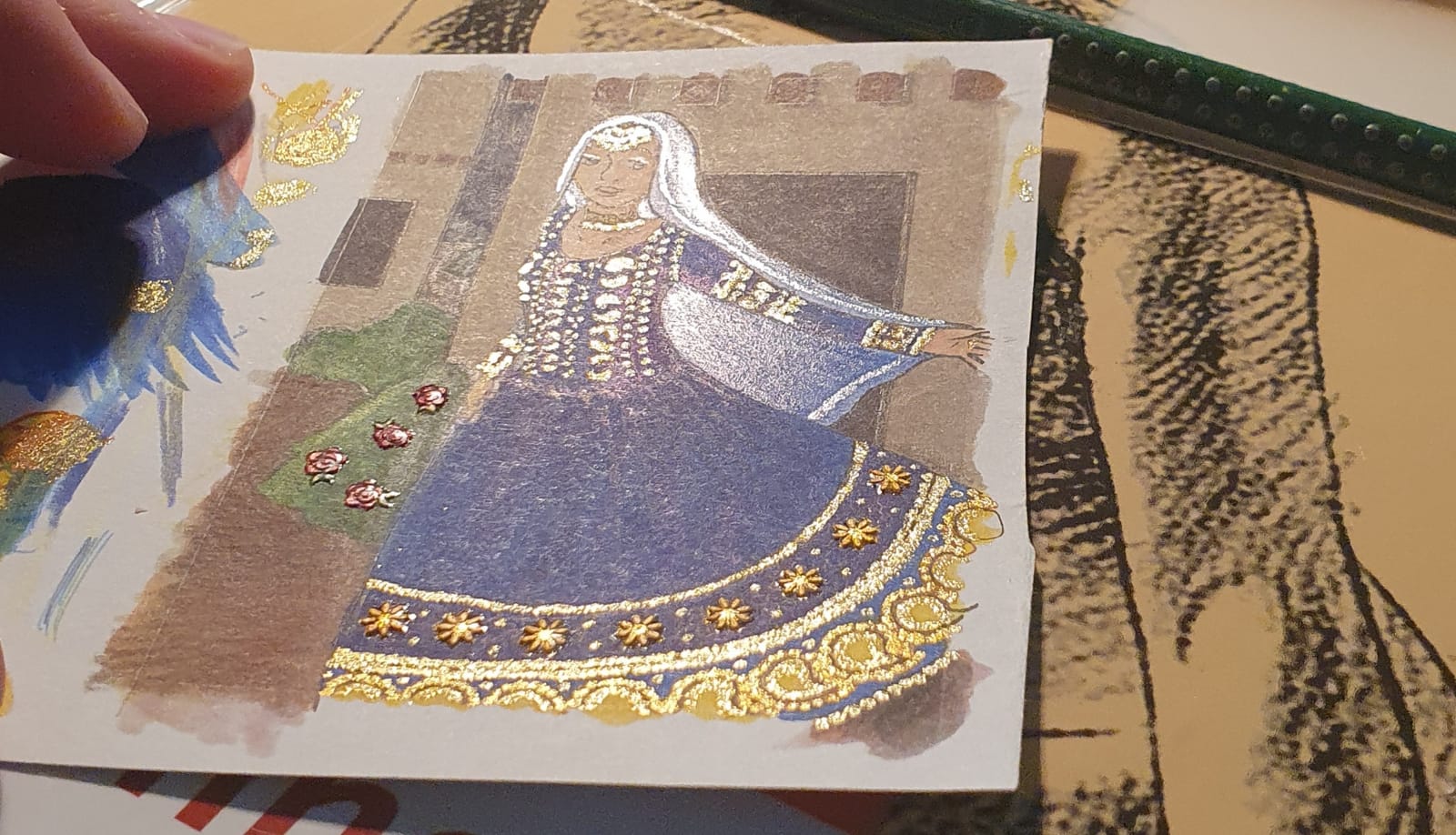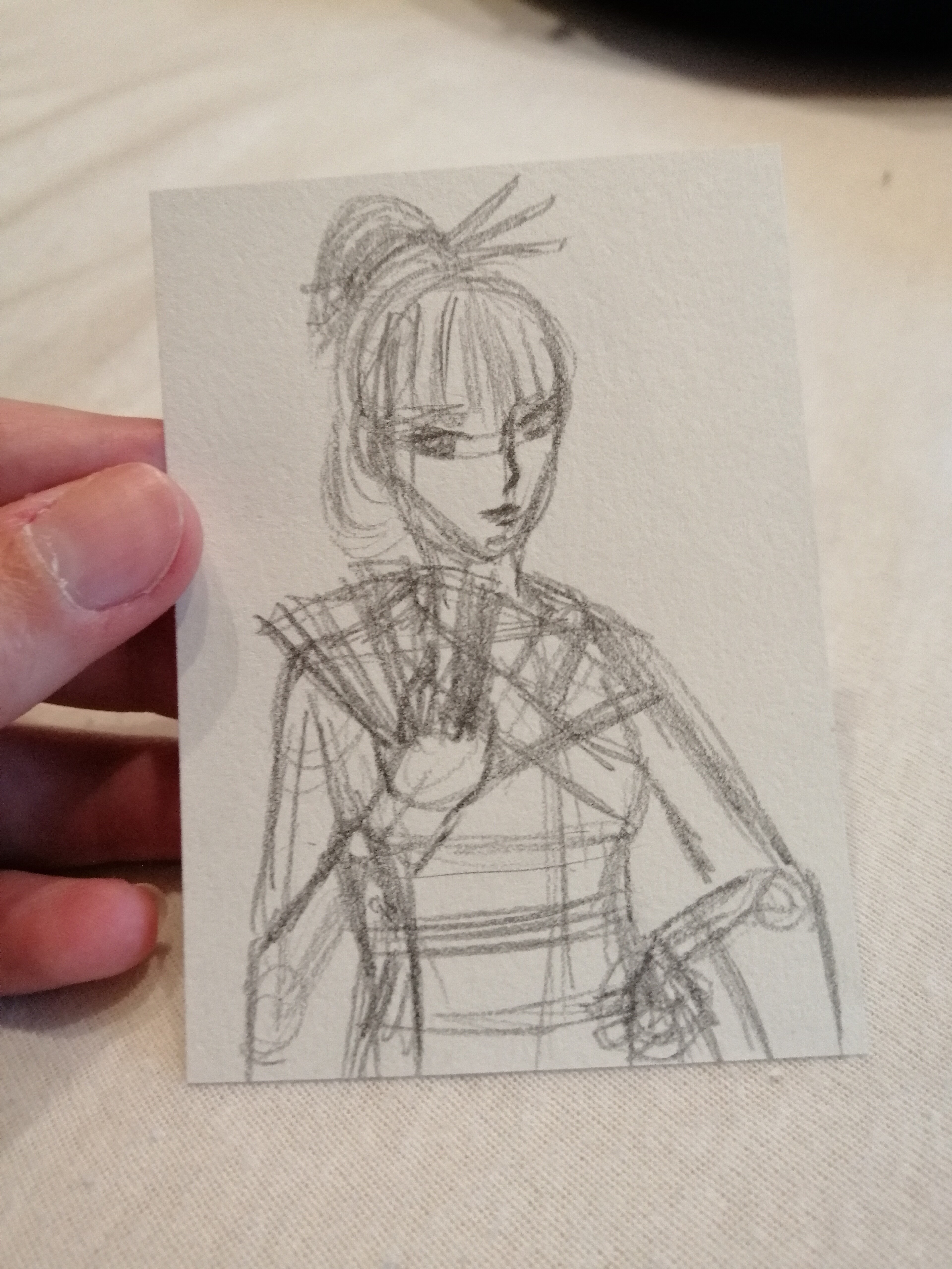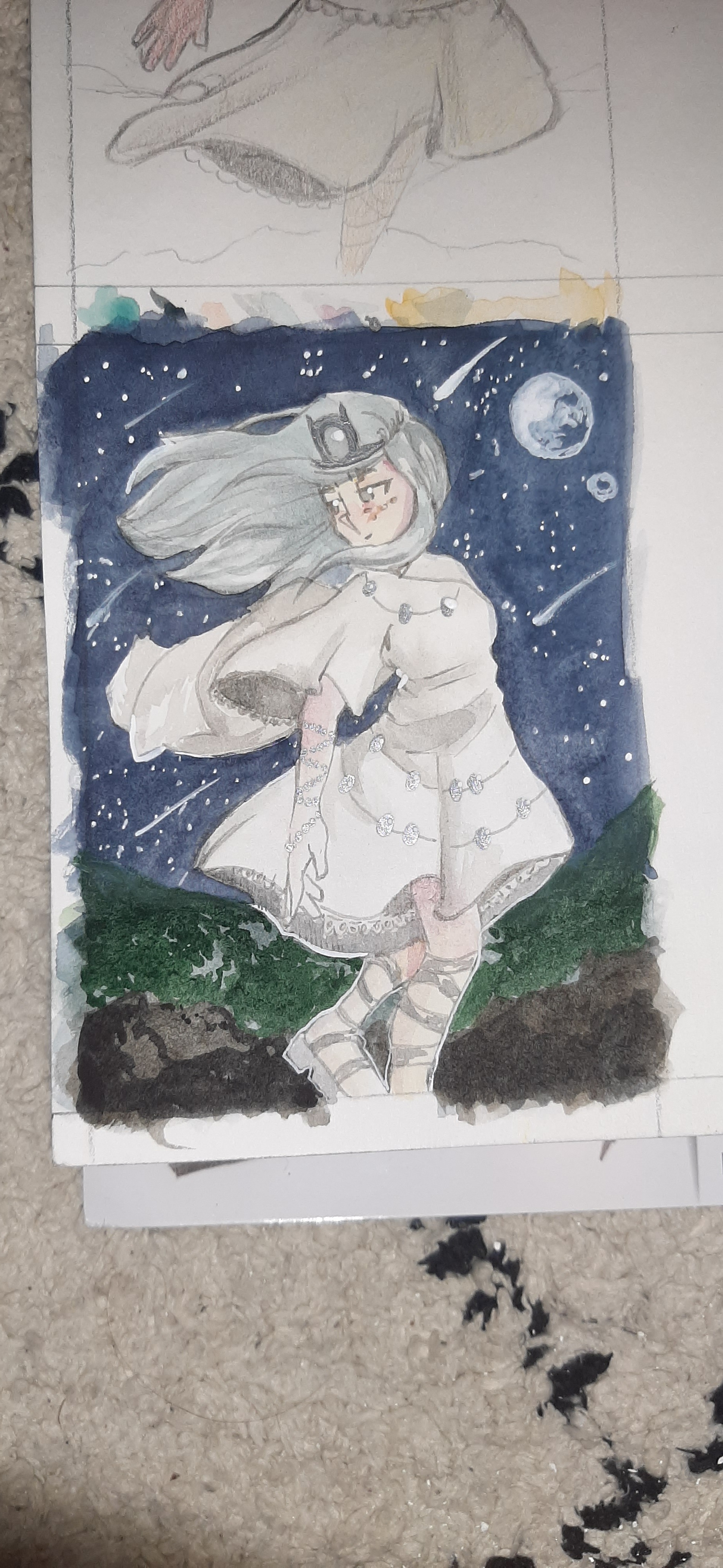 Ich habe auch meine erste Karte fertig wenn zugelassen. Das soll der Mondstein sein. Ich dachte da es so trübe aussieht gebe ich der Person einen verträumten Blick. Mein erste Skizze habe ich verworfen weil sie für mich irgendwie langweilig ist.