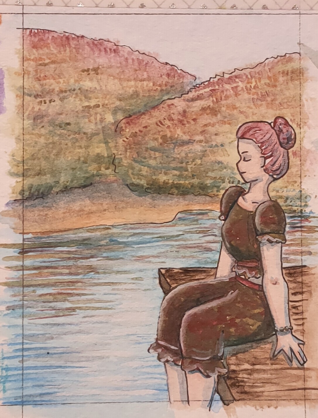 Bei dem Jaspis habe ich gelesen, dass er in der Esoterik als Heilstein angesehen wird. Daher habe ich mich für eine Heilerin entschieden, die gerade Kräuter zerstampft. Die Haare sowie das Kleid unter der Schürze sollen rötlich werden, wie die Farbe des Steines.