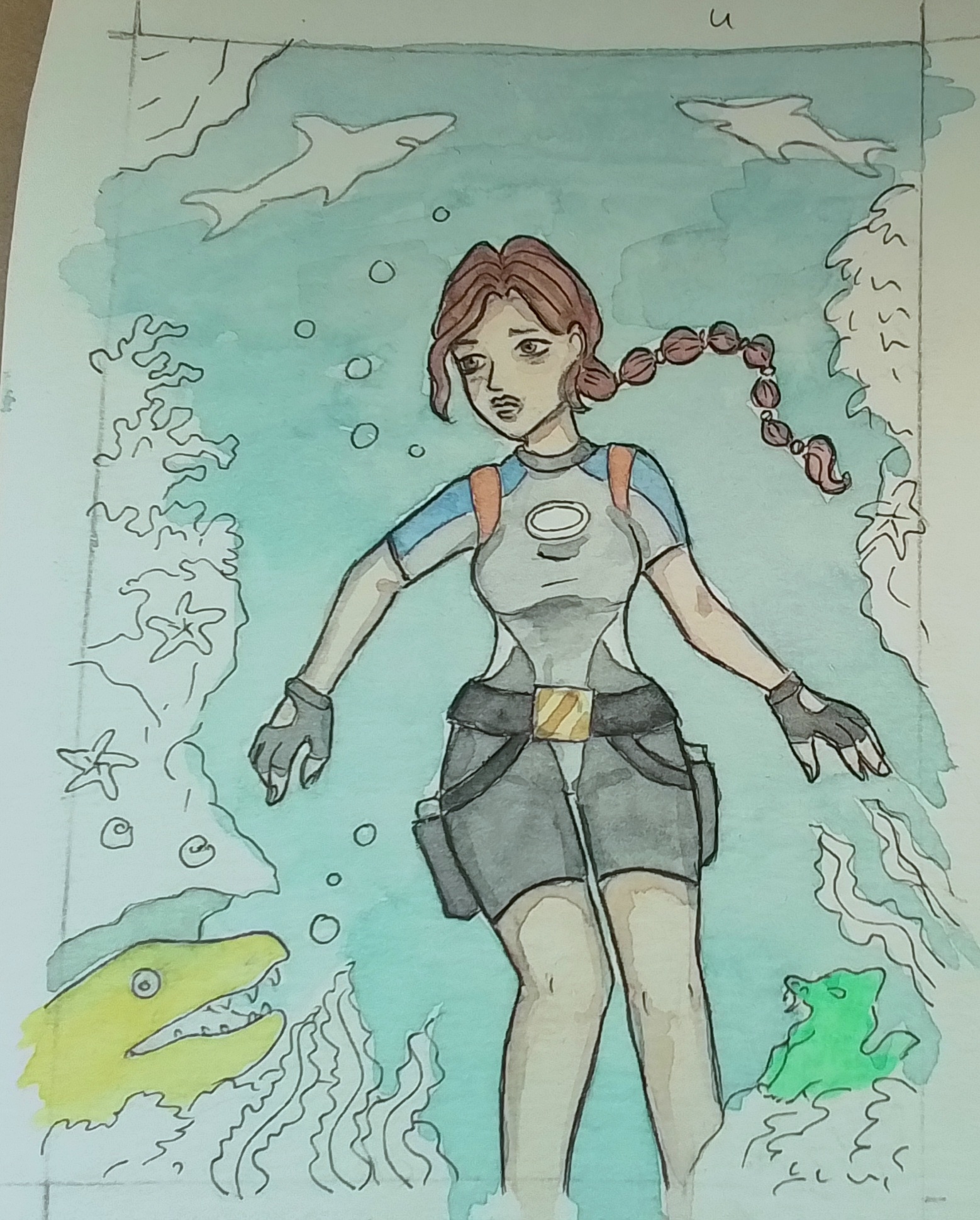 Wie man sieht, habe ich nochmal einiges verändert…unter anderem hat mich die unnatürlich verdehte Hüfte irgendwann echt gestört (zeichnerisch vor allem, weil sich der ganze Schmuck an der Kleidung immer umständlich mitdrehen musste). Die Waffe habe ich auch verändert und anstatt meines persönlichen Lieblingsdesigns aus dem Spiel, lieber den Flegel vom offiziellen Artwork genommen. Und da dem Charakter zu Beginn das Element Wasser zugeordnet ist, ist noch eine Mini Undine (Frosta, für die Fans von alten Secret of Mana ;-D) mit drauf. Die war auch in der ursprünglichen Skizze schon geplant, aber irgendwie habs ichs vergessen.