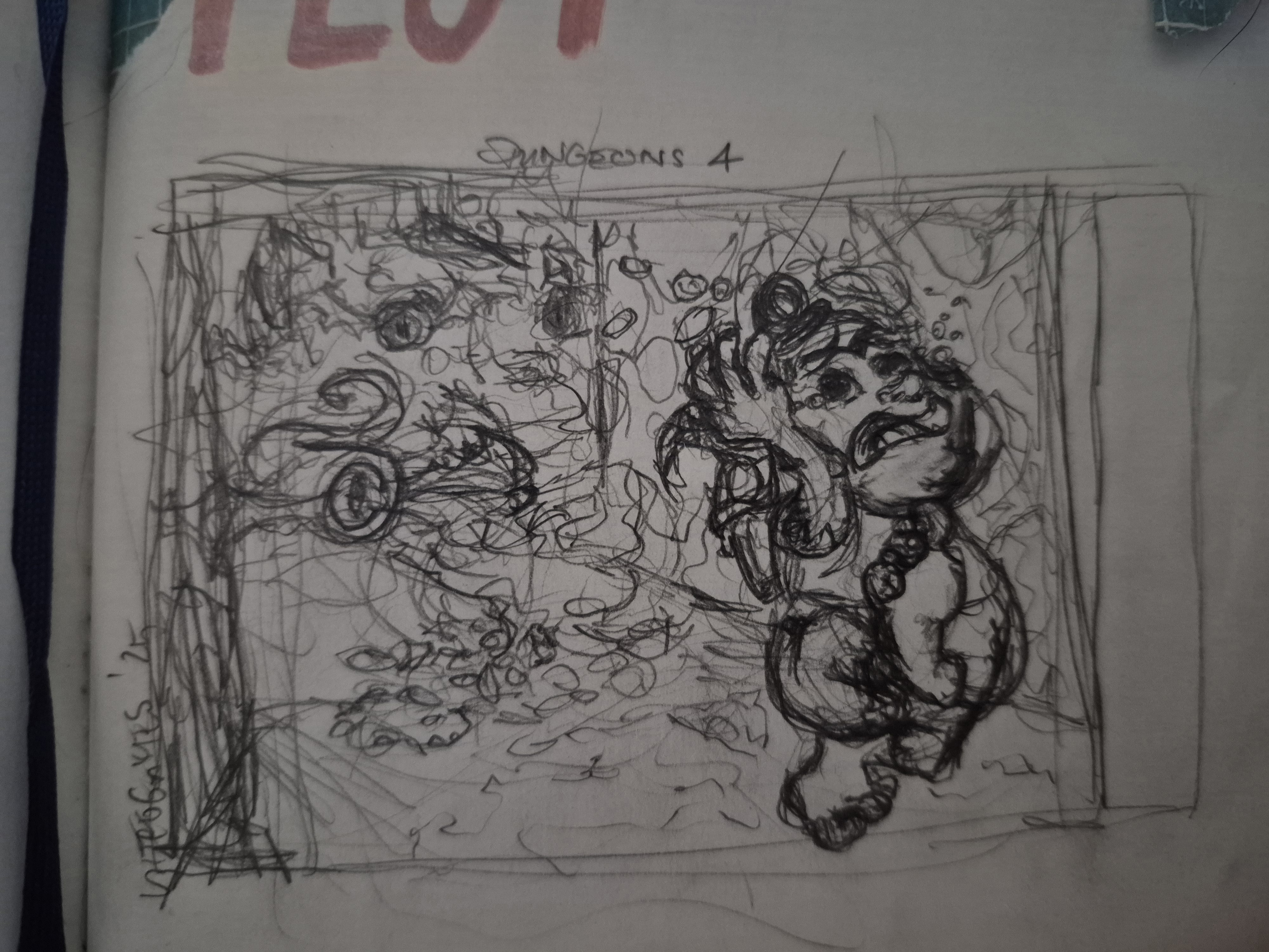 So. Farbroulette ist fertig, jetzt kann ich mich hier austoben. Ich hab die erste Skizze zu Dungeons 4 nochmal etwas mehr ausgearbeitet und endlich eine halbwegs vernünftige Kompositon für die Supraland-Karte hinbekommen. Da fehlt noch Hintergrund (will ich morgen in beiden Spielen nochmal Details gucken)